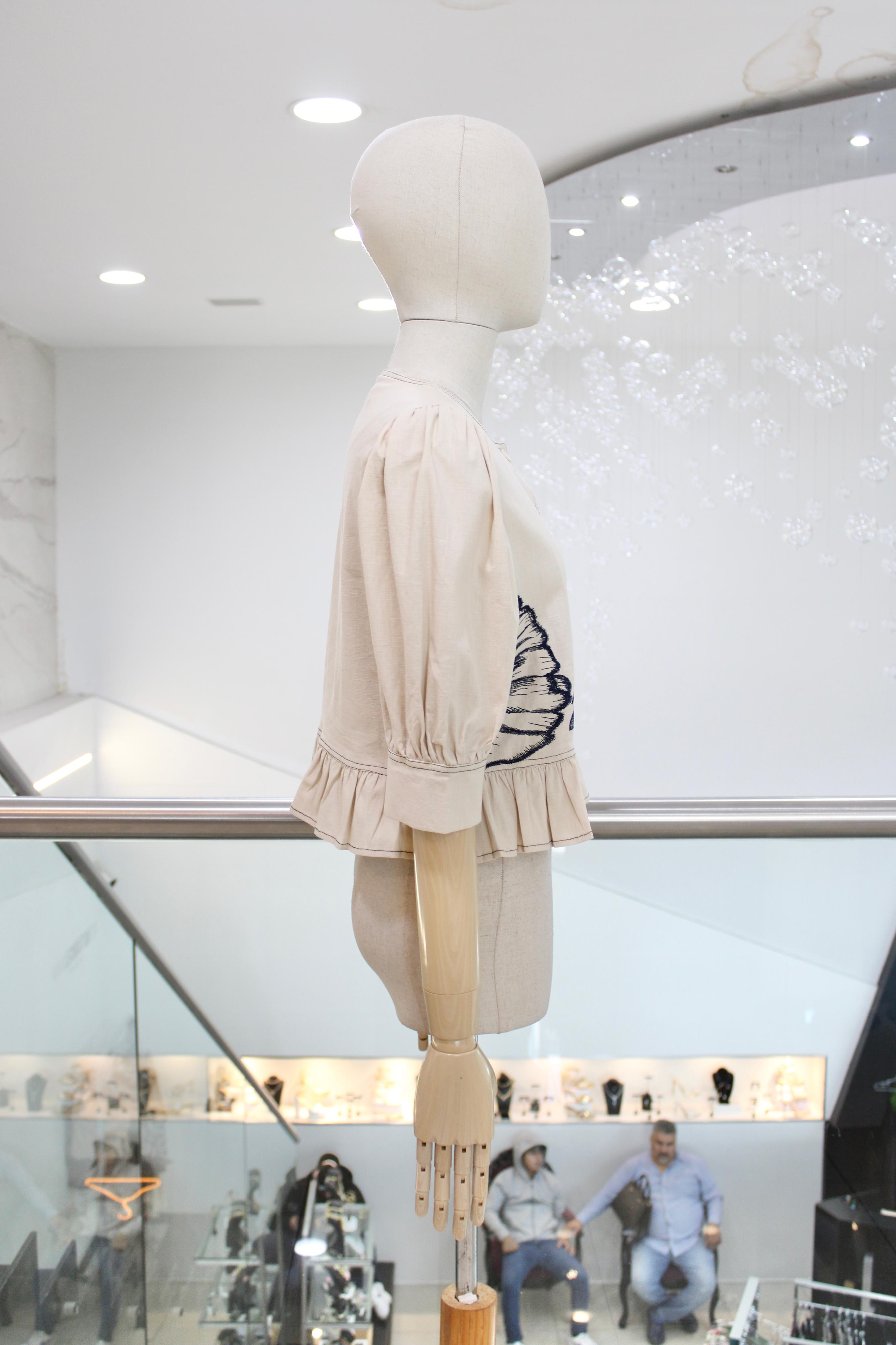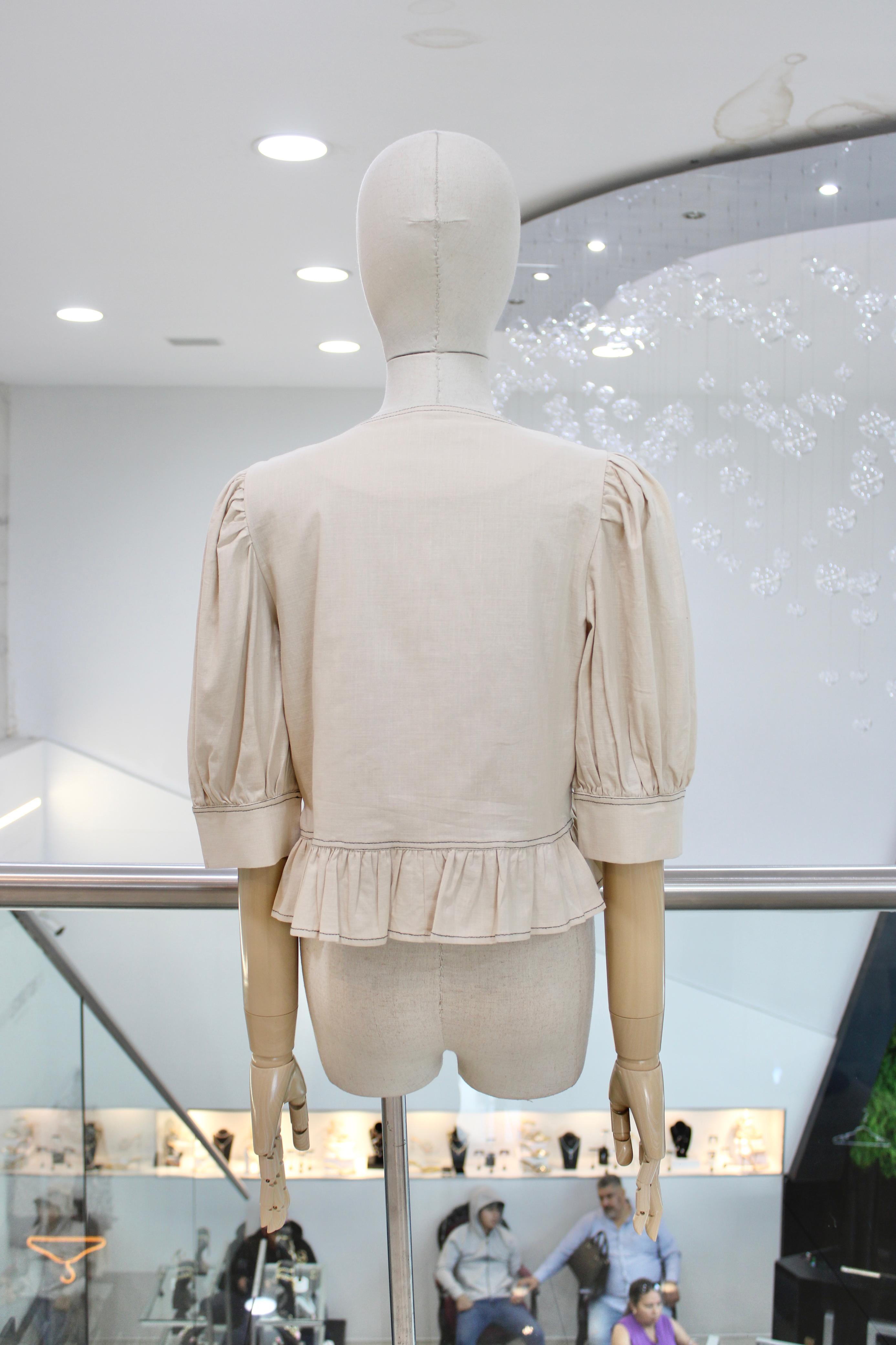 Blusa beige de manga 3/4 con terminación en escarola y flor bordada azul.