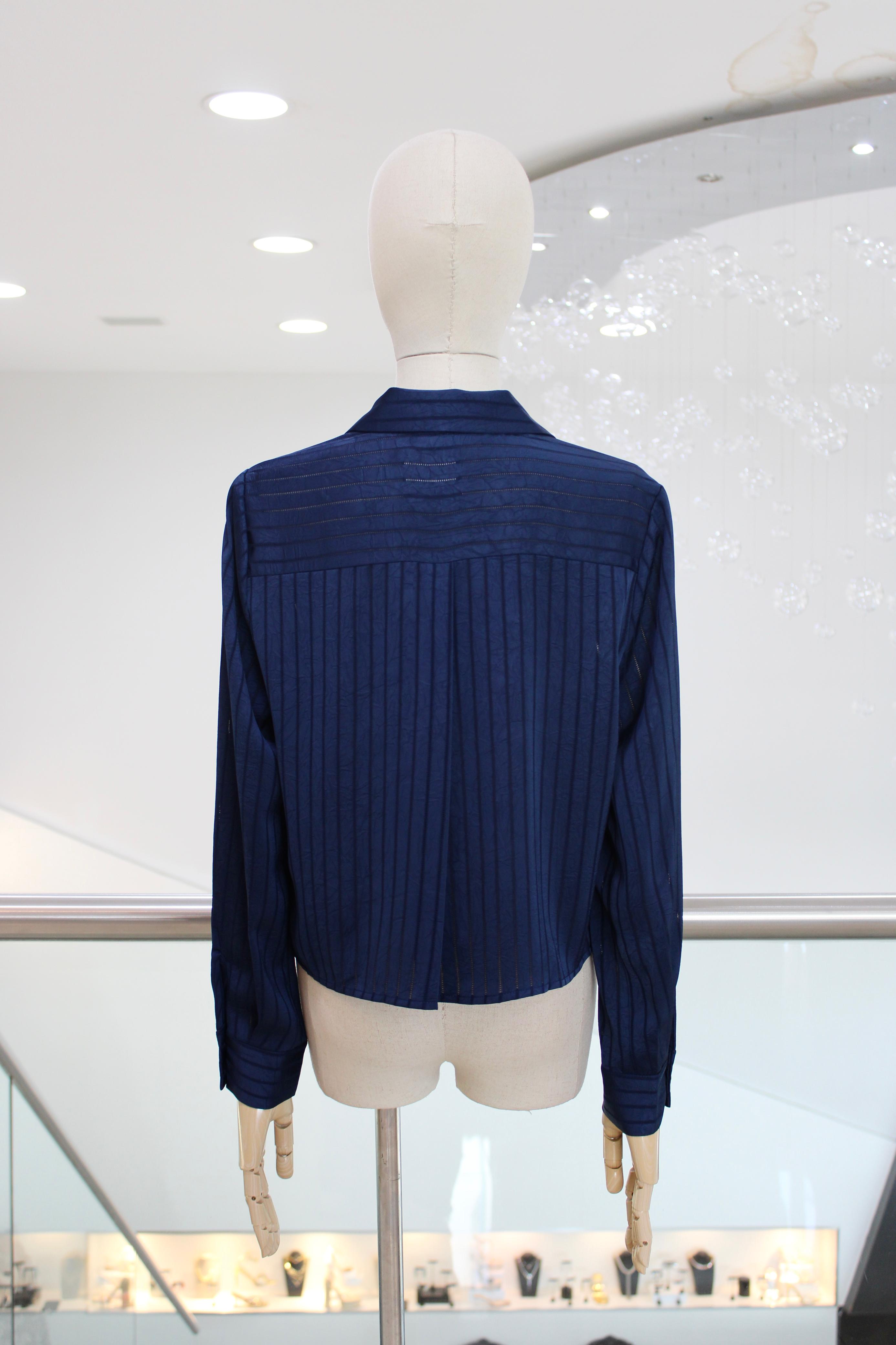 Camisa crop de manga larga azul con rayas verticales y bolsillo al frente.