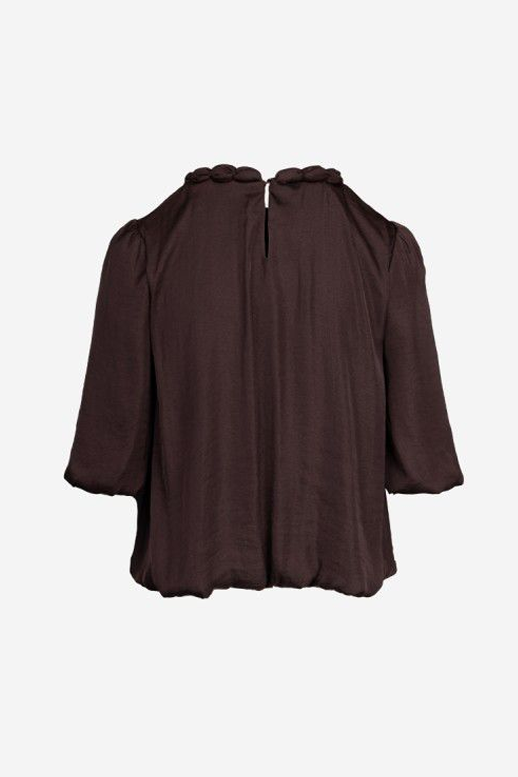 Blusa chocolate de manga 3/4 con elástico en la parte inferior y detalle de bolitas en cuello.