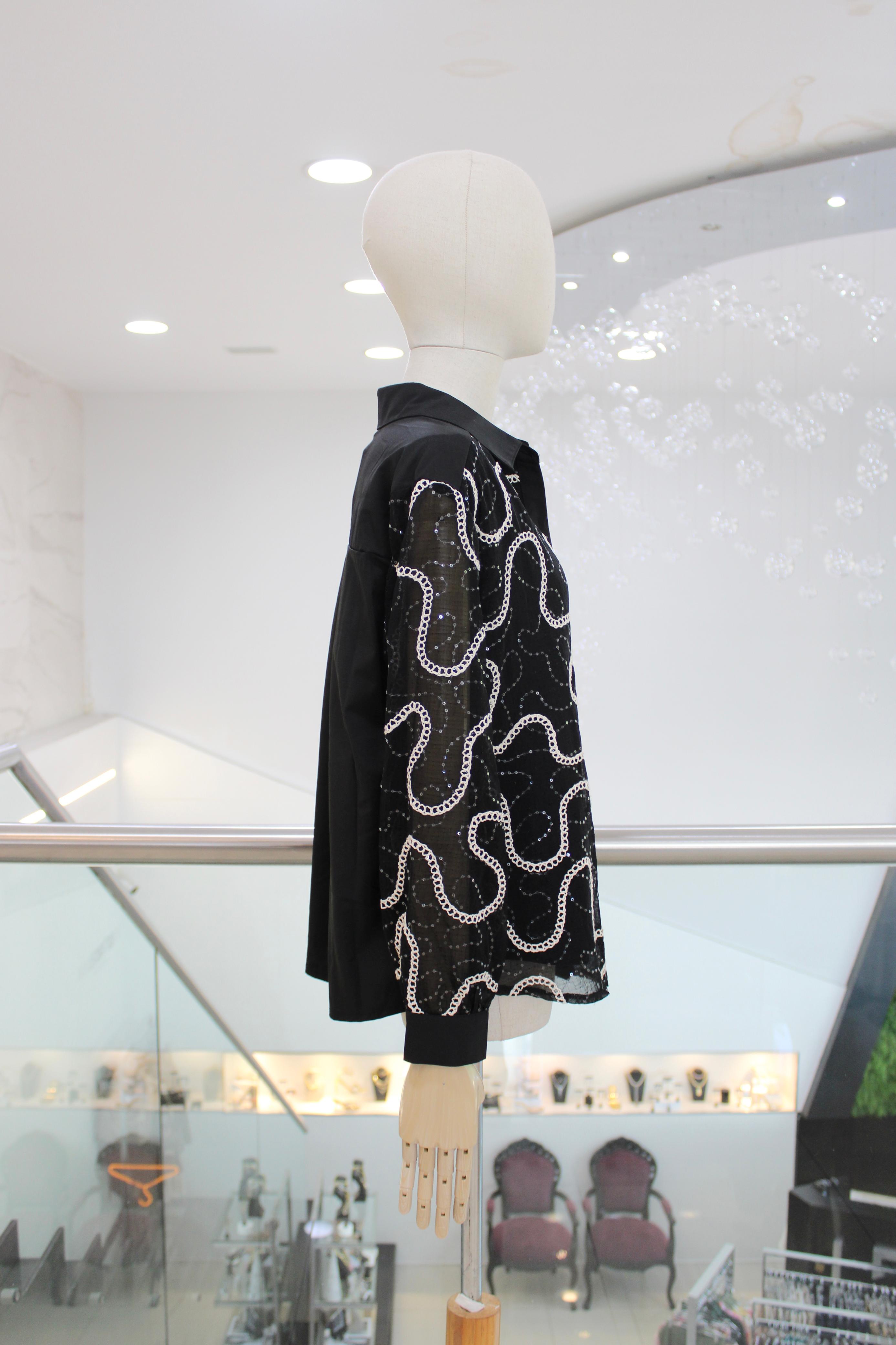 Camisa de manga larga negra con aplicaciones de lentejuelas blancas y negras de forma abstracta.