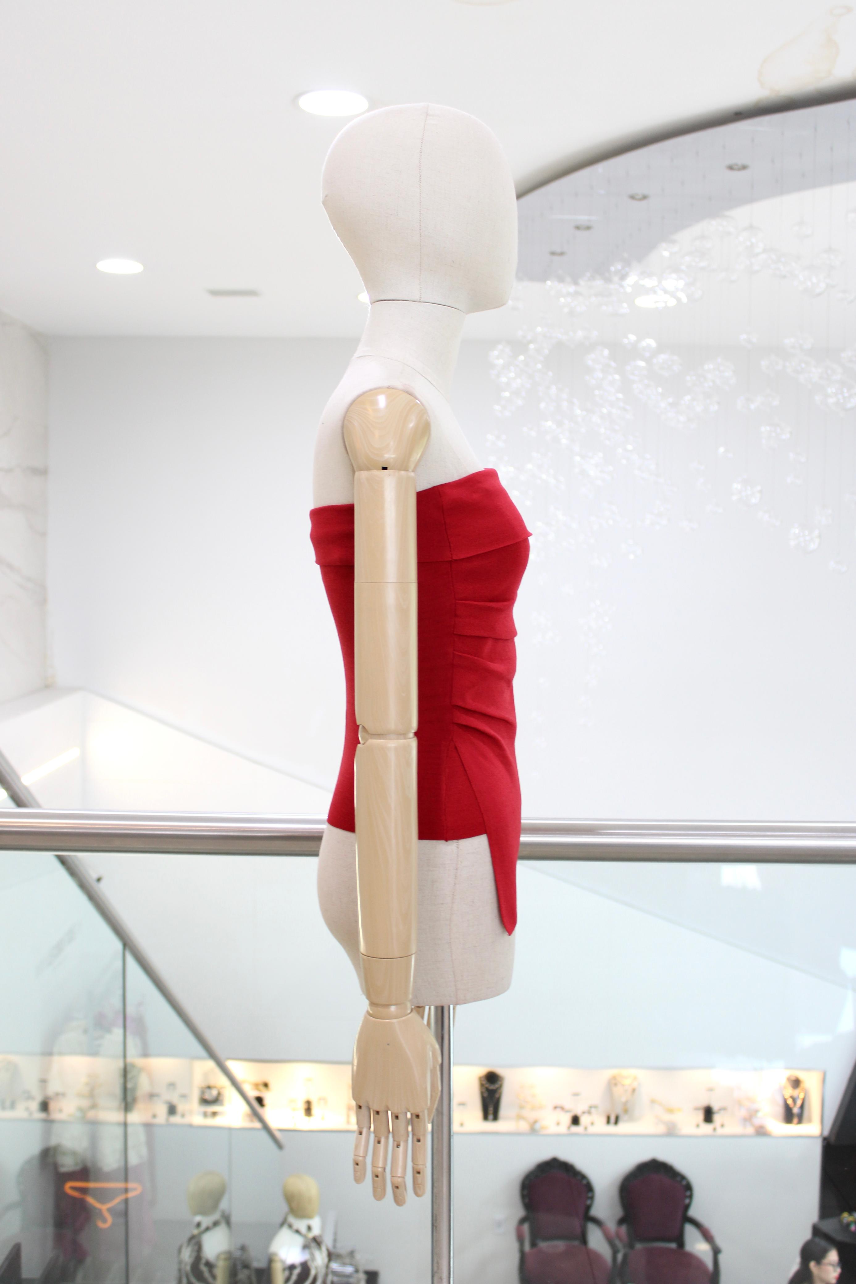 Top strapless rojo en suave tela con spandex, terminación asimétrica y drapeado a un costado en cintura.