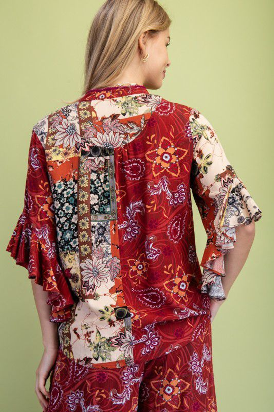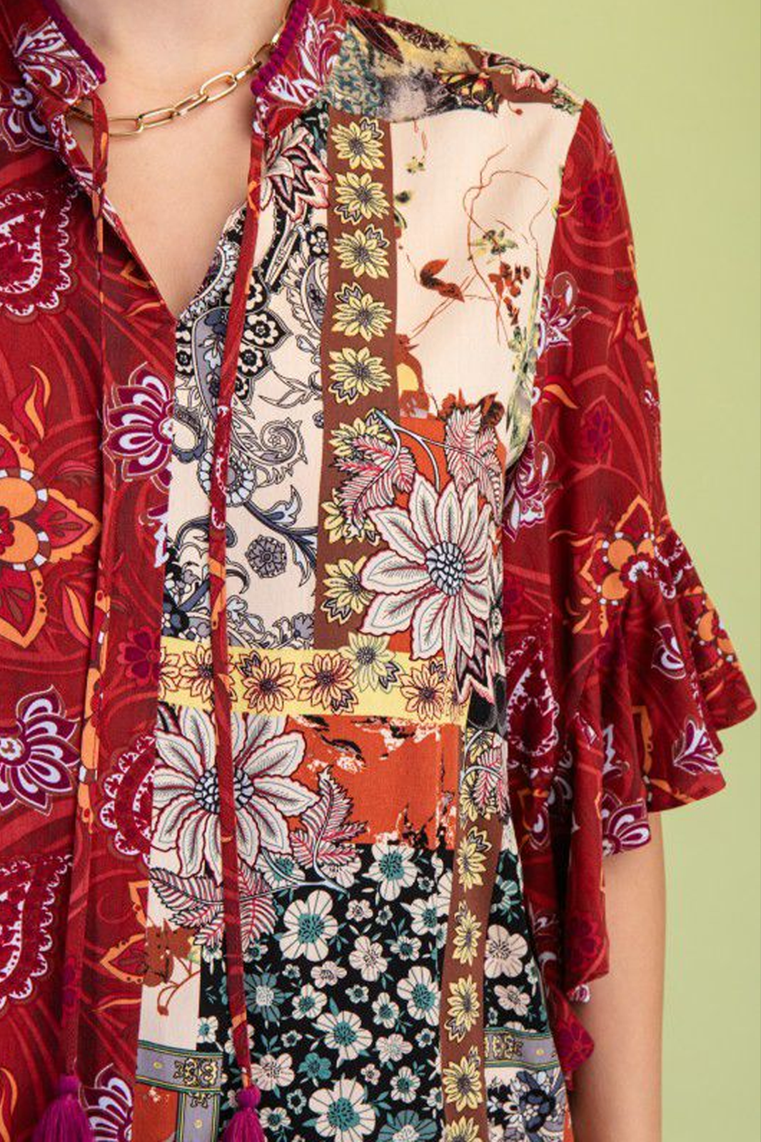 Blusa fluida vino con estampado multi, de manga 3/4 con terminación en volante y lazo en cuello con borlas.