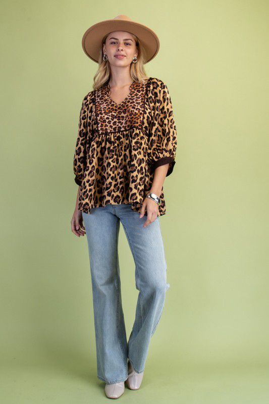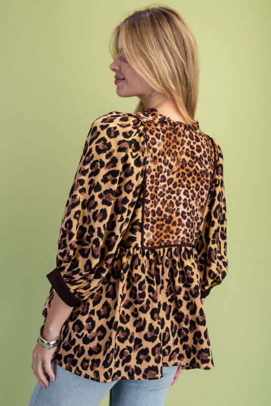 Blusa amplia de animal print cheetah con manga 3/4 ligeramente abullonada.
