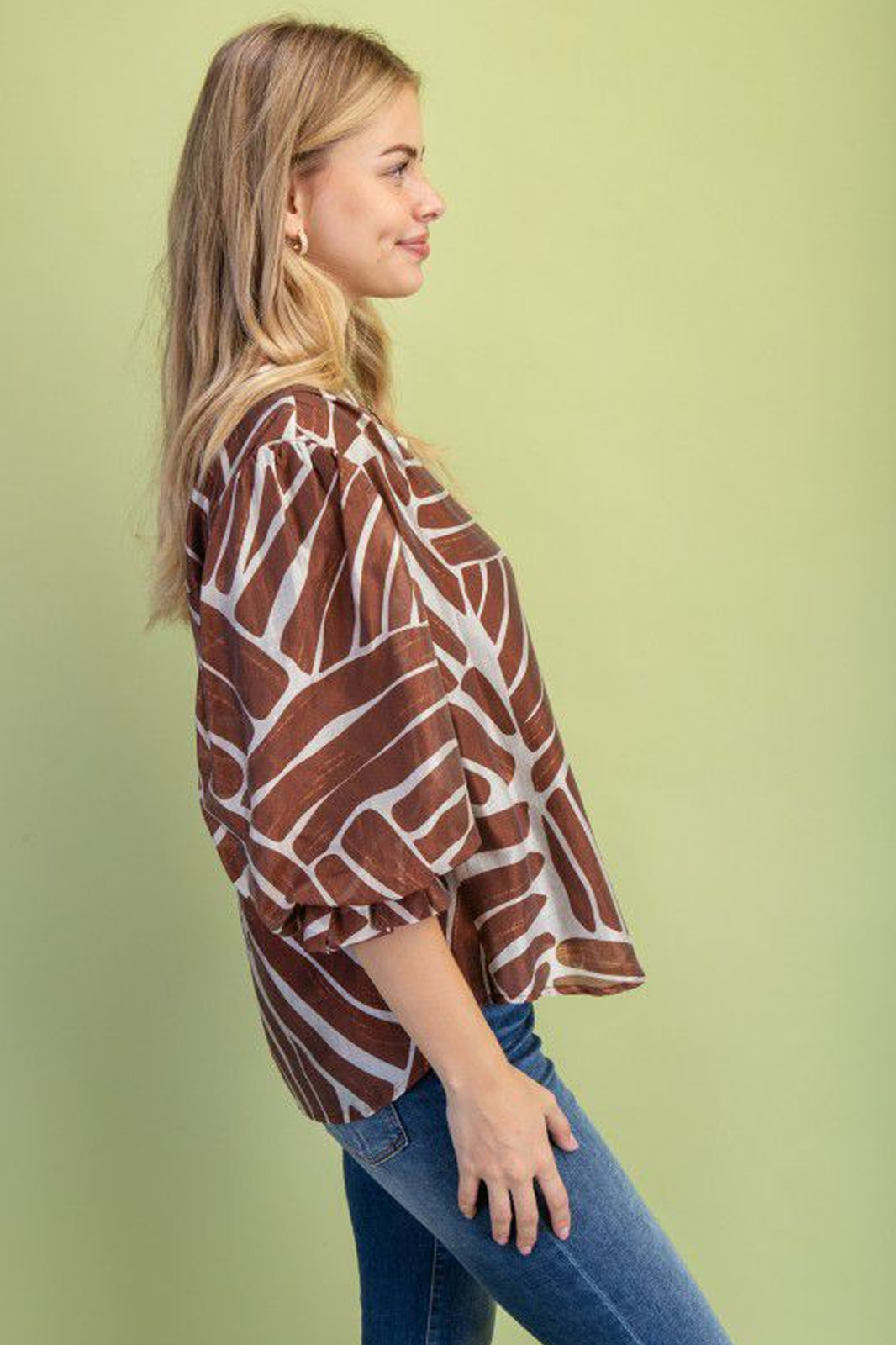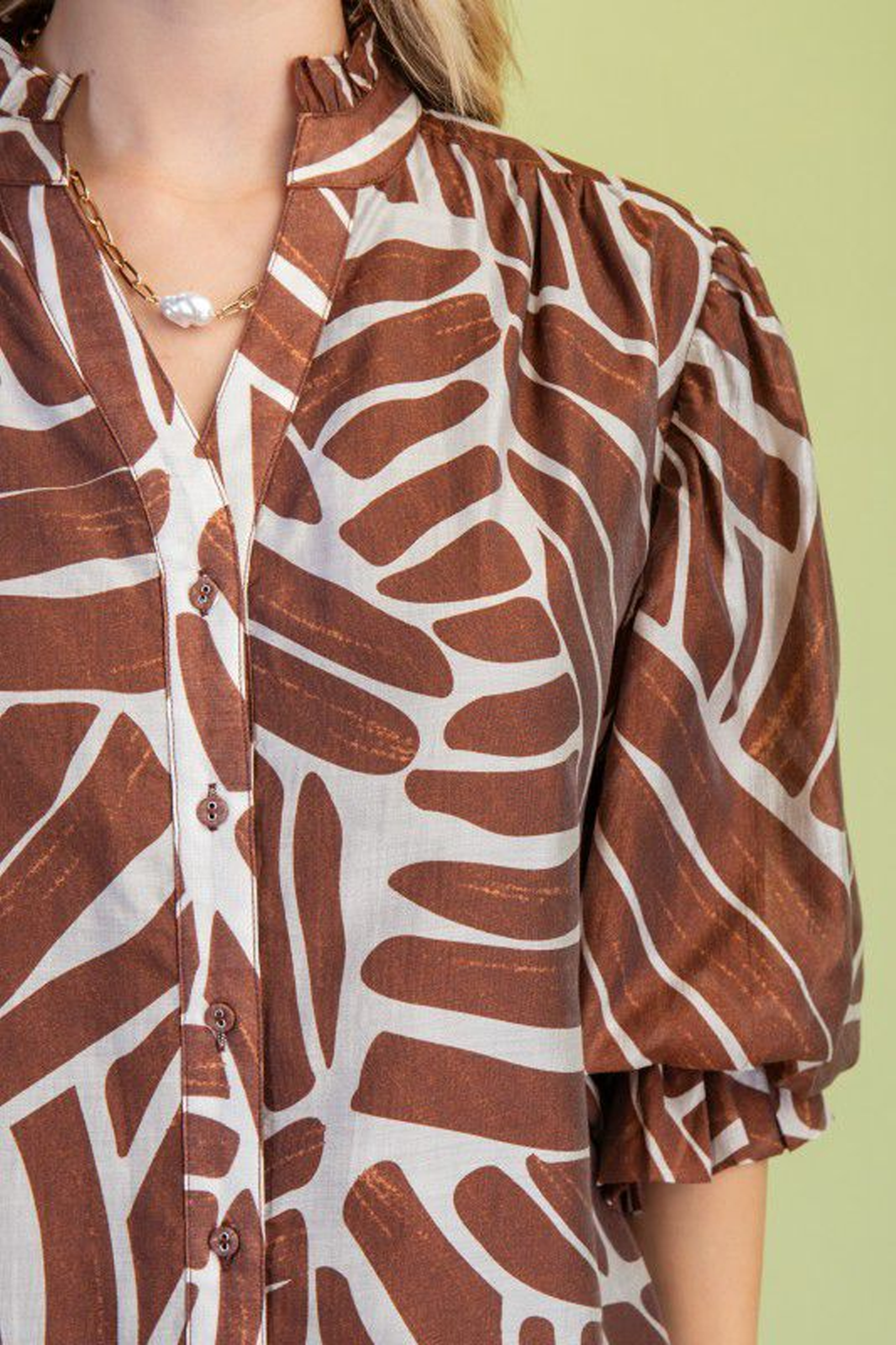 Blusa camisera con estampado abstracto café, tiene escote en V y manga 3/4 abullonada.