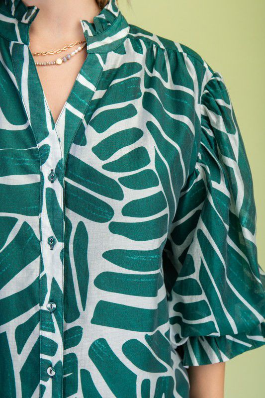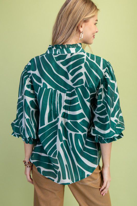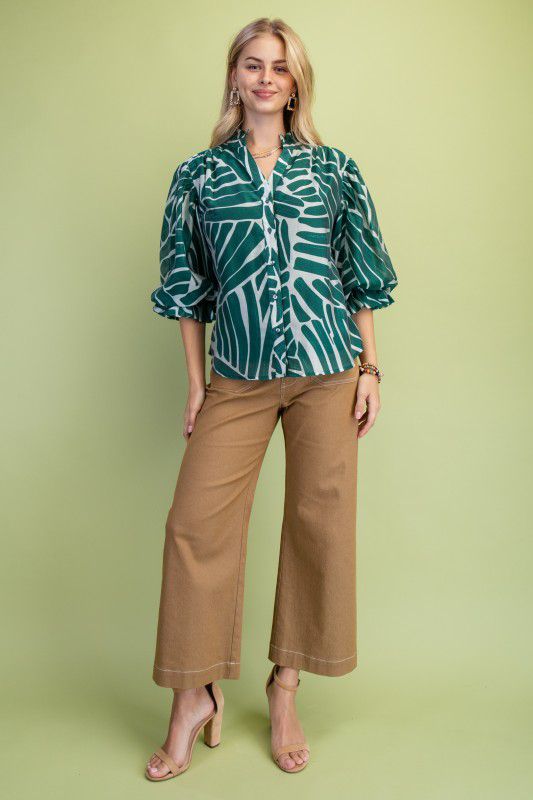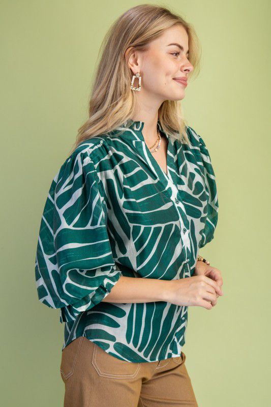 Blusa estilo camisera en suave tela beige con print abstracto verde pino, de manga 3/4 con terminación en elástico.