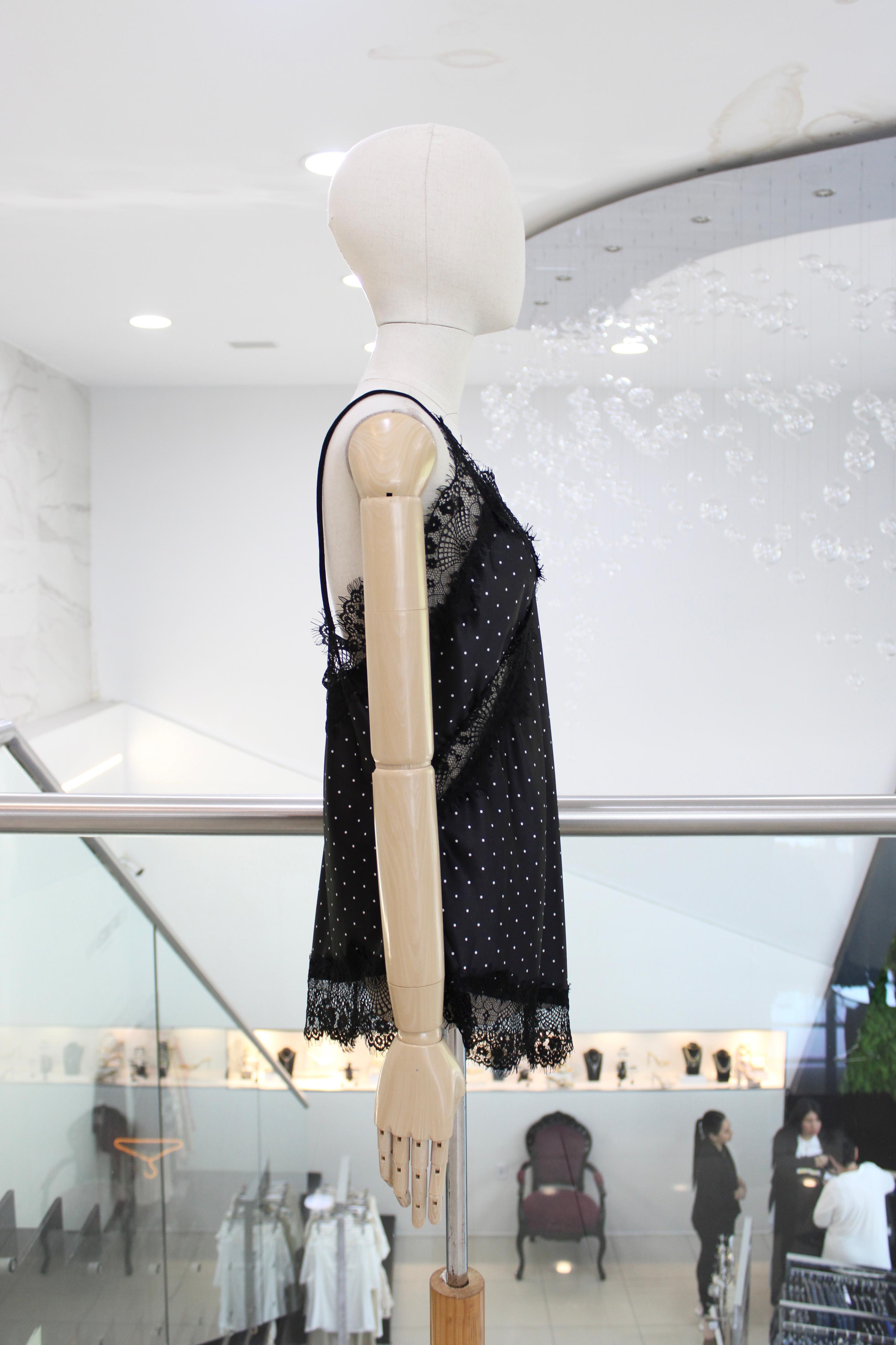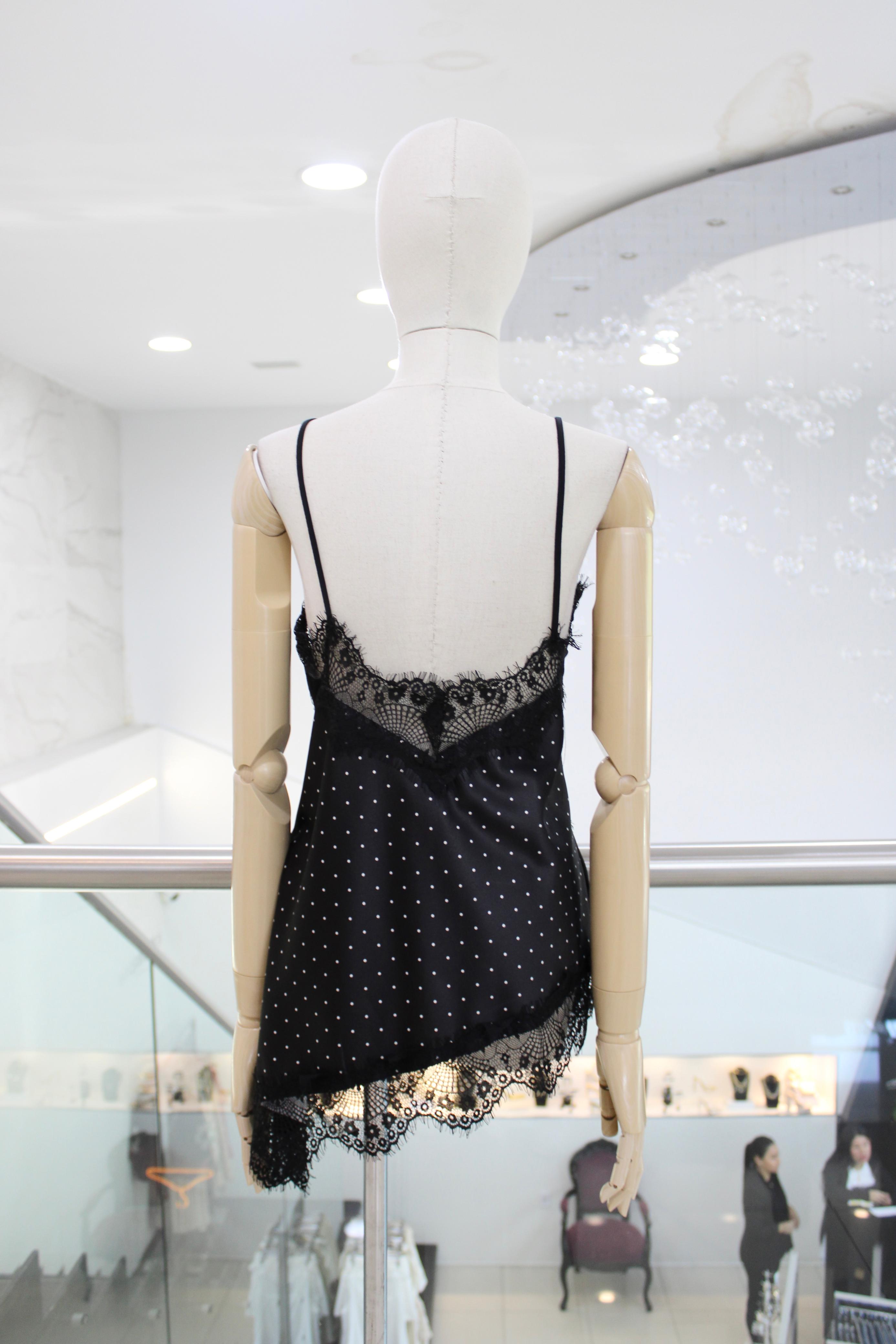 Blusa lencera en satín negra con encaje y mini polka dots blancos.
