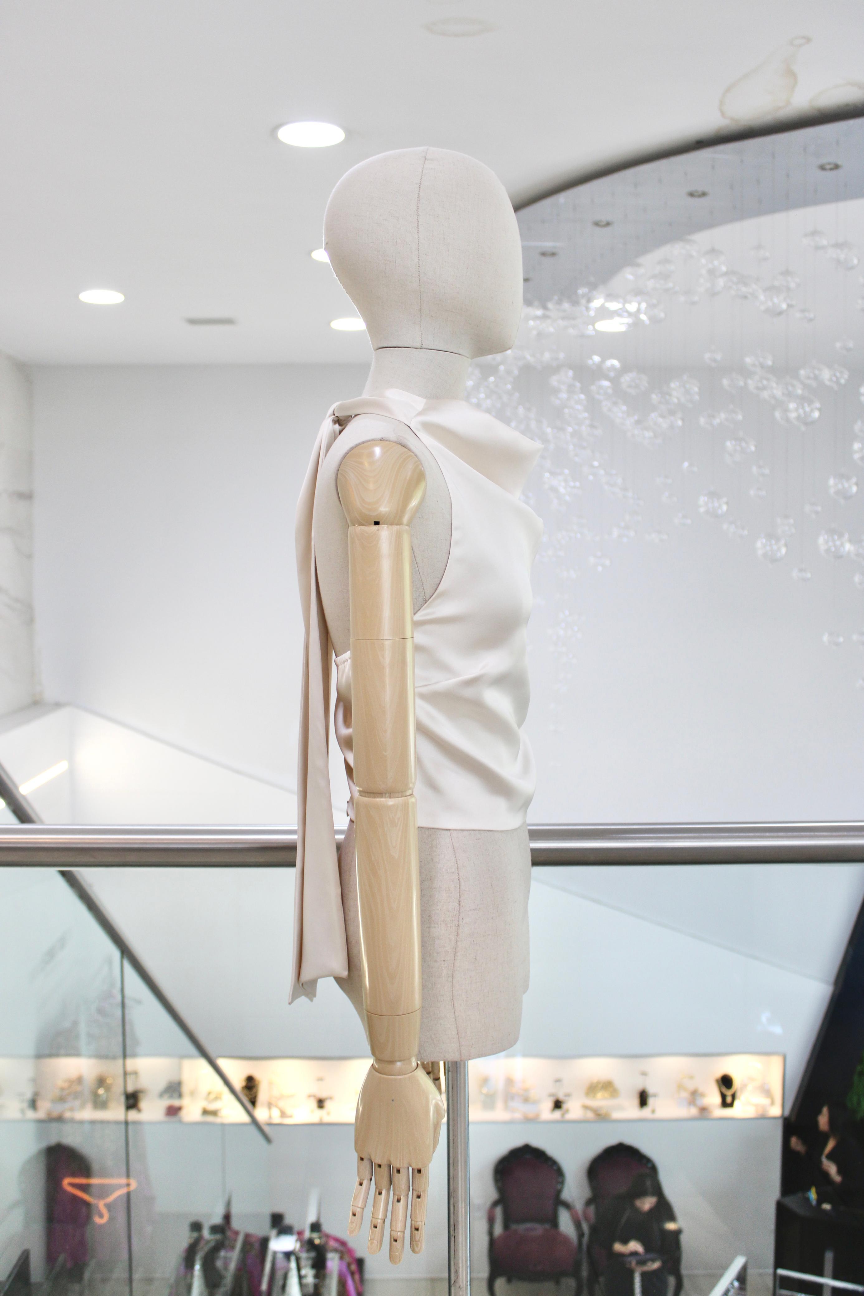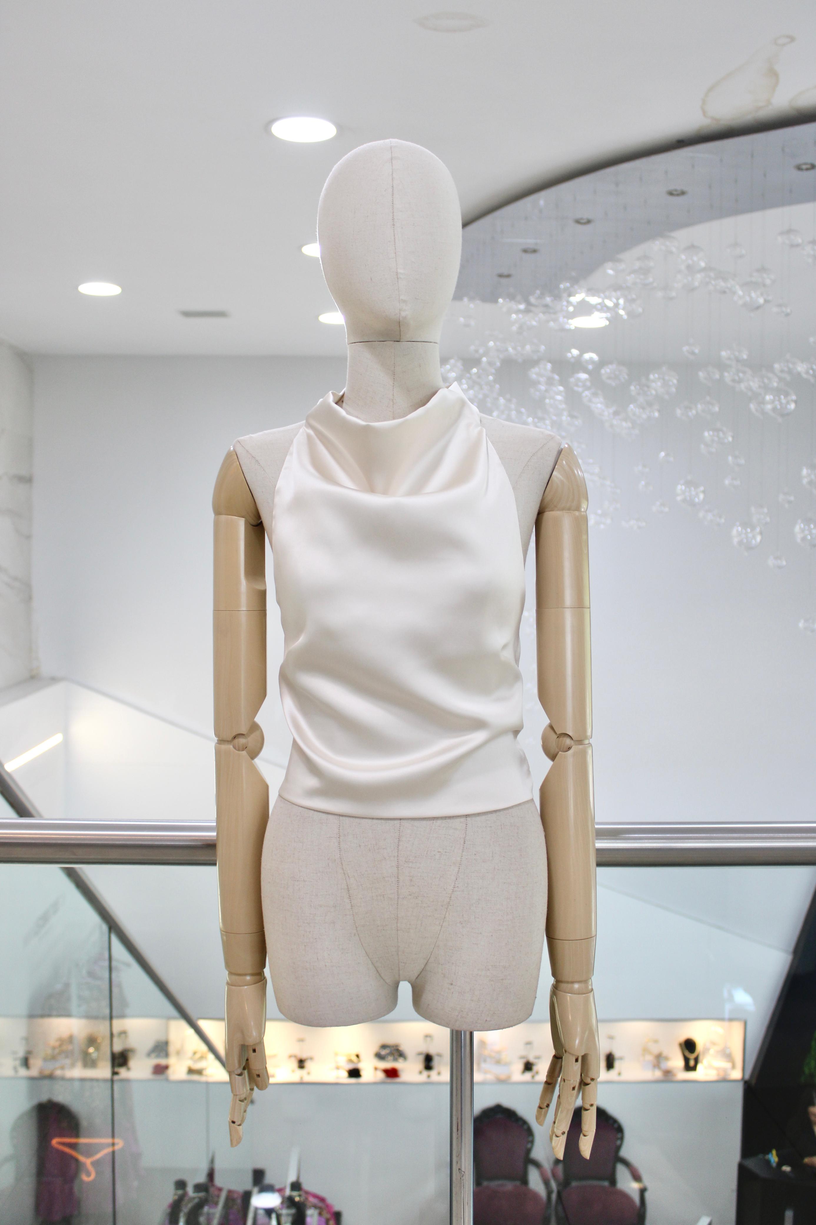 Blusa halter en satin perla con laso ajustable en cuello y escote fluido.