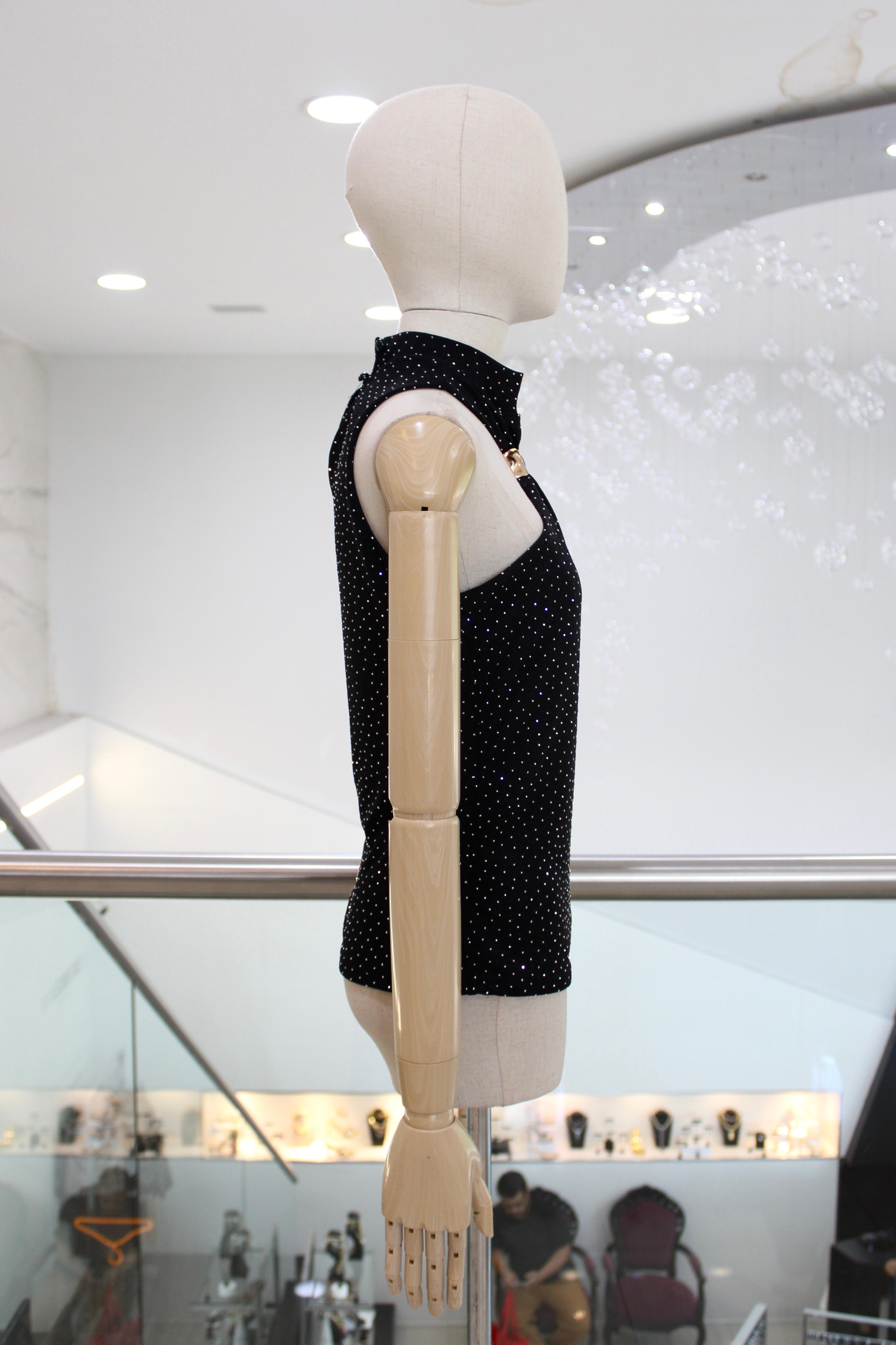 Blusa sisada negra con aplicaciones de pedrería plata y ornamento dorado en escote.