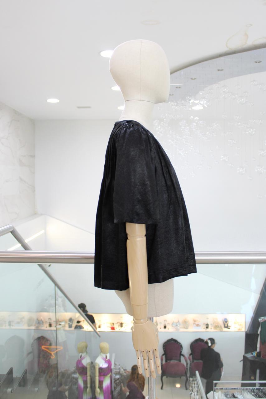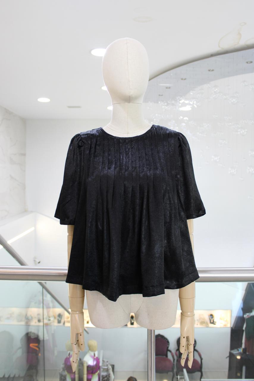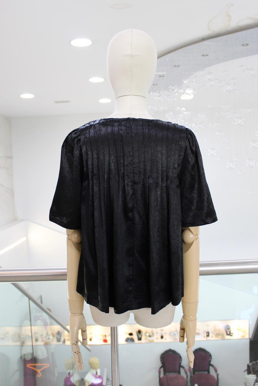 Blusa holgadita negra con acabado metálico y plisado superior.