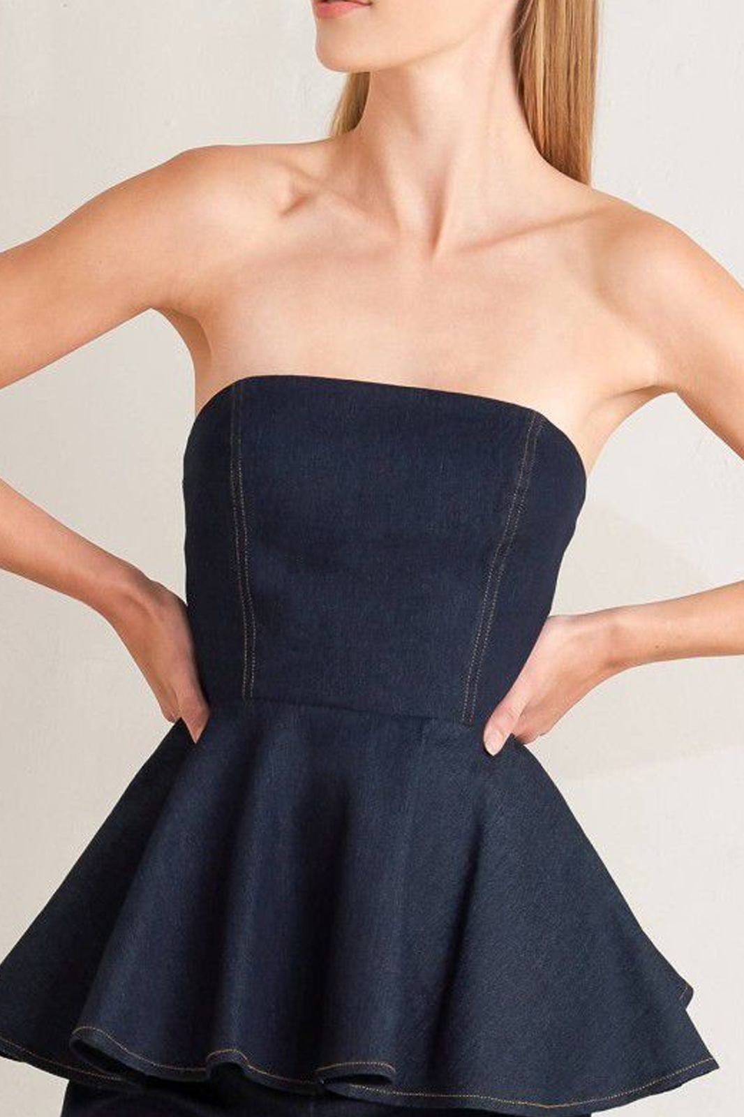 Conjunto en denim oscuro, el pantalón es wide leg con bolsillos en los laterales y la blusa es strapless con corte peplum.