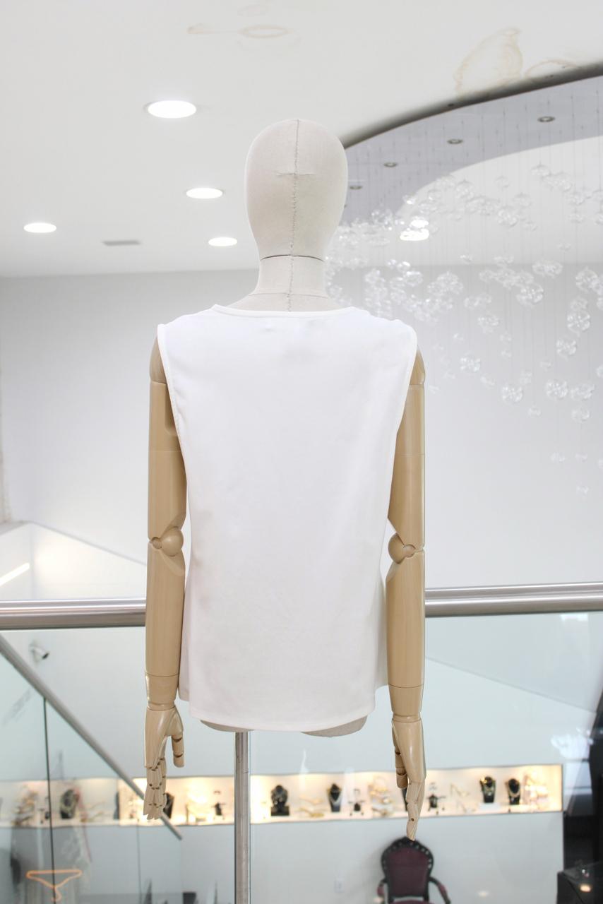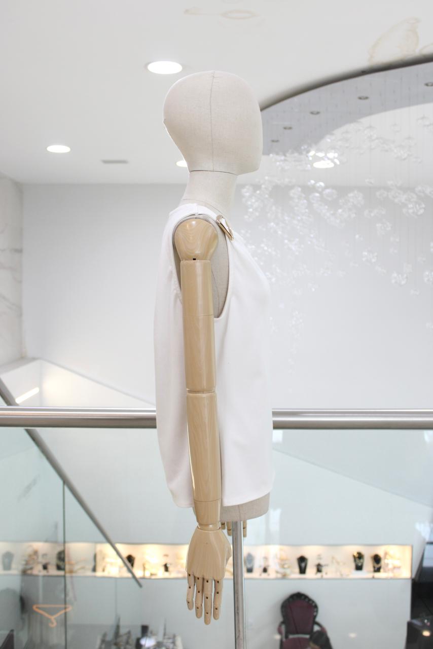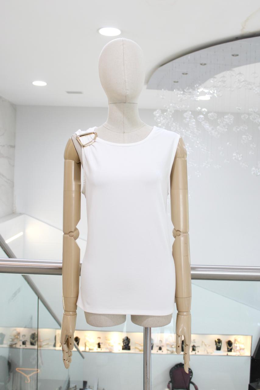 Blusa sisada blanca con hebilla dorada en hombro.