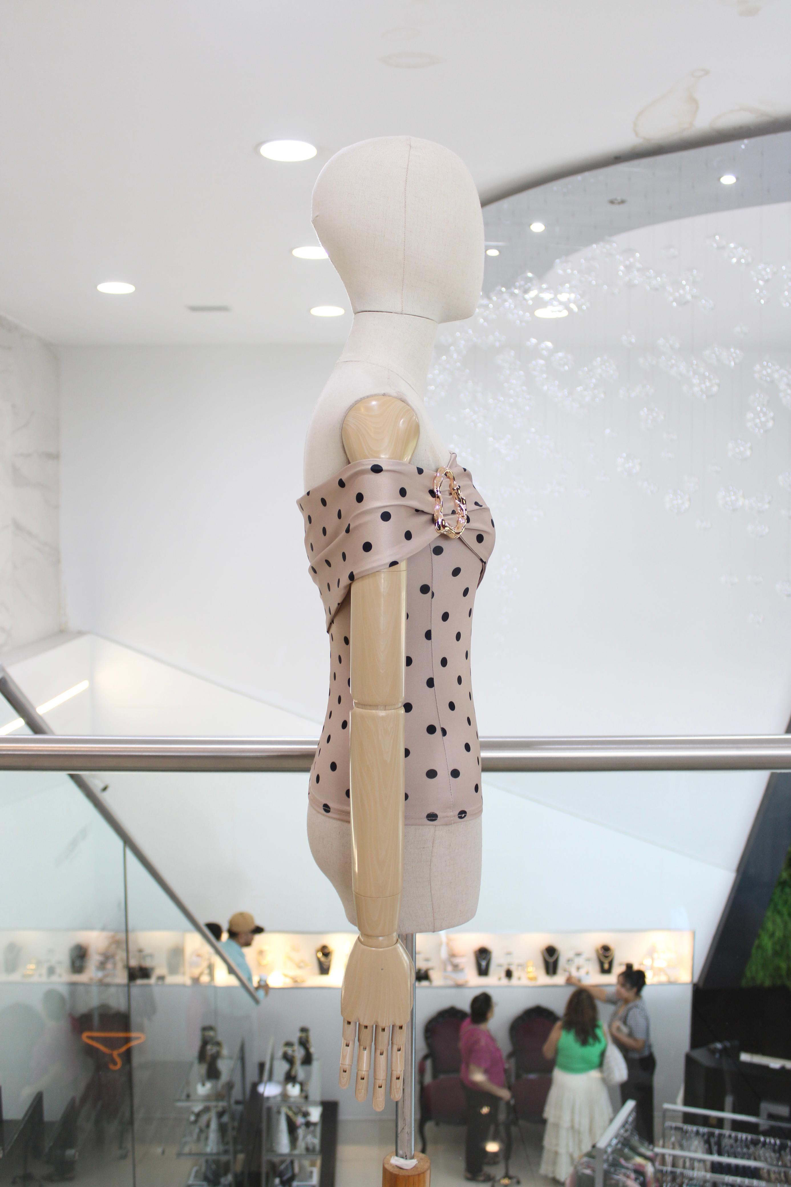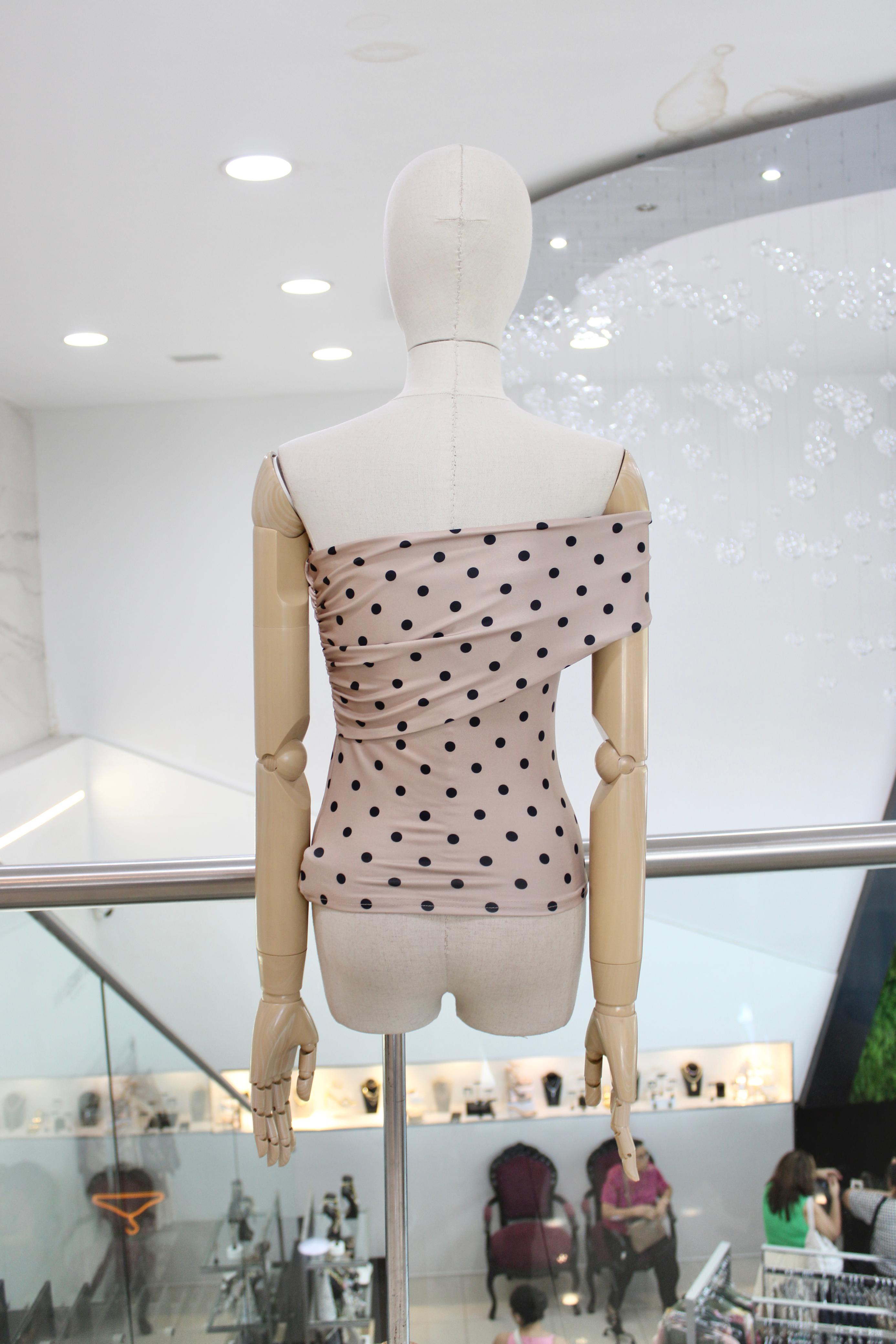 Blusa strapless beige con puntos negros y detalle de hebilla dorada en hombro.