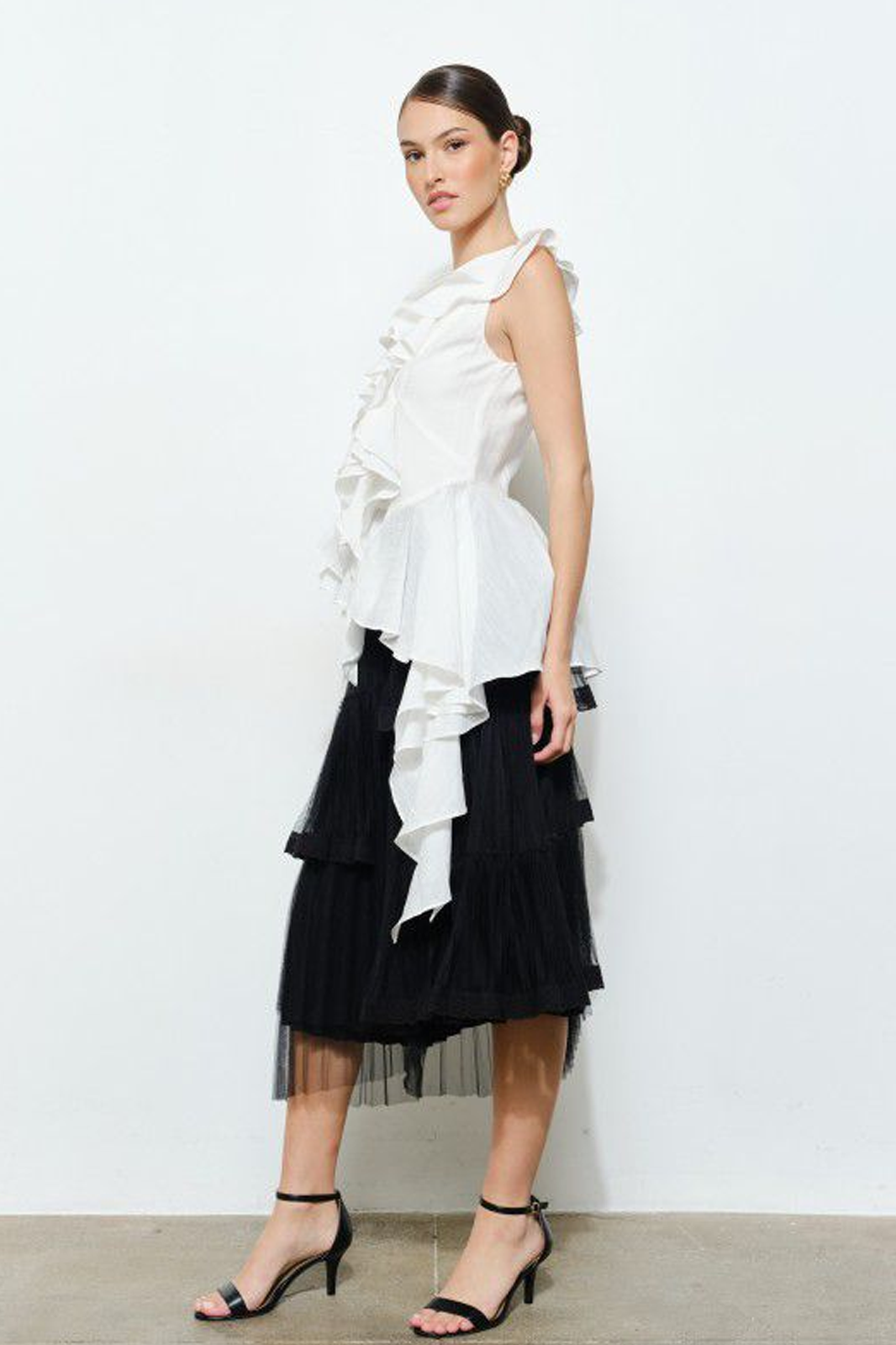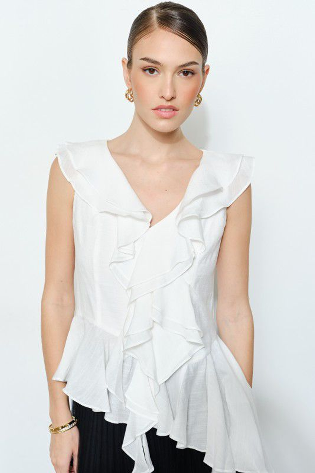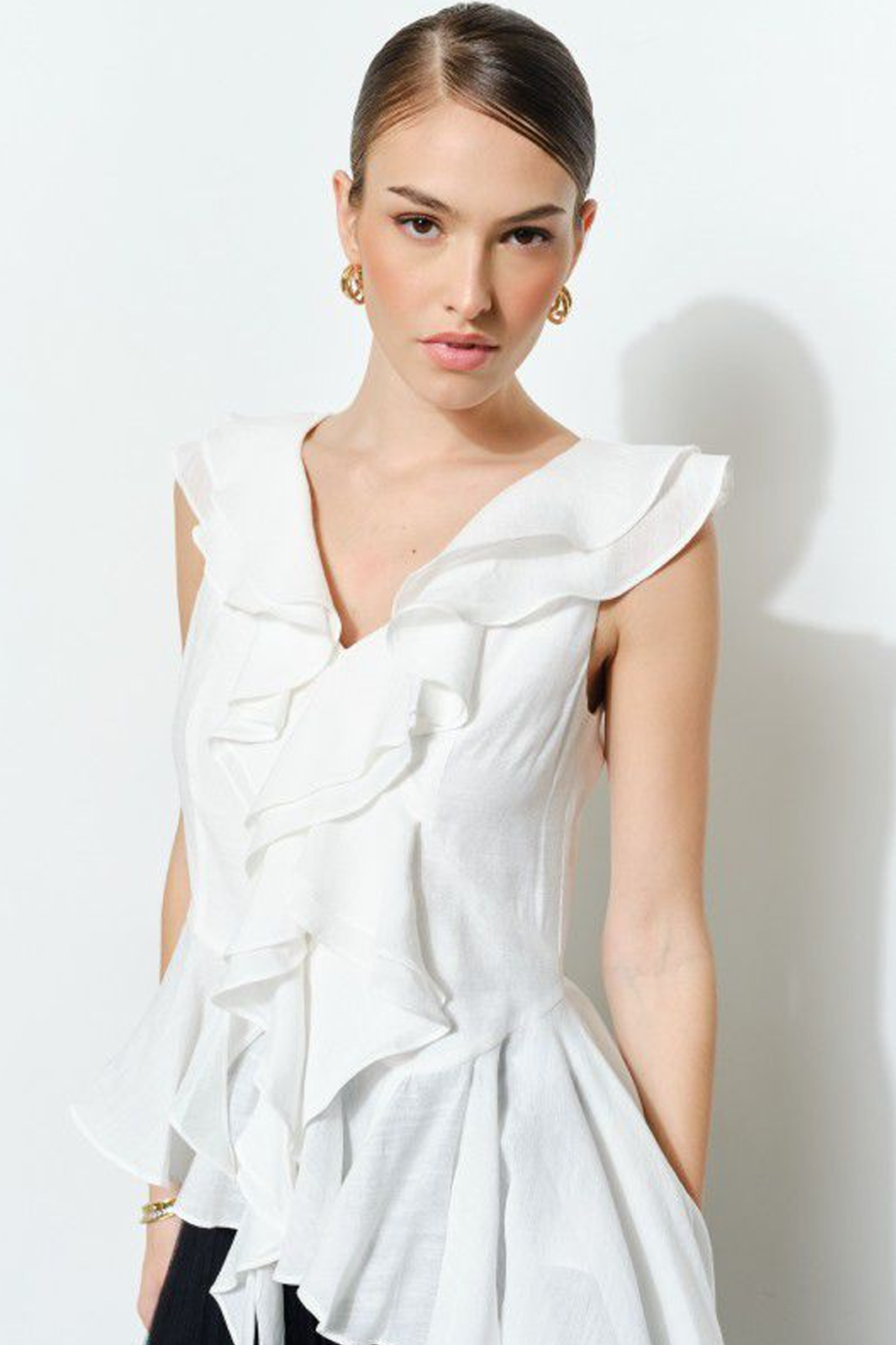 Blusa sisada blanca con terminación asimétrica y va decorada con escarolas.