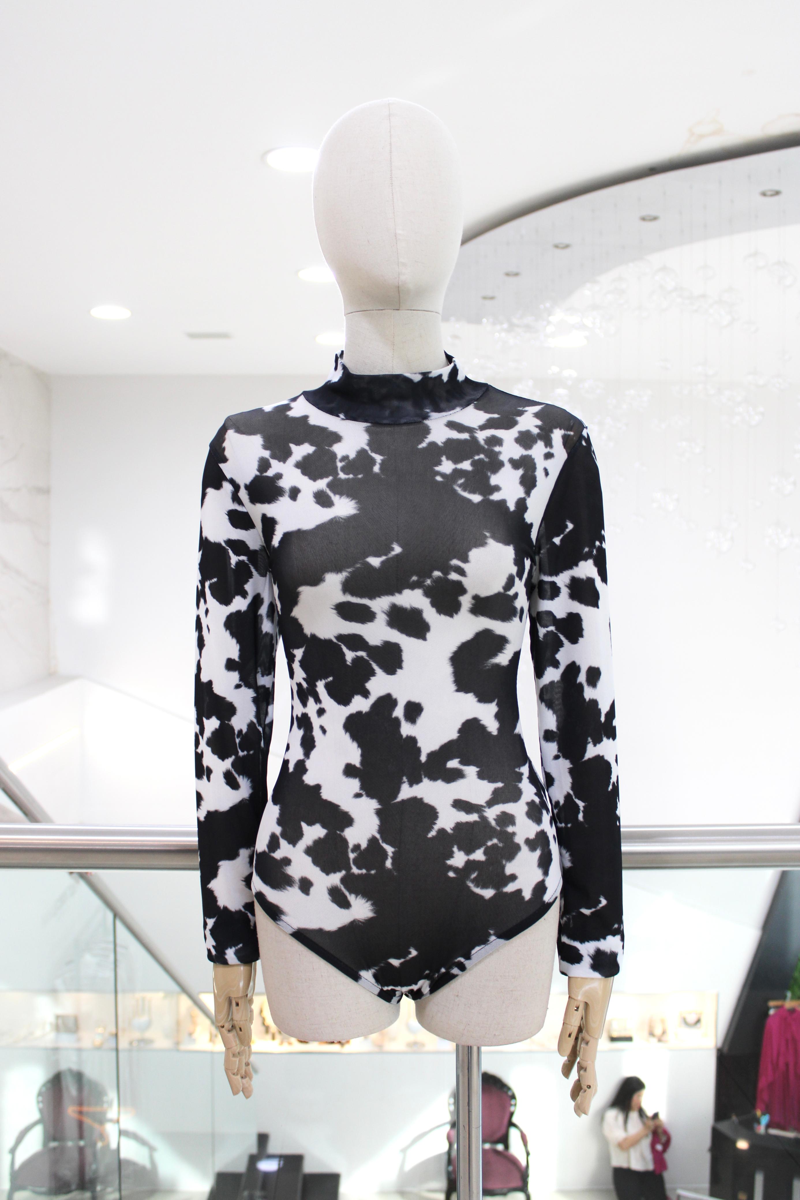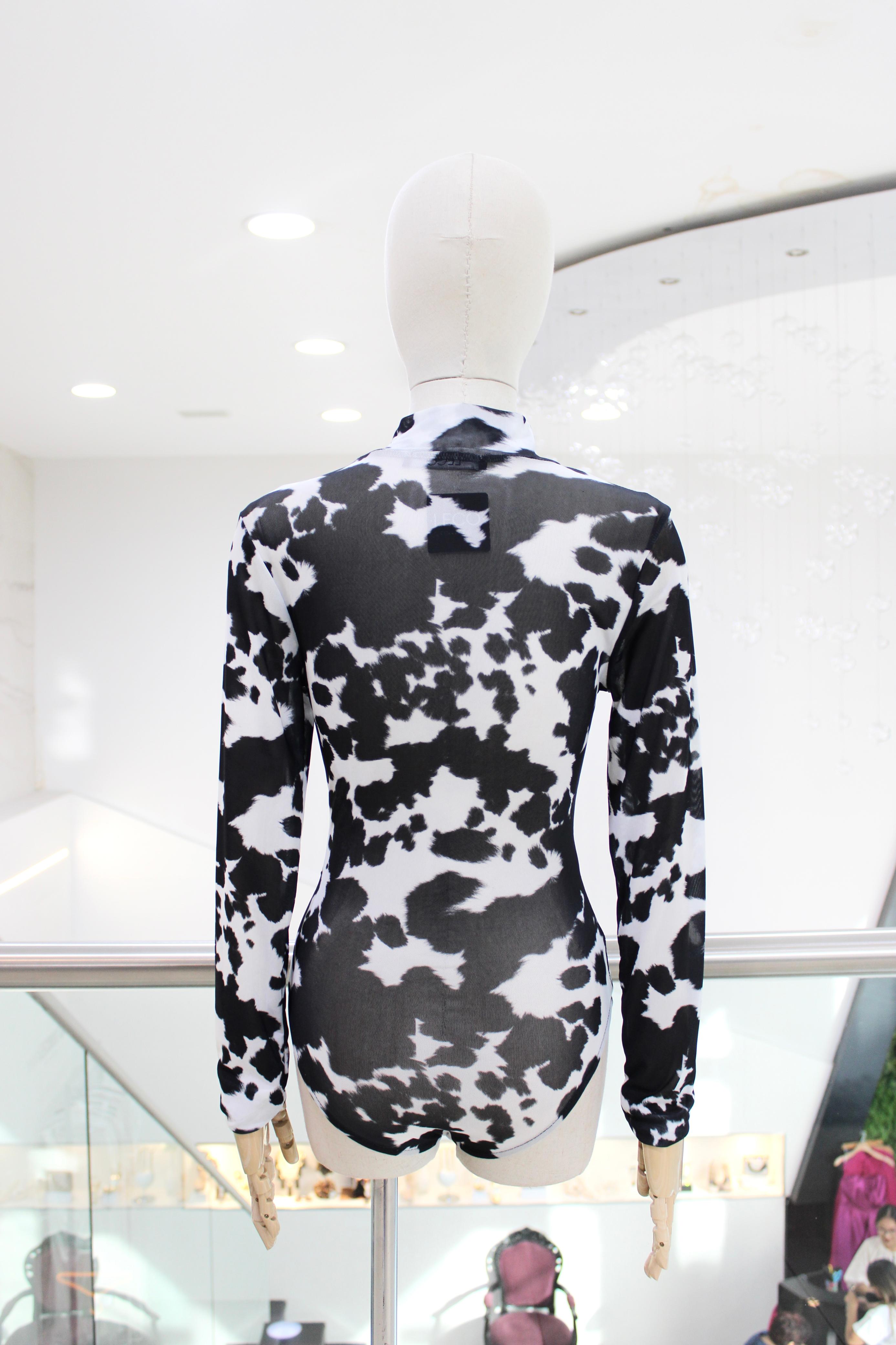 Body en tela de malla con spandex, de manga larga, con animal print de vaca