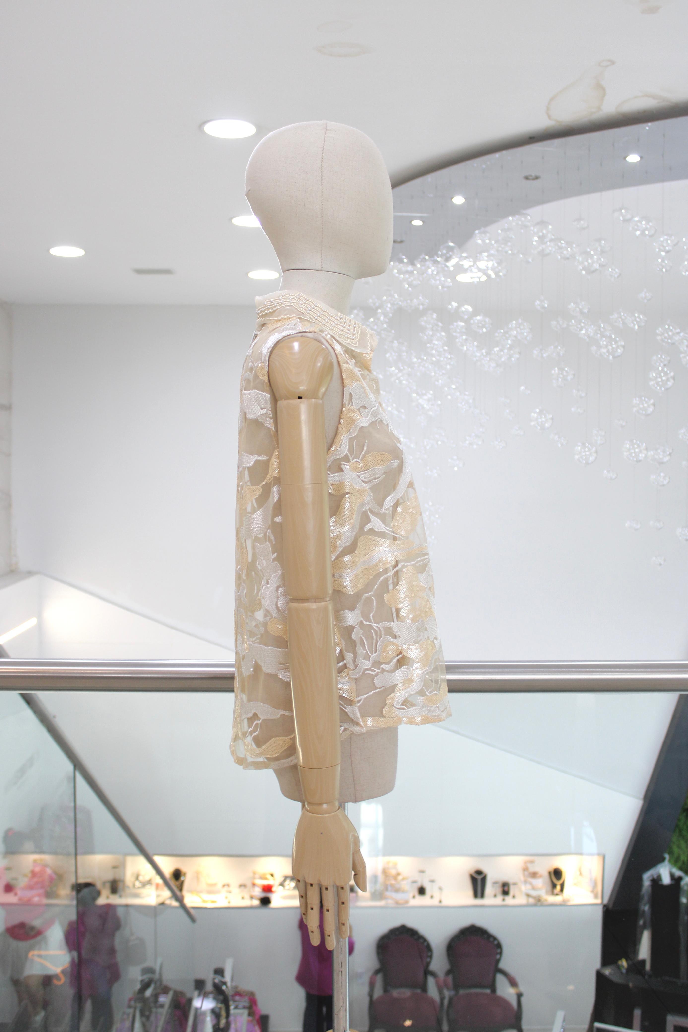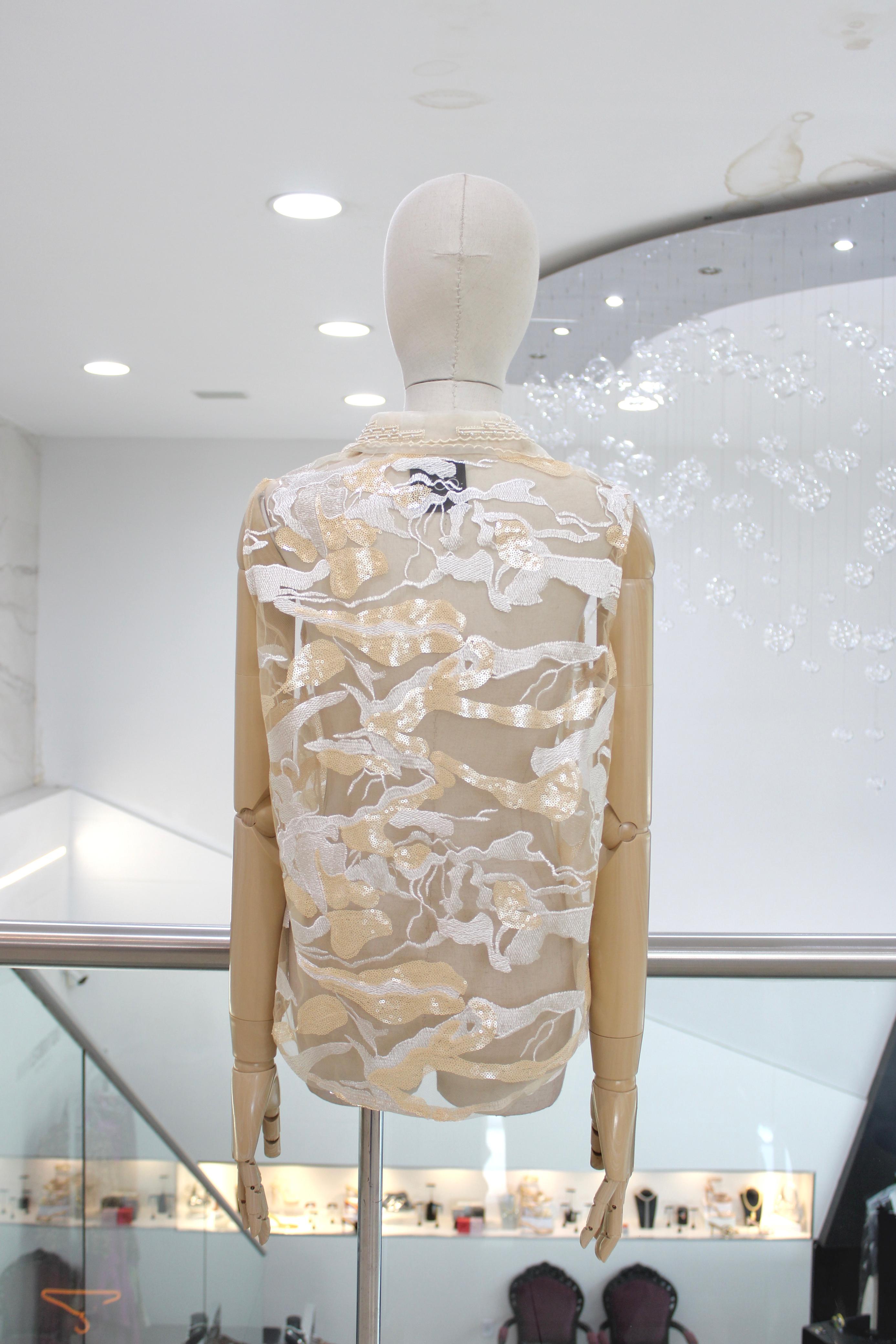 Blusa sin mangas en tul beige con transparencias, cuello camisero, botones al frente y aplicaciones de mini lentejuelas en tono hueso y blanco.