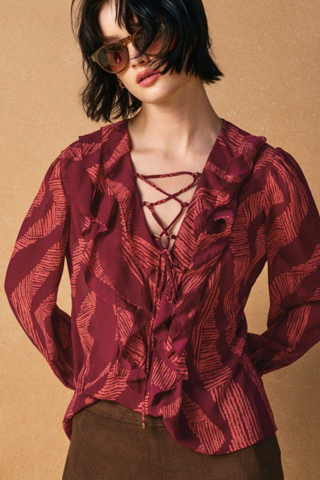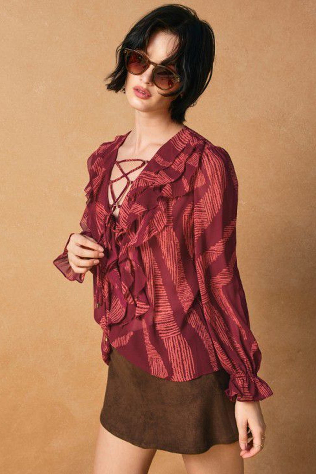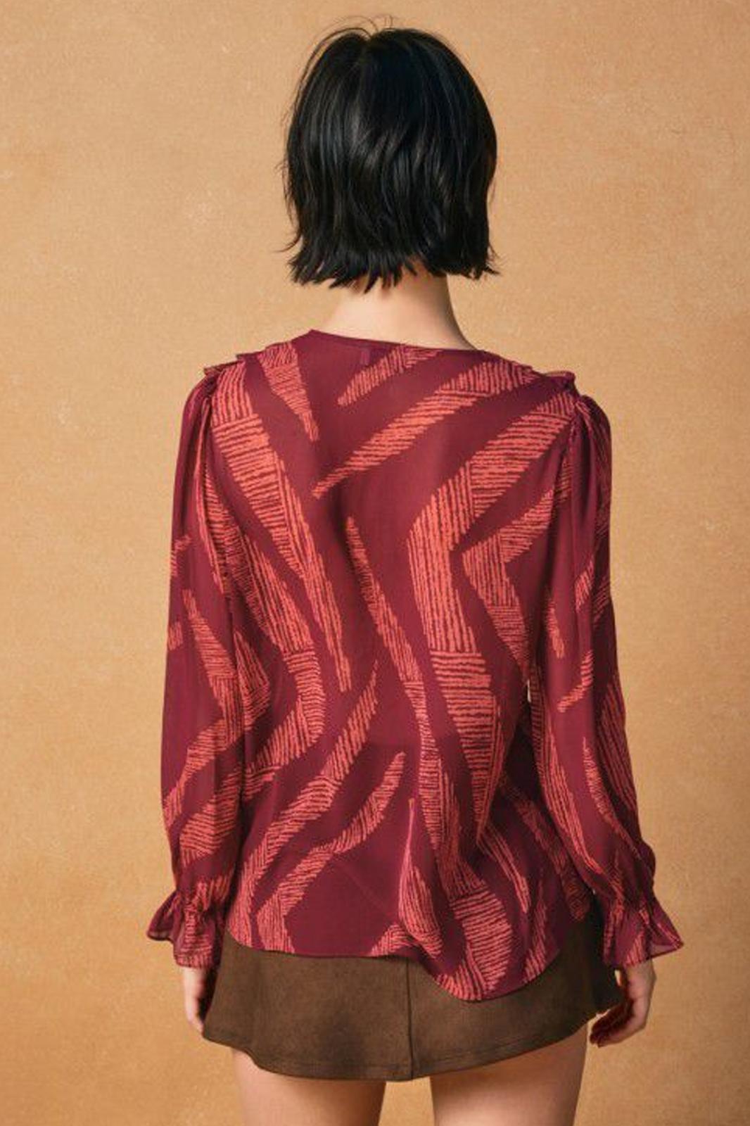 Blusa de manga larga color vino con print geométrico en tono naranja, escote en V, tiras cruzadas al frente y volantes.