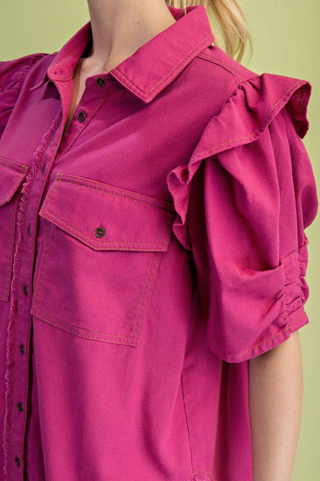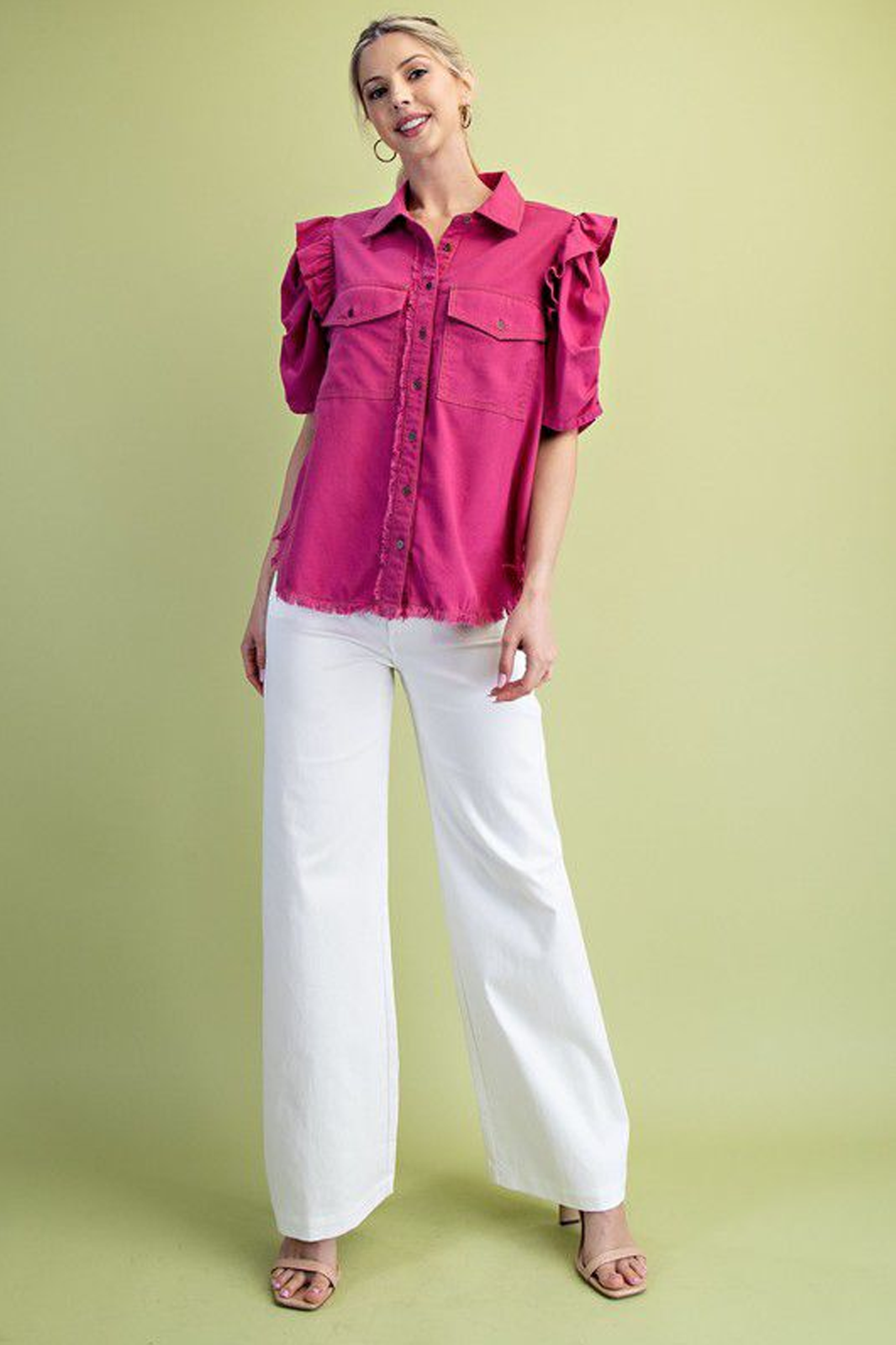 Camisa de manga corta rosa con escarola en maga, bolsillos al frente y detalles de deshilachado a lo largo y en terminación.