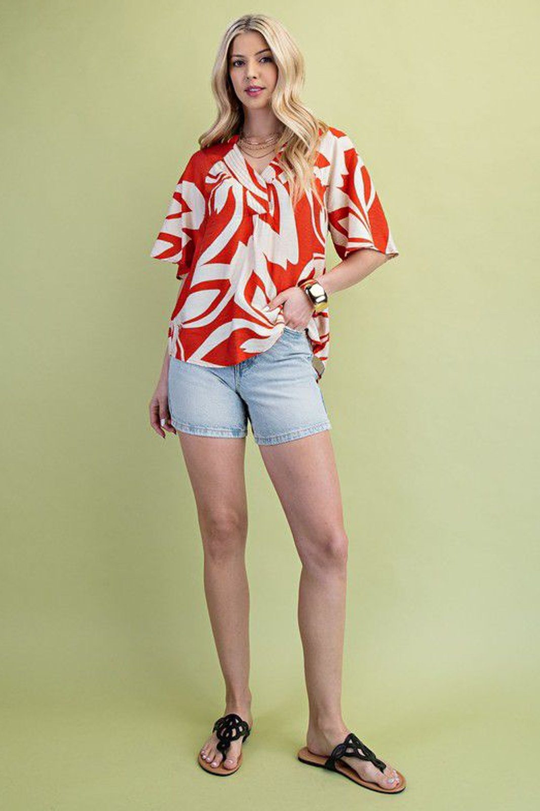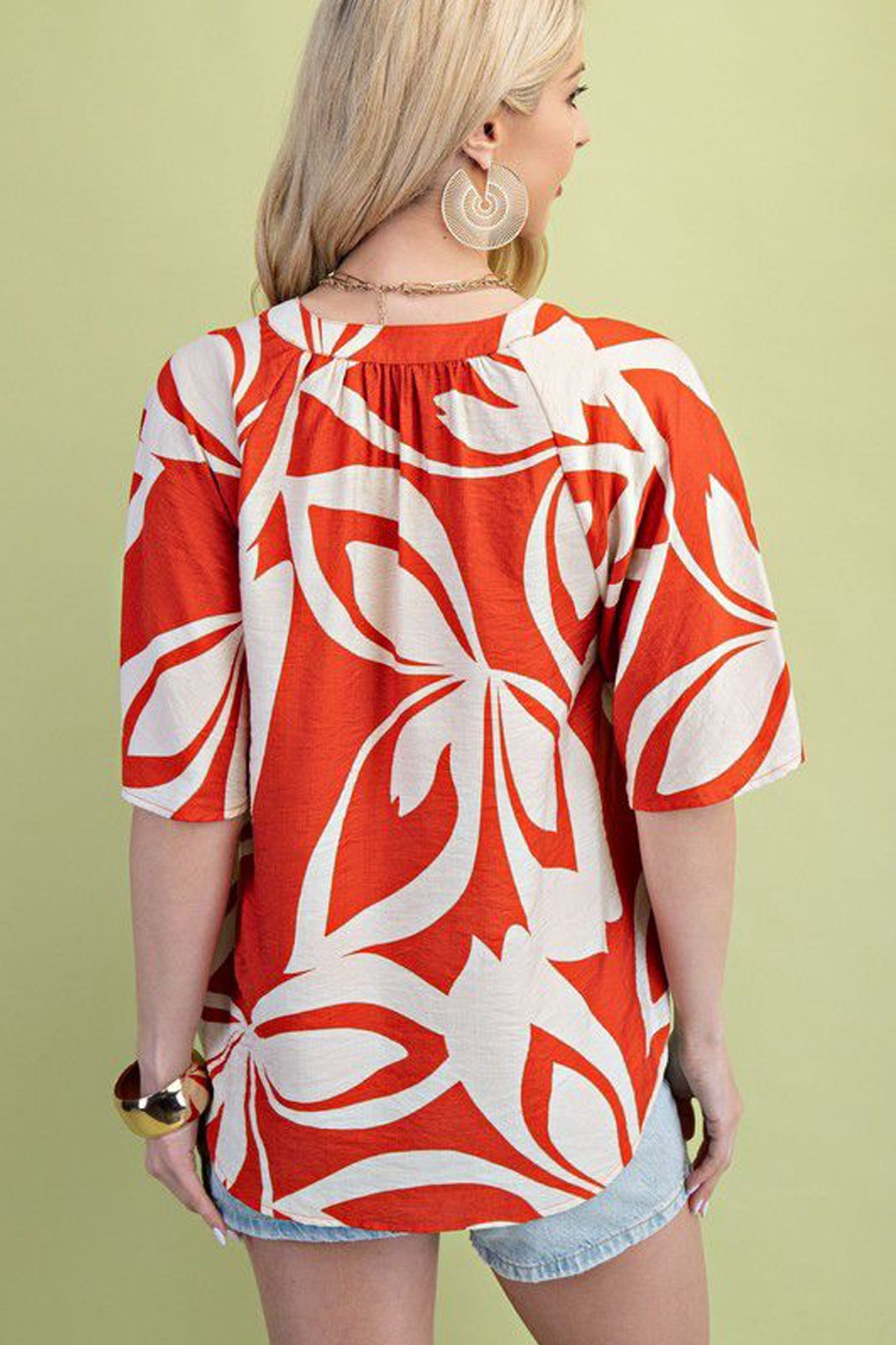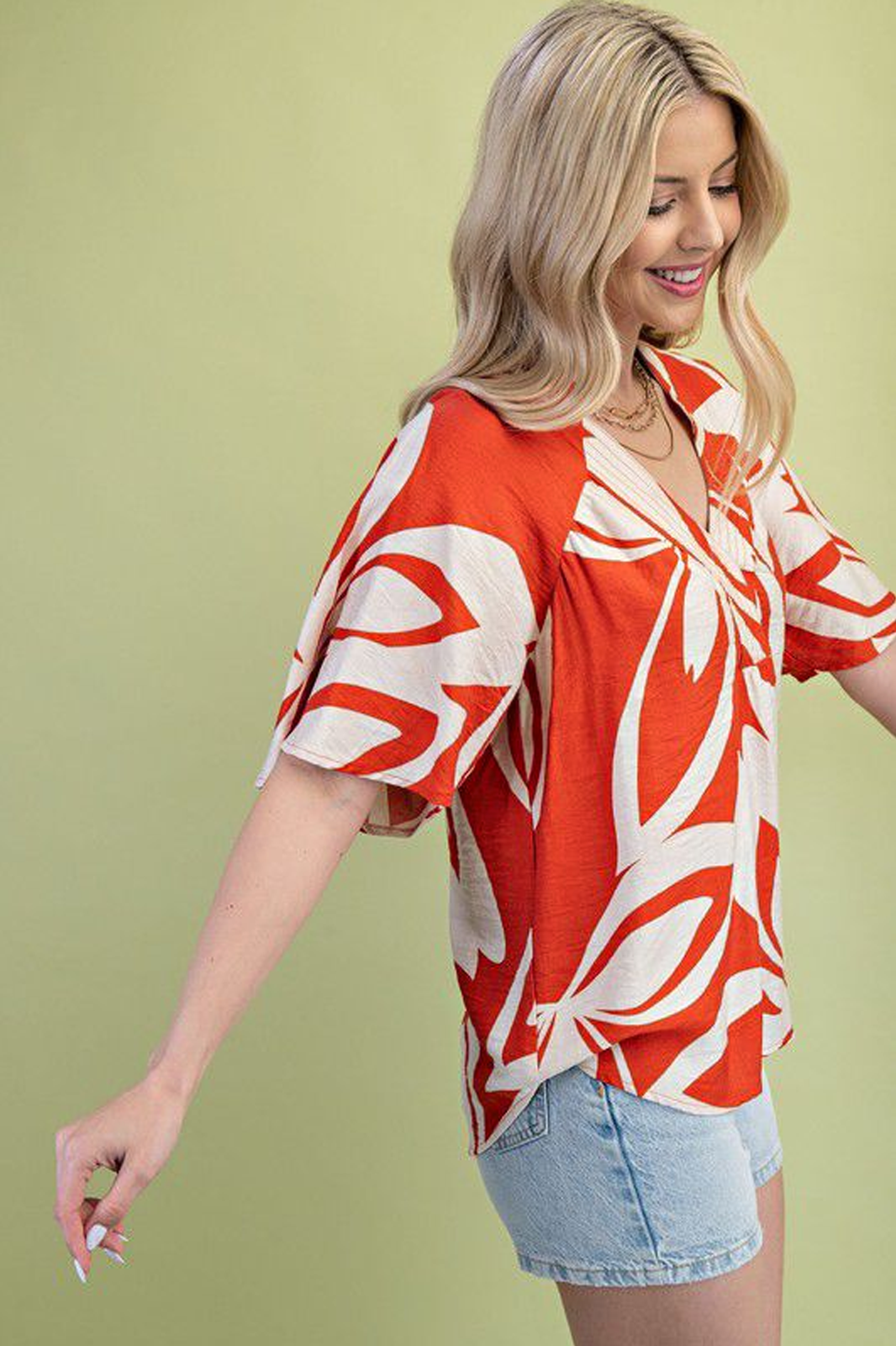 Blusa en suave tela naranja con estampado maxi color blanco y escote en V.