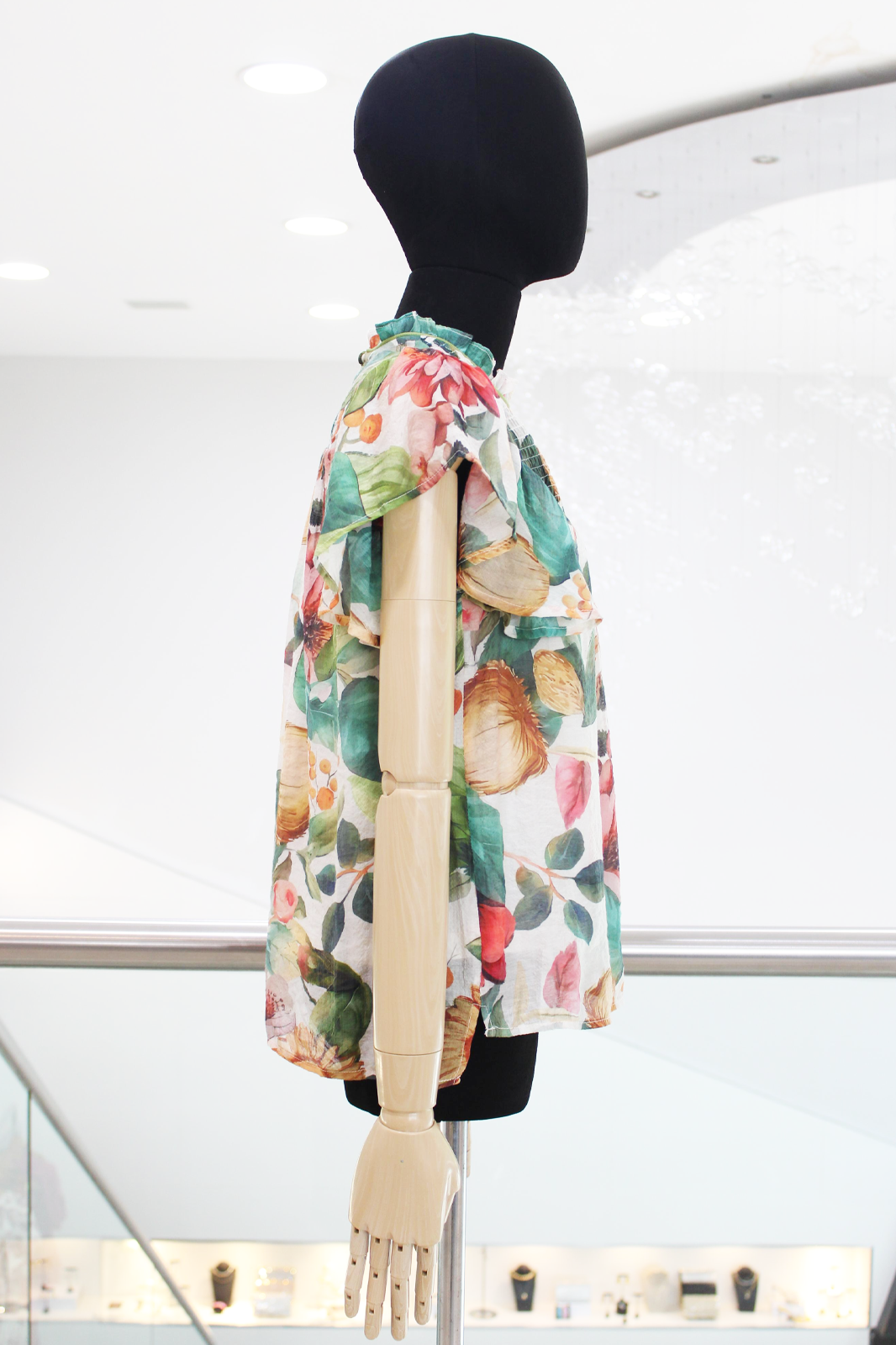 Blusa de manga corta blanca con estampado floral en tonos verdes y rosas, viene con forro.