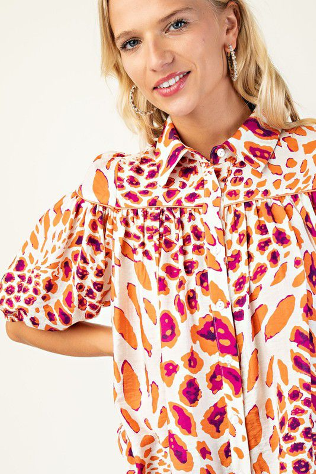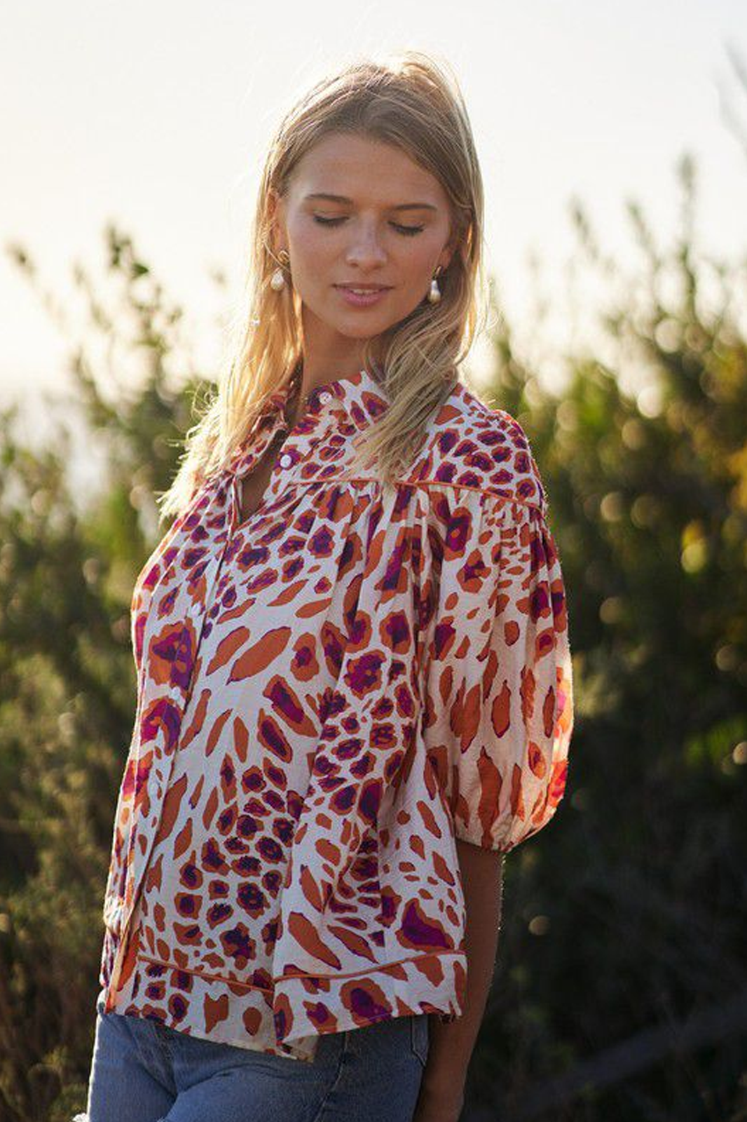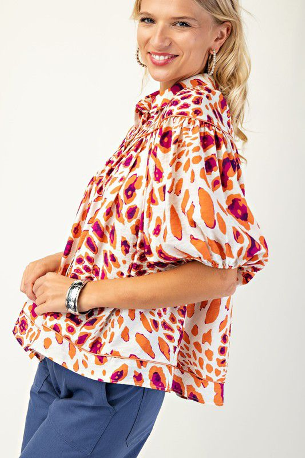 Camisa de manga abullonada, en suave tela blanca con print abstracto en tonos naranjas y morados.