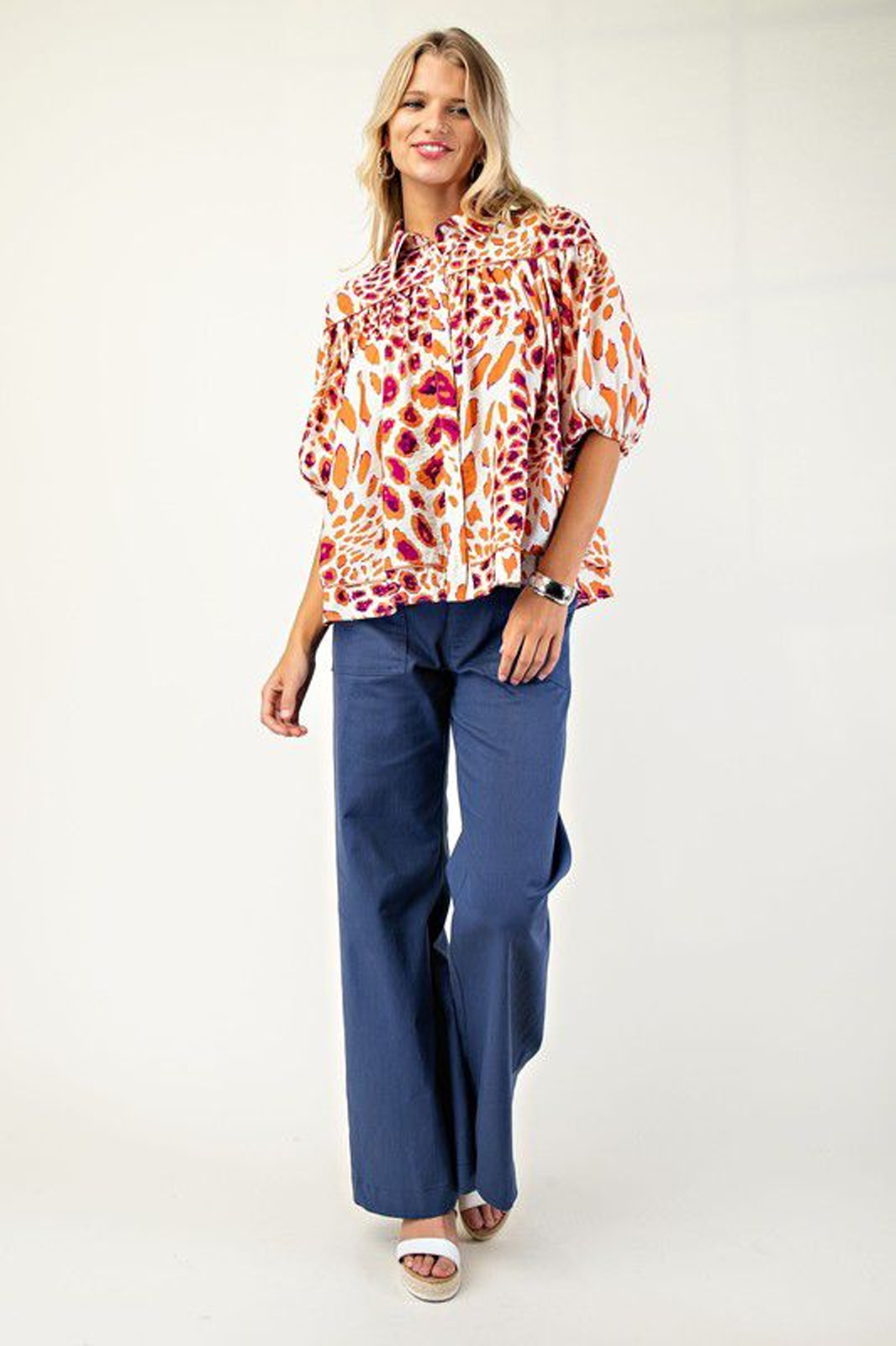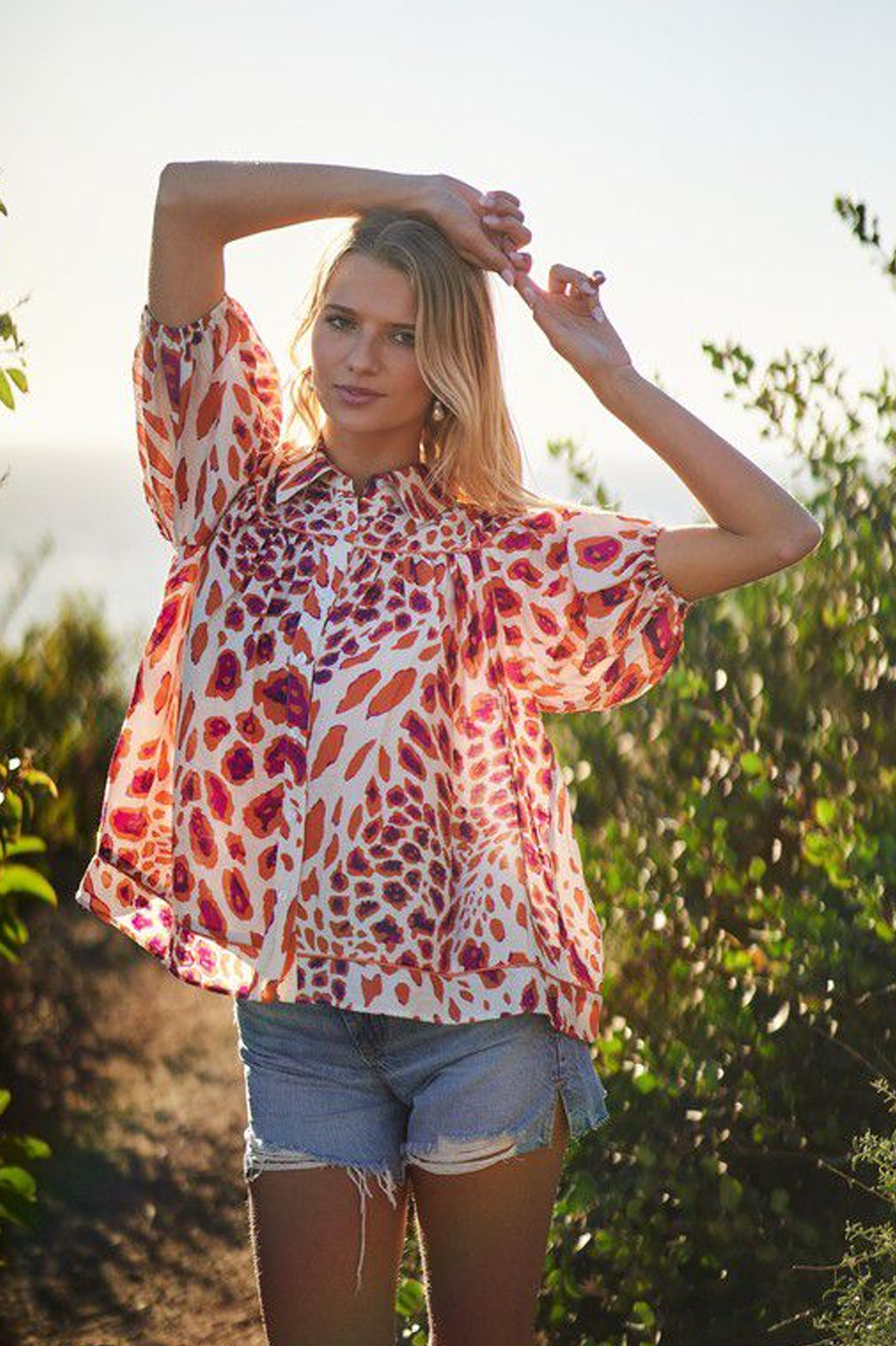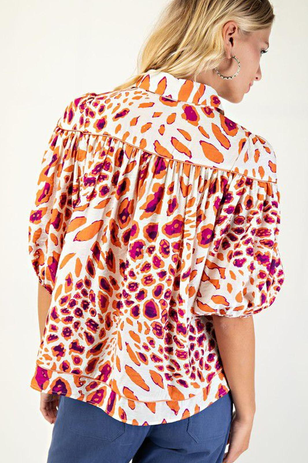 Camisa de manga abullonada, en suave tela blanca con print abstracto en tonos naranjas y morados.