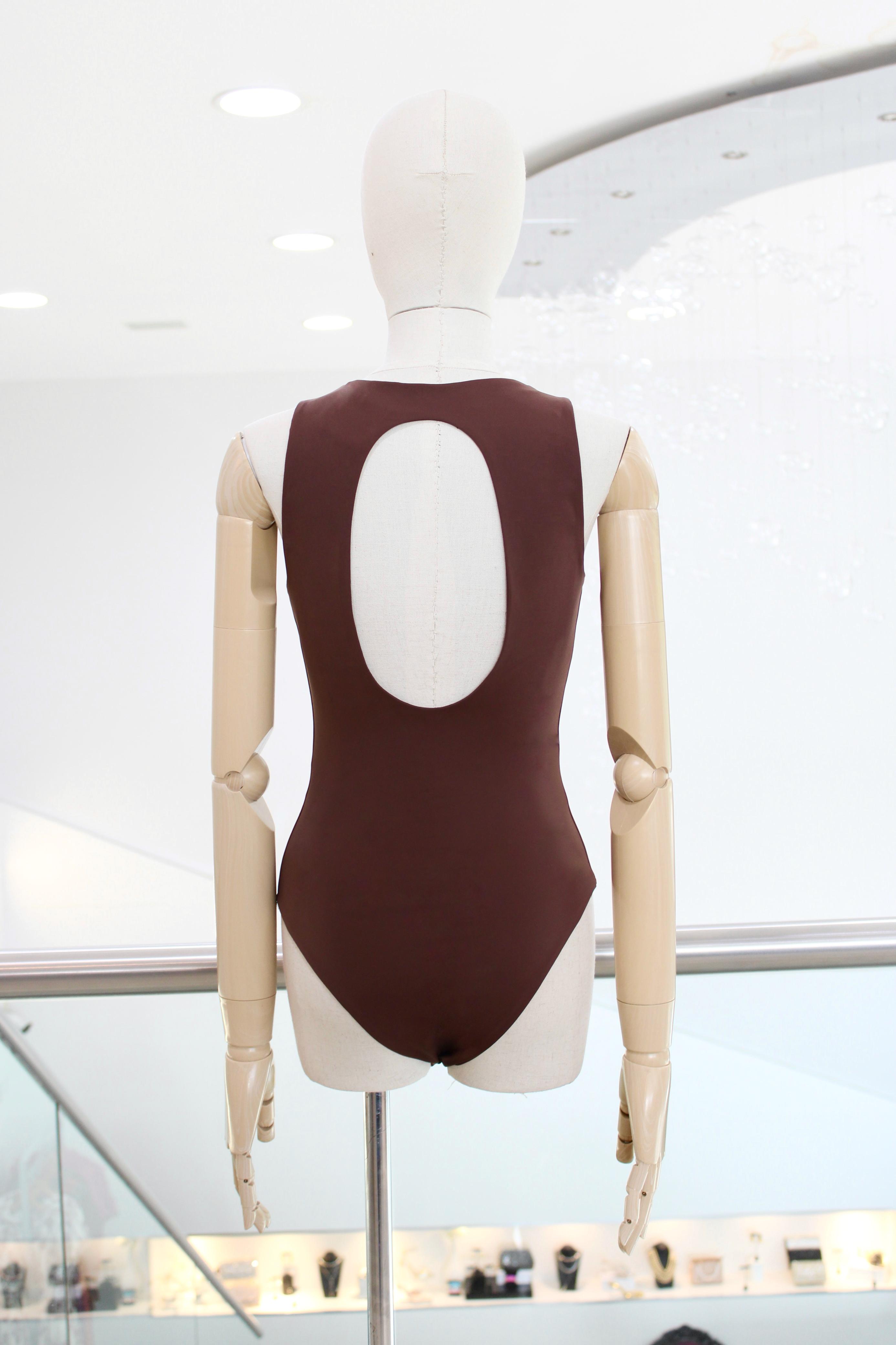 Body sin mangas color café oliva con cuello redondo y espalda descubierta con abertura ovalada.