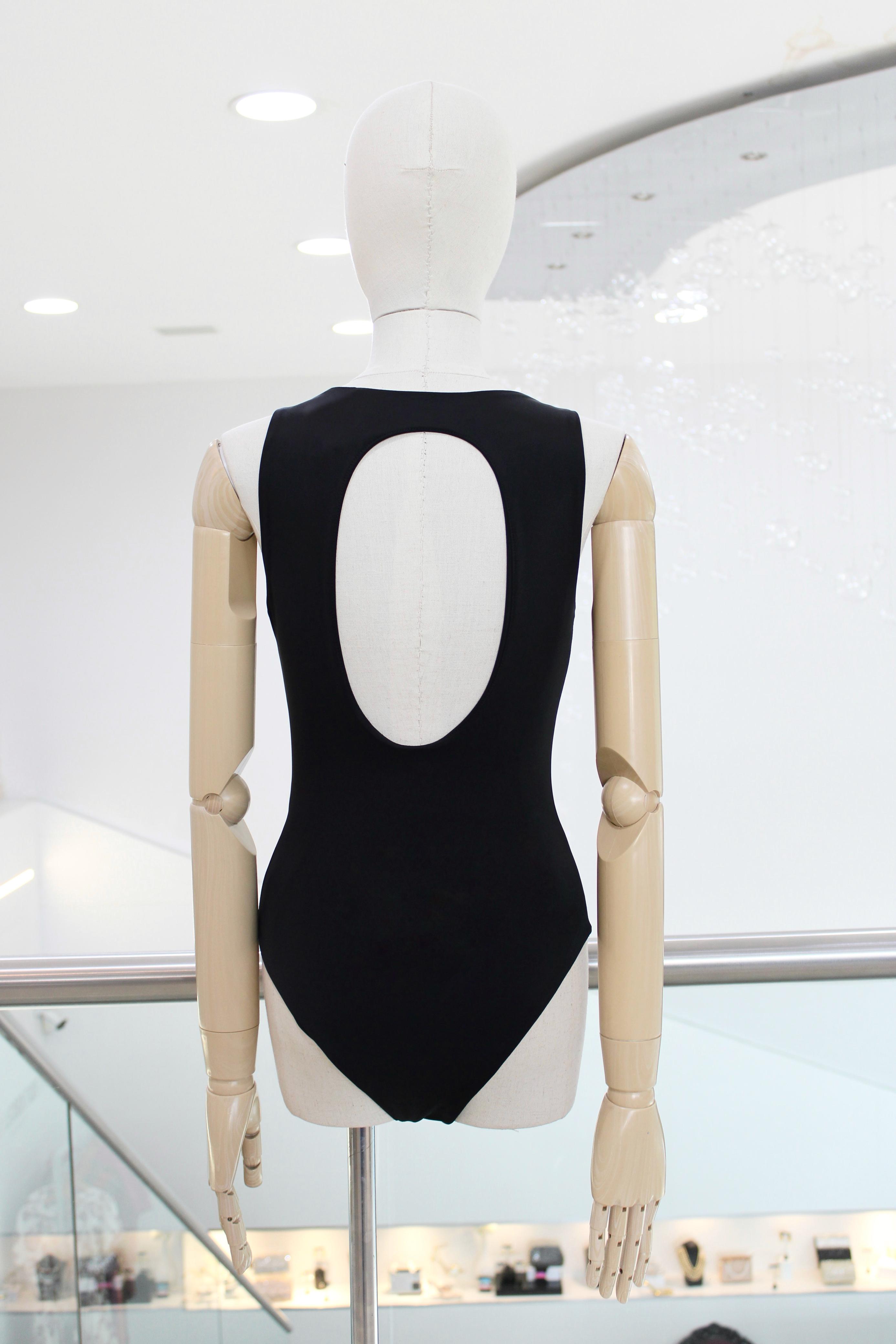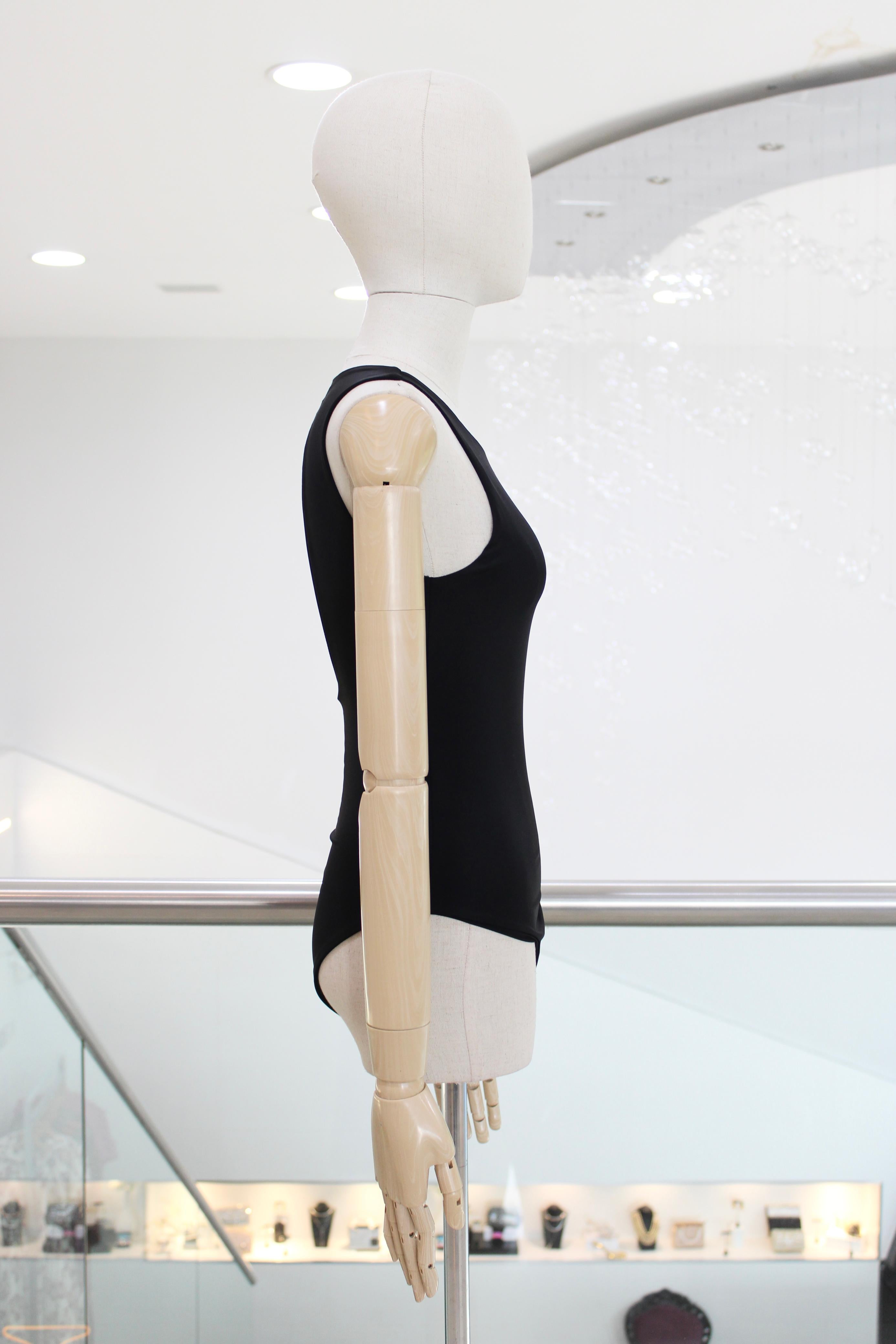 Body sin mangas color negro con cuello redondo y espalda descubierta con abertura ovalada.