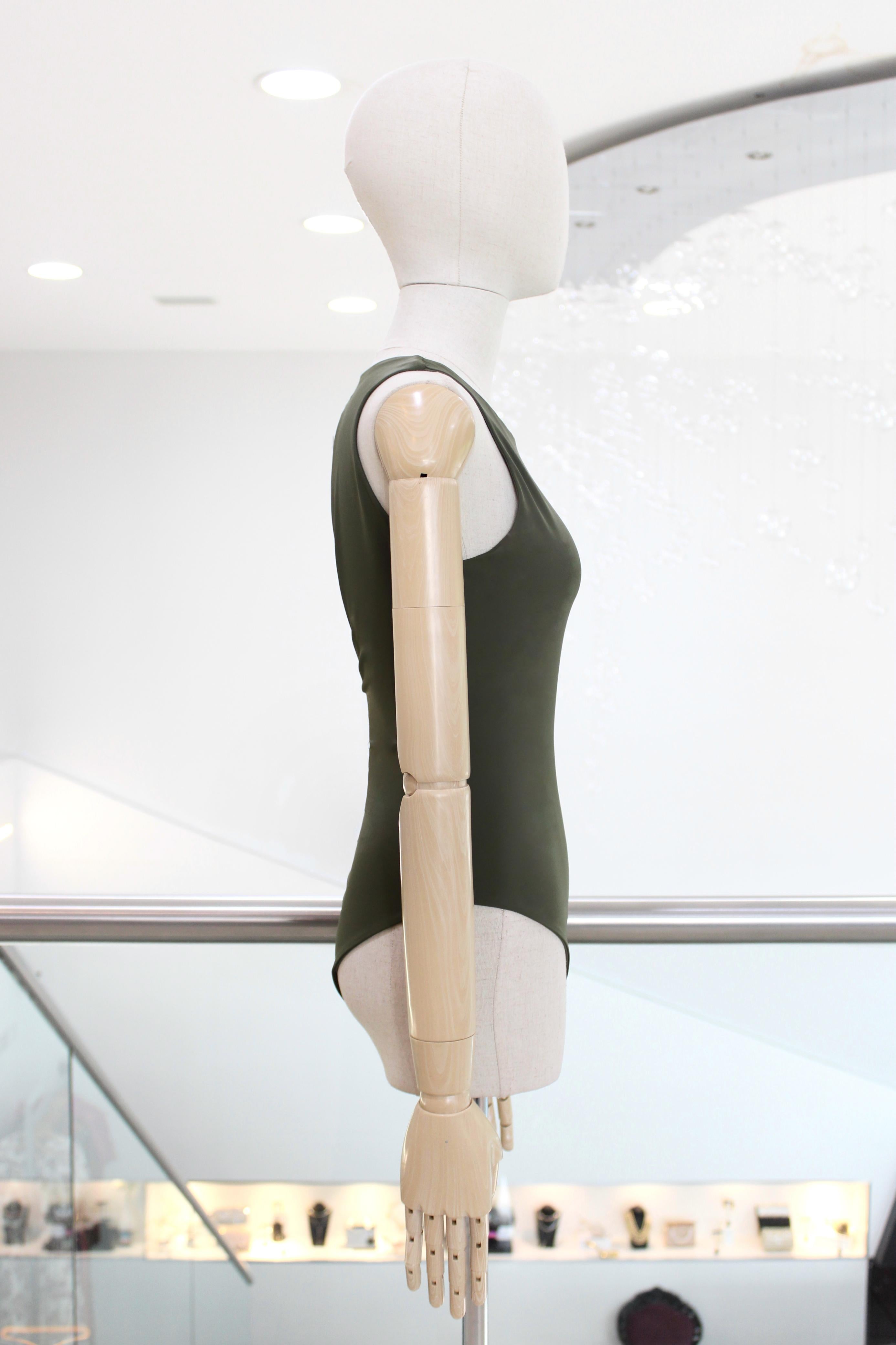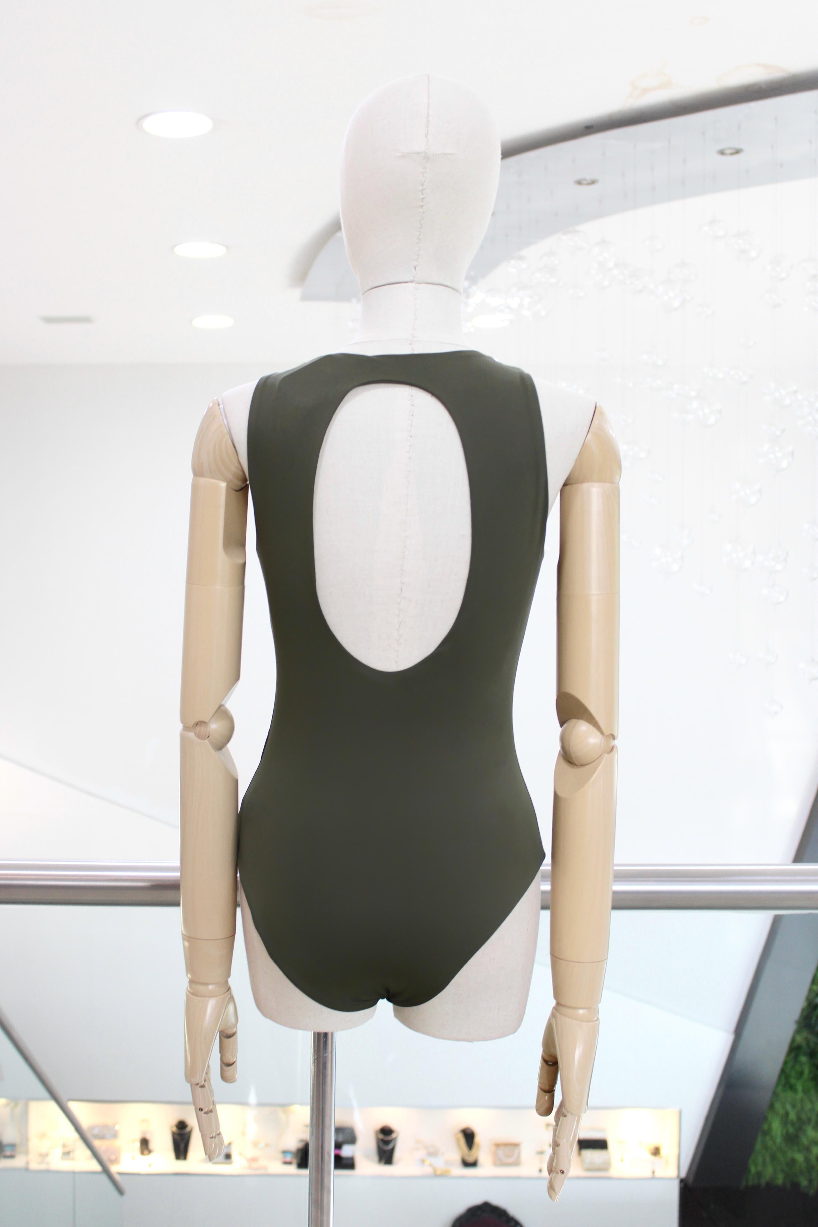 Body sin mangas color verde oliva con cuello redondo y espalda descubierta con abertura ovalada.