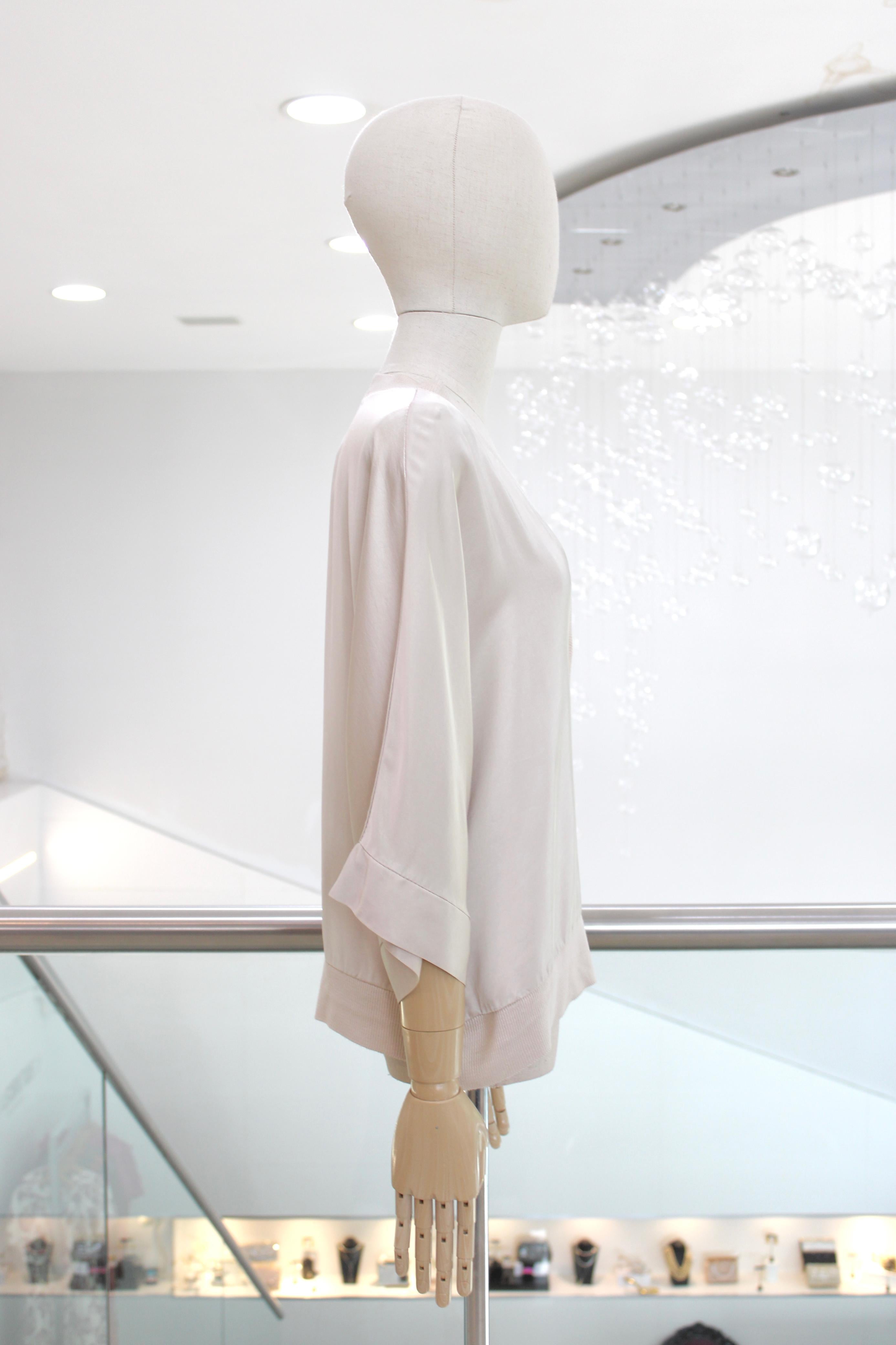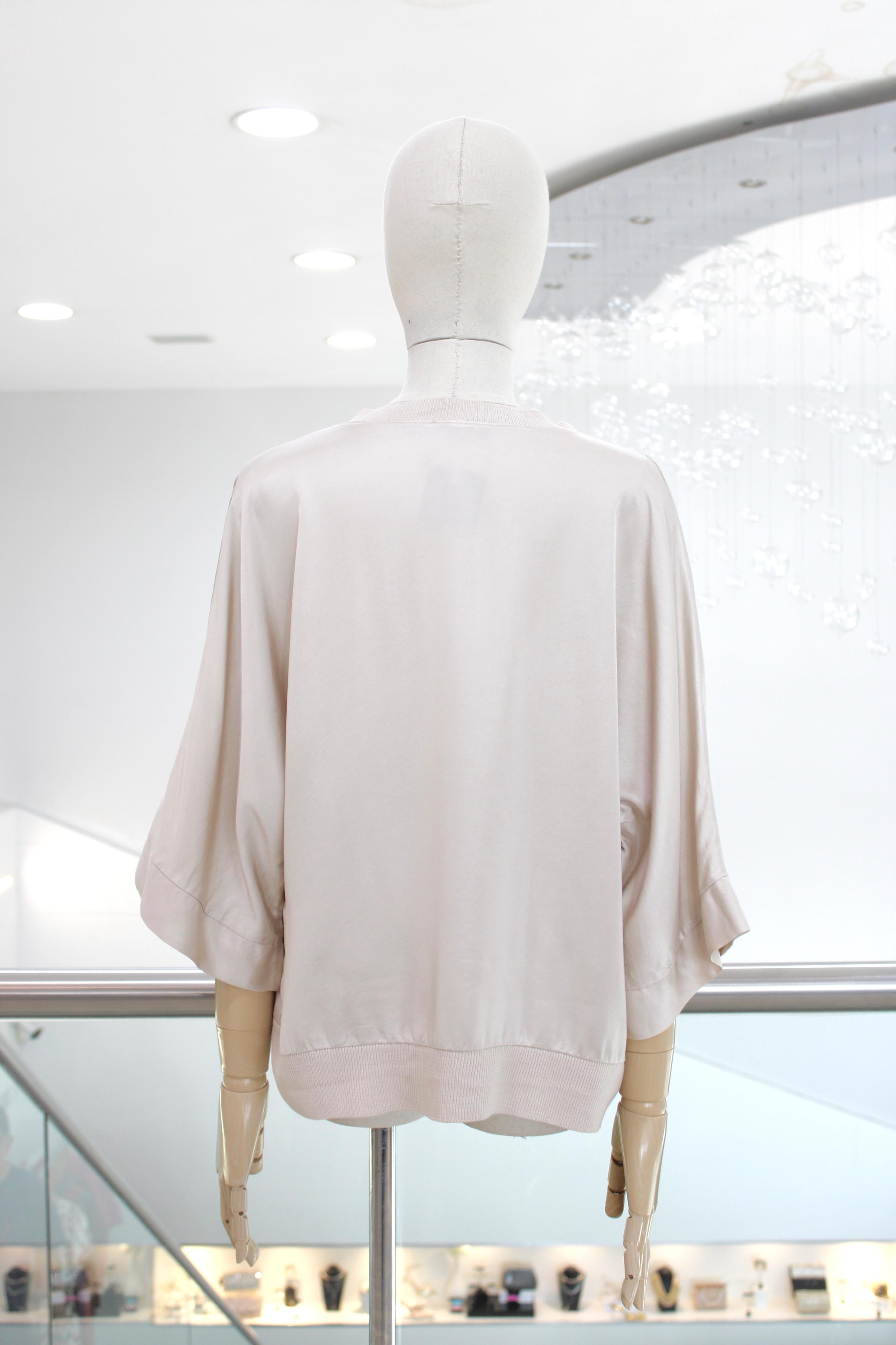 Cardigan color beige claro y mangas amplias tipo kimono, escote en V y botones al frente.