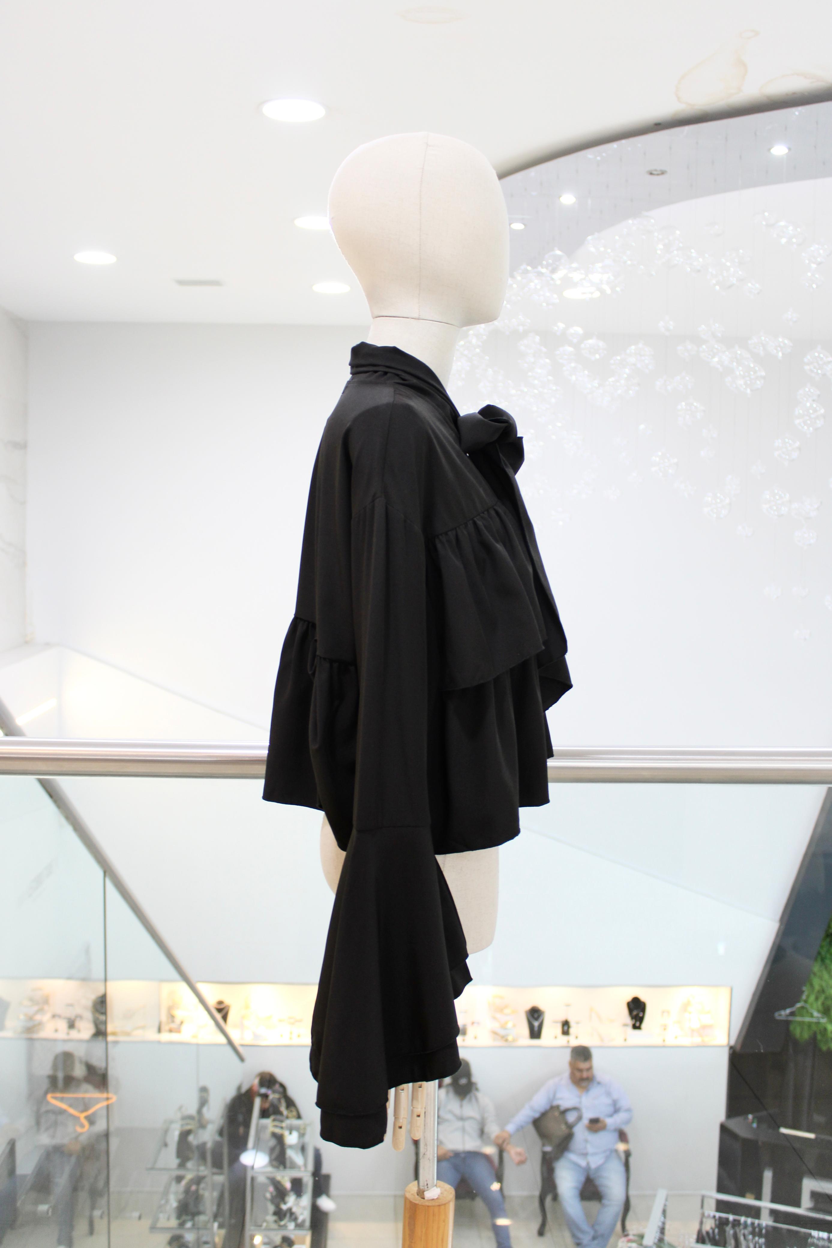 Blusa crop negra con olanes, es de manga larga estilo volante y tiene lazo en cuello.