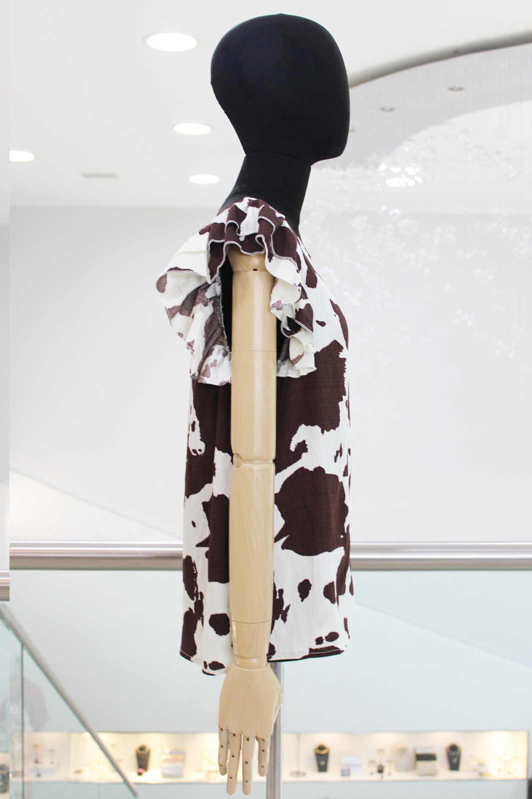 Blusa en suave tela blanca con animal print café y escarola en manga.
