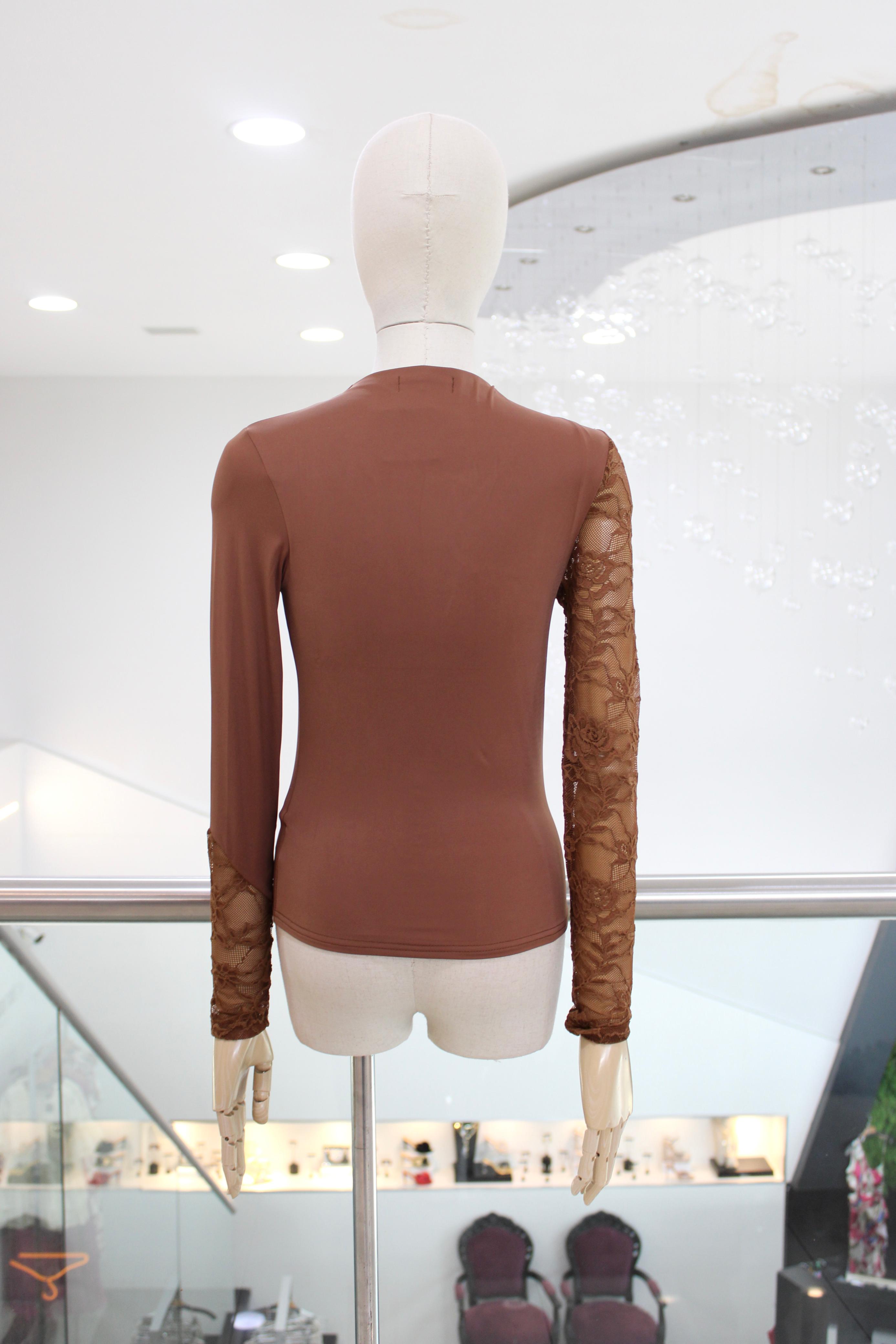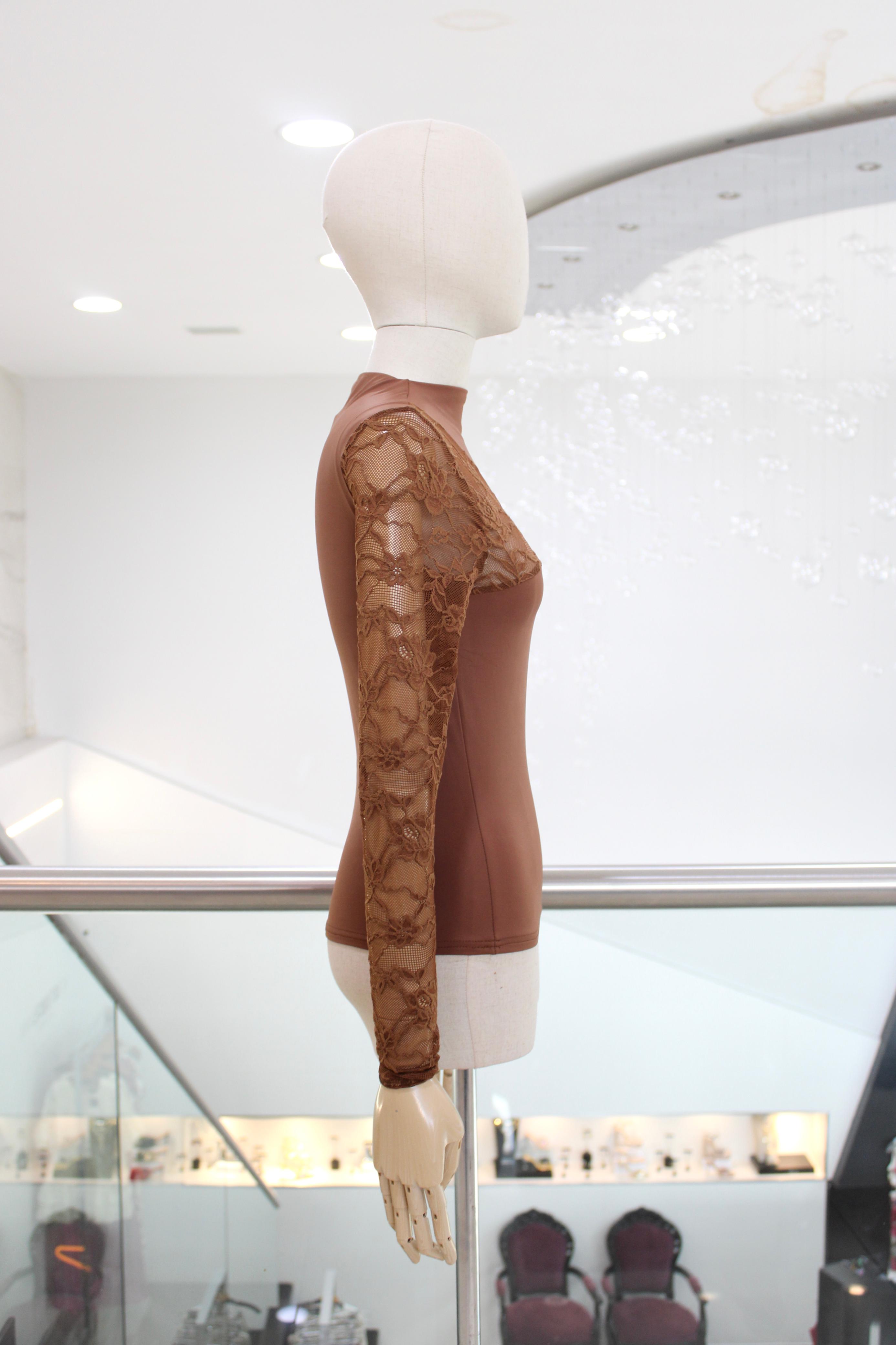 Blusa de manga larga en tela spandex color café y aplicación lateral de encaje floral en hombro.