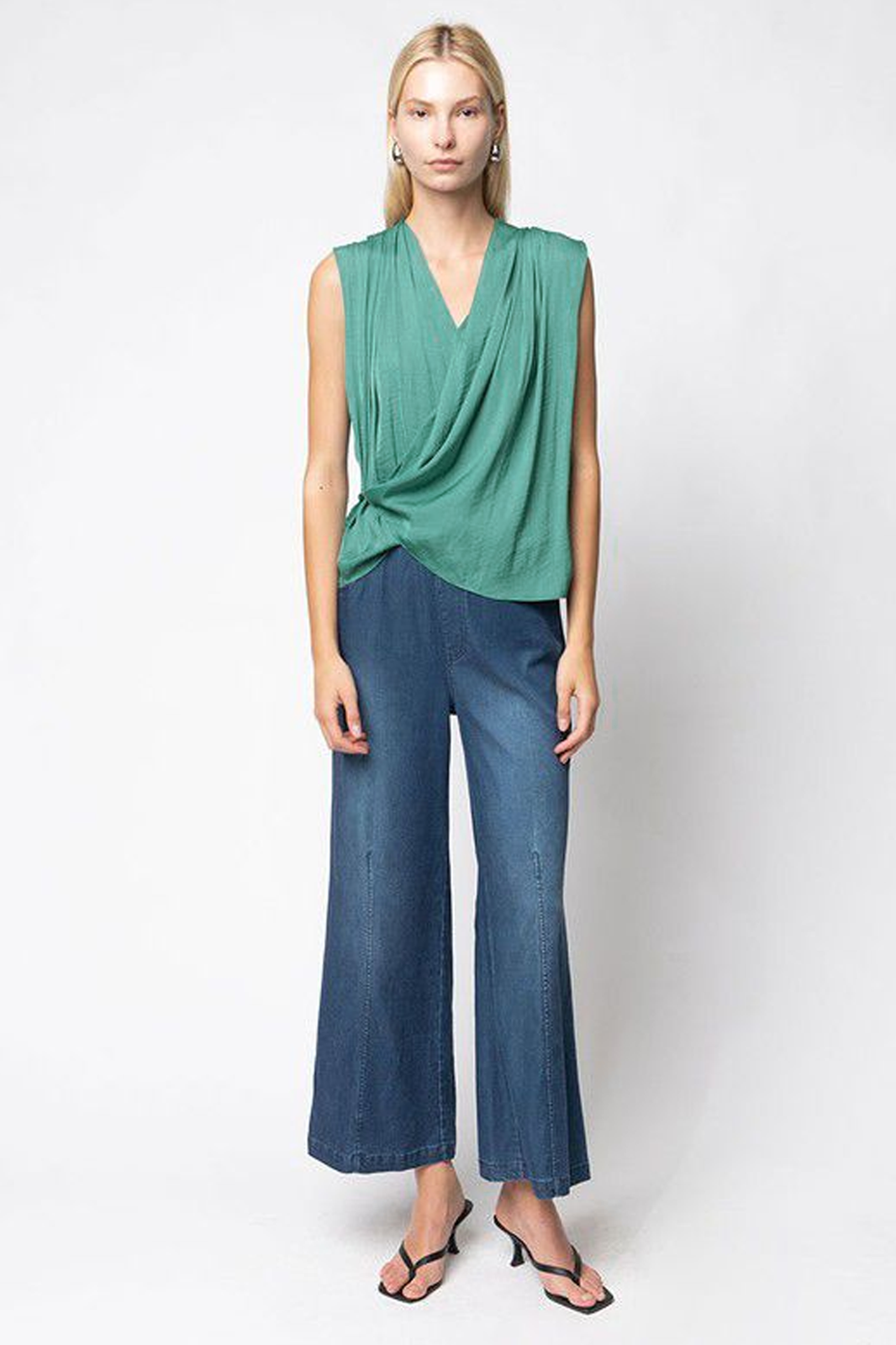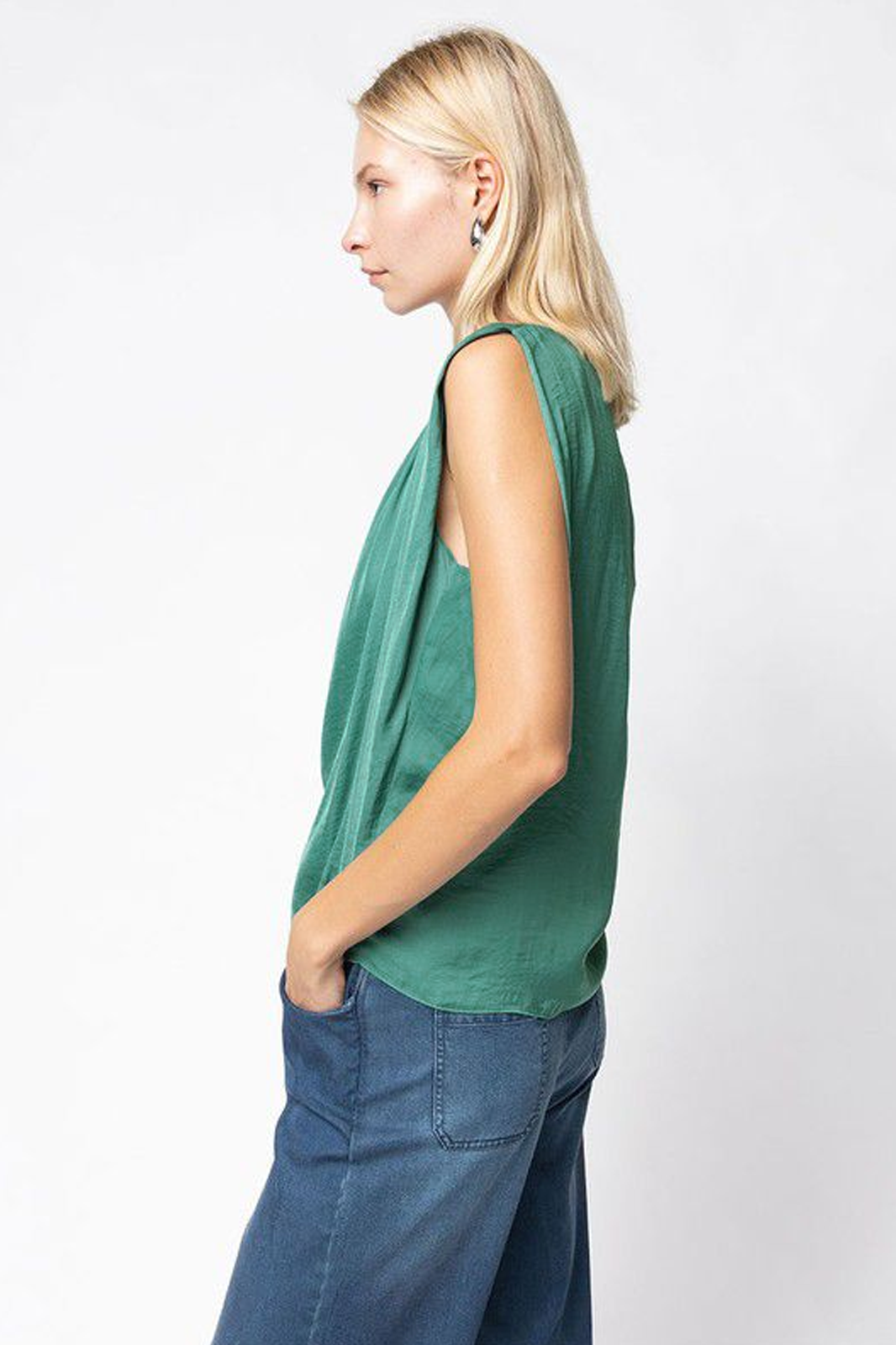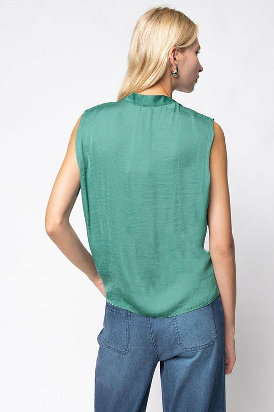Blusa sin mangas color verde con escote holgado y cruzado al frente.