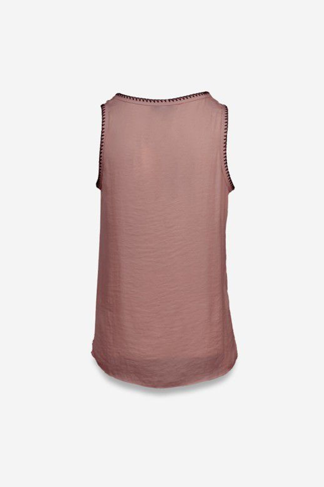 Blusa sisada en suave tela fluida color mauve, con detalle bordado negro en cuello circular y mangas.