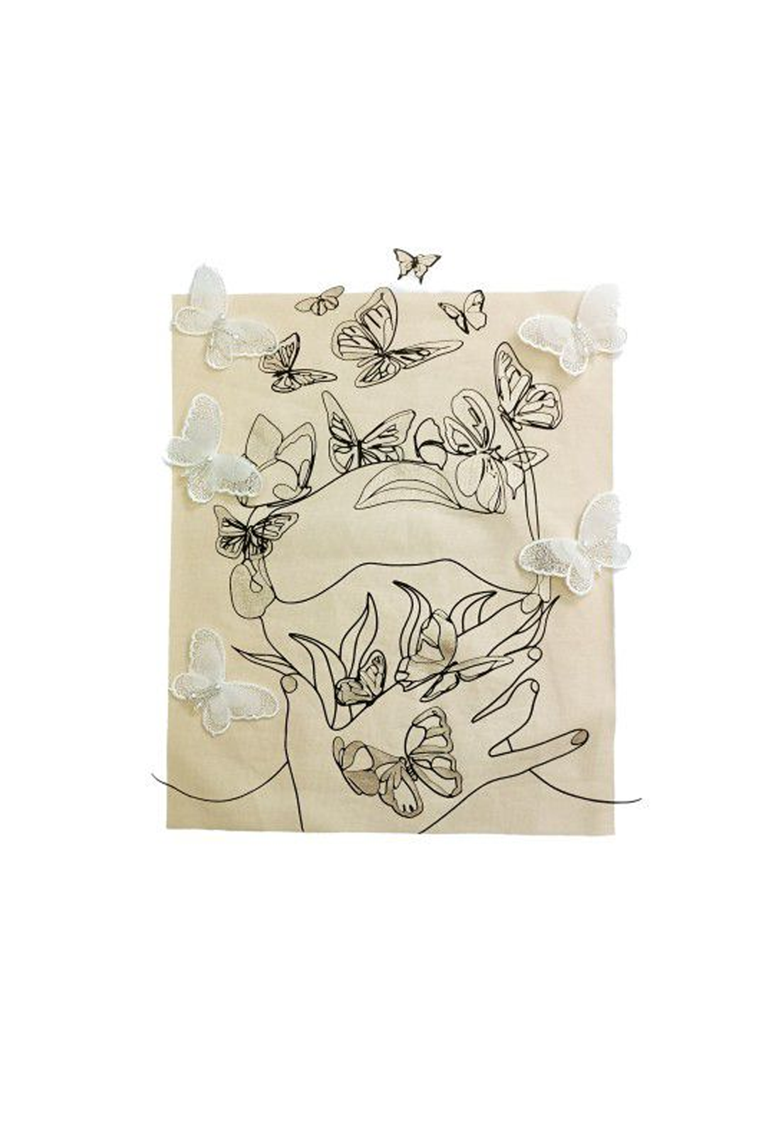 T-shirt de algodón color blanco con diseño de ilustración lineal sobre fondo beige con aplicaciones de mariposas en 3D.