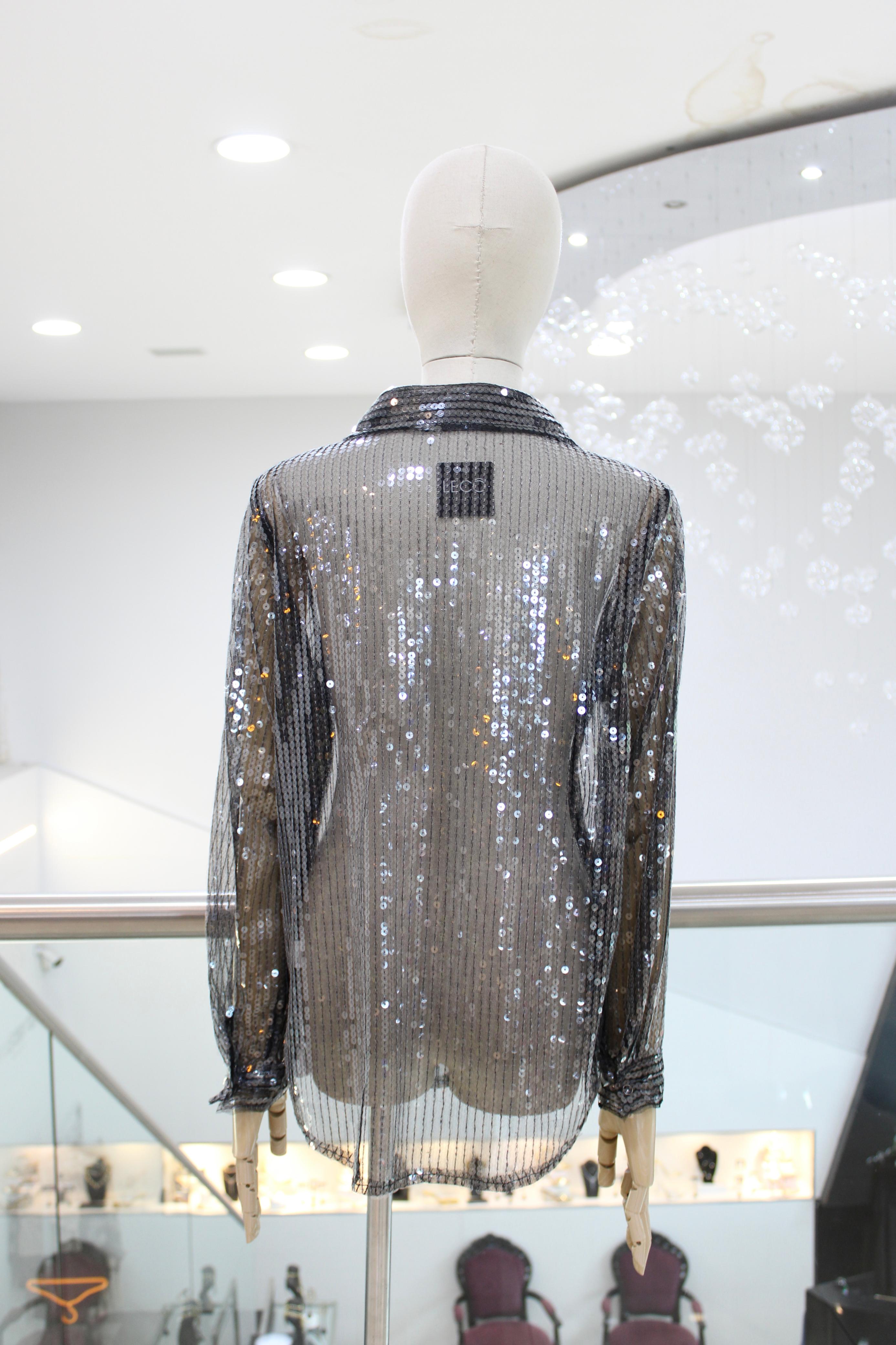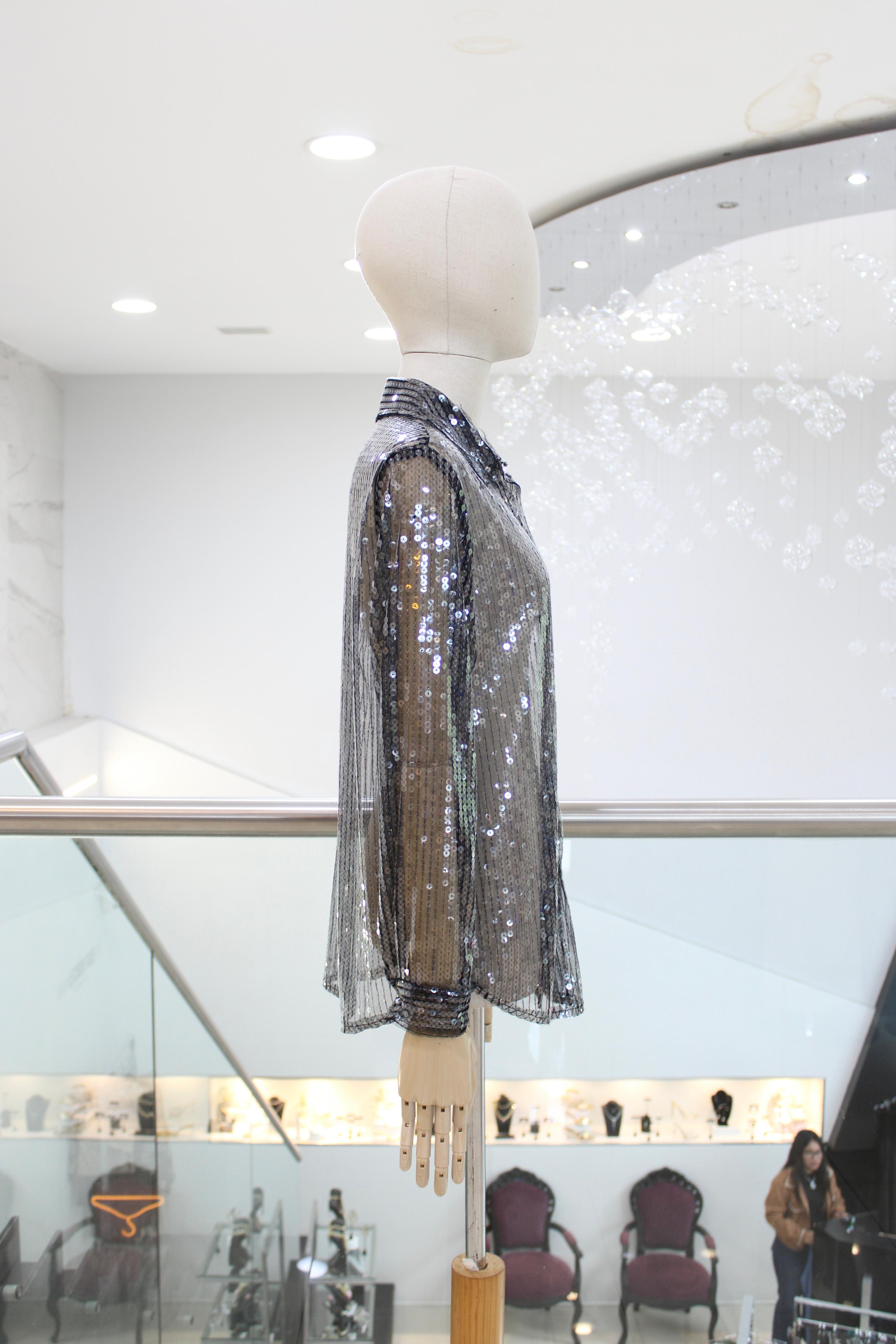 Camisa de manga larga con lentejuelas plata y transparencia.