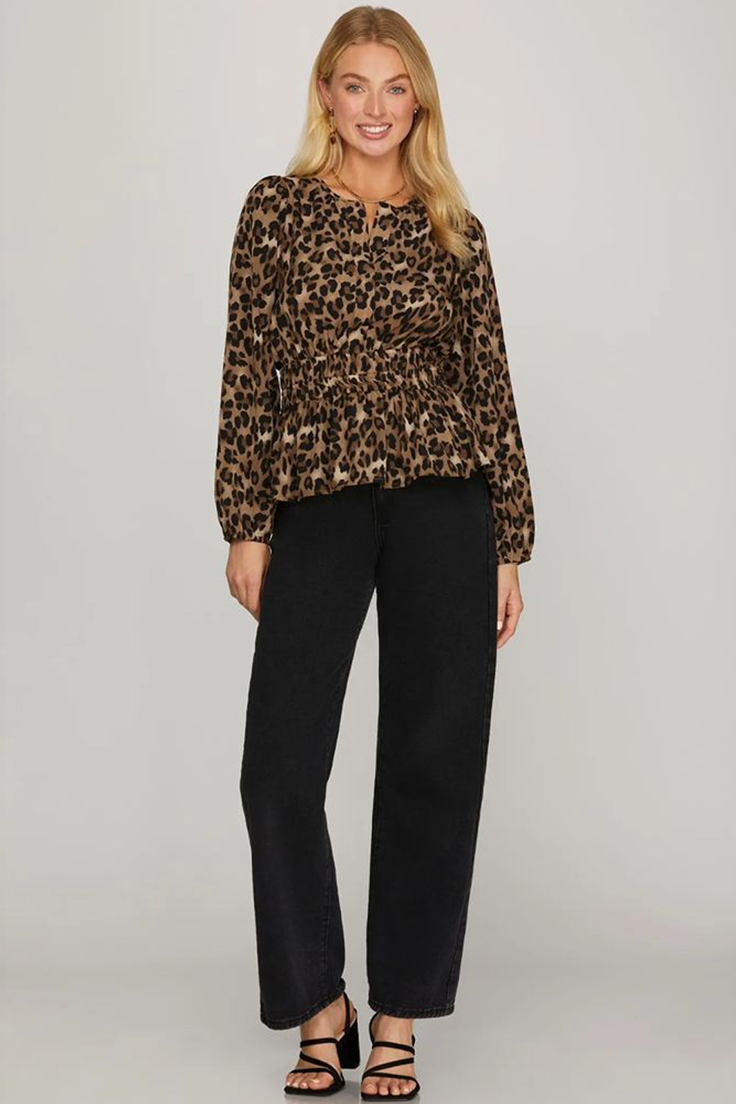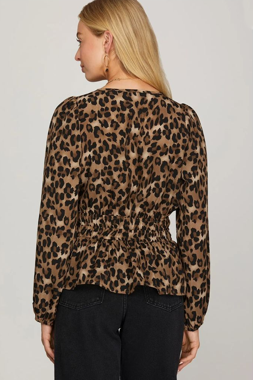 Blusa de manga larga de animal print con fruncido elástico en cintura y en terminación de manga.