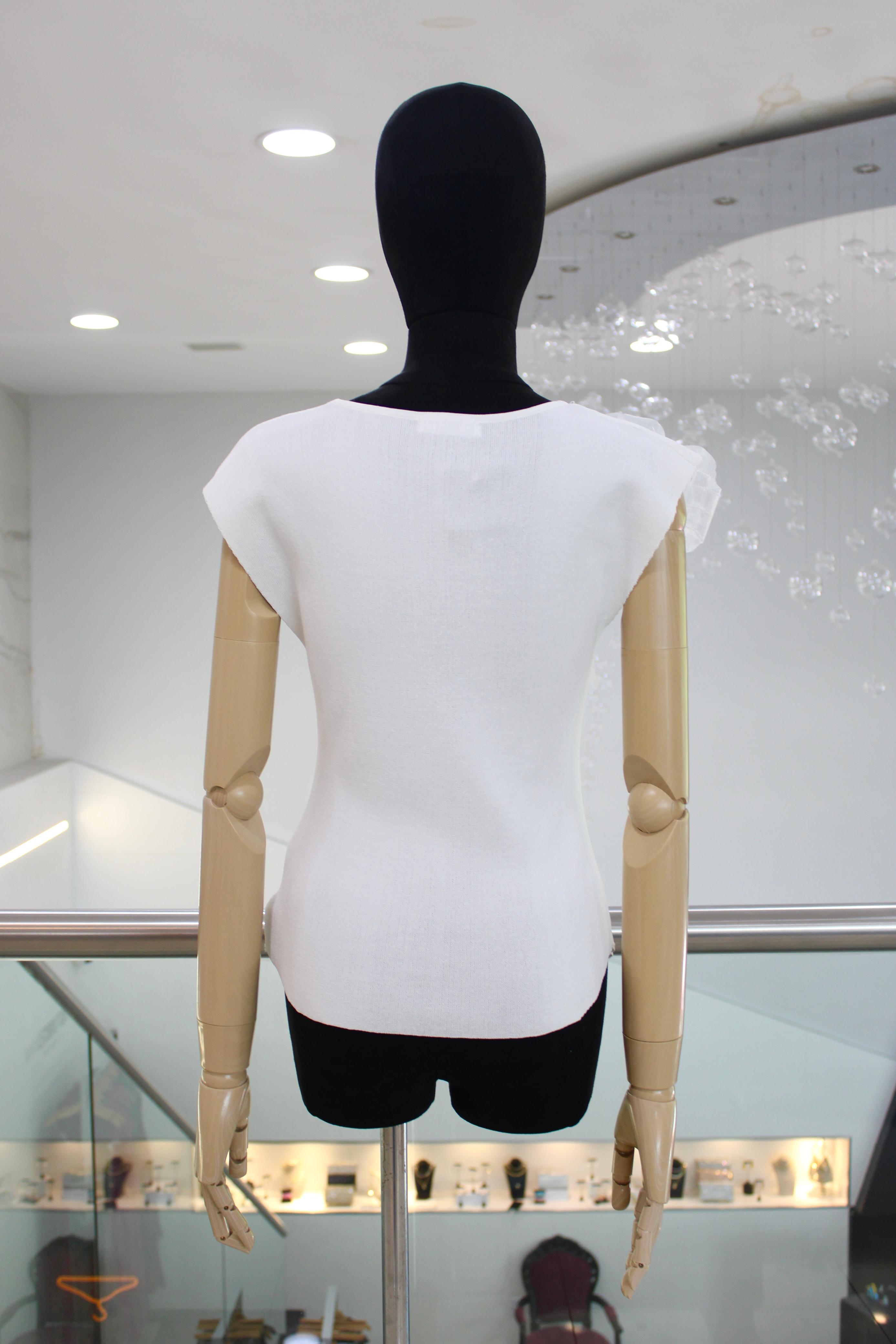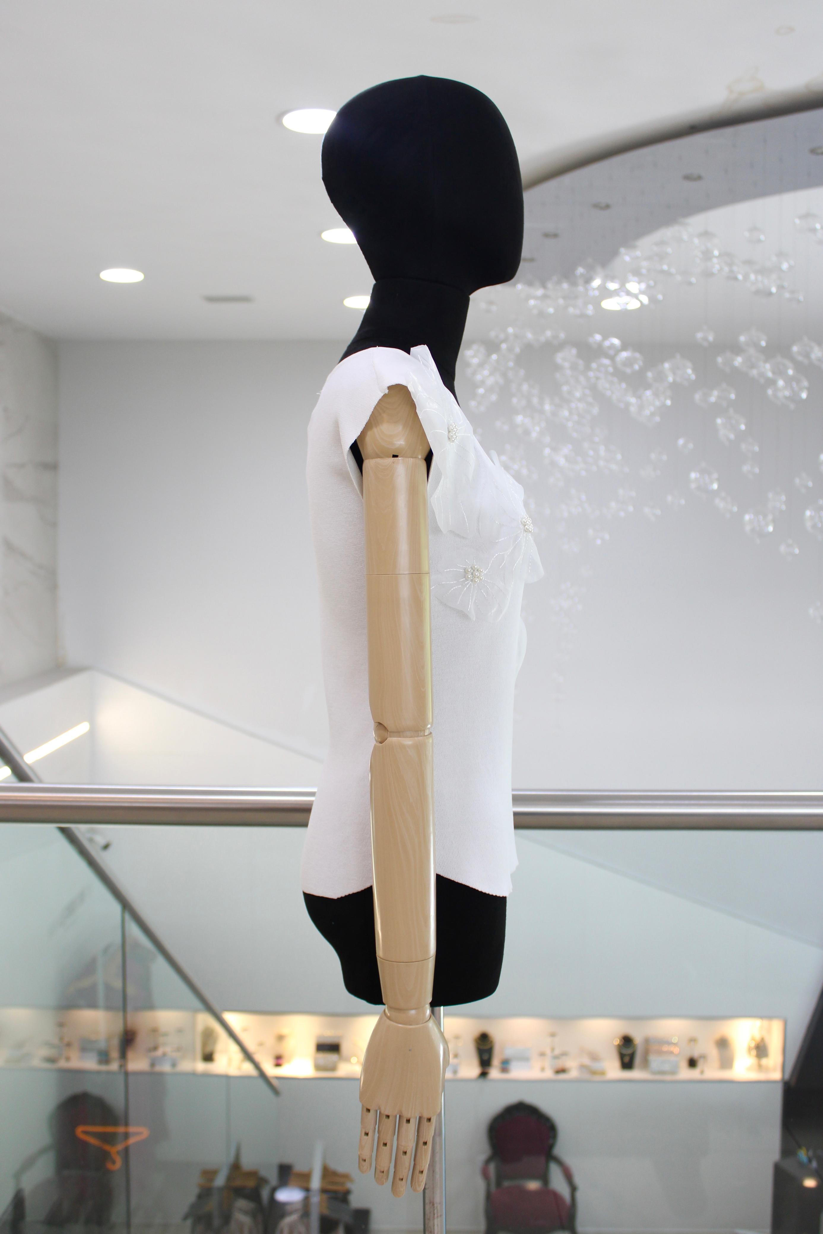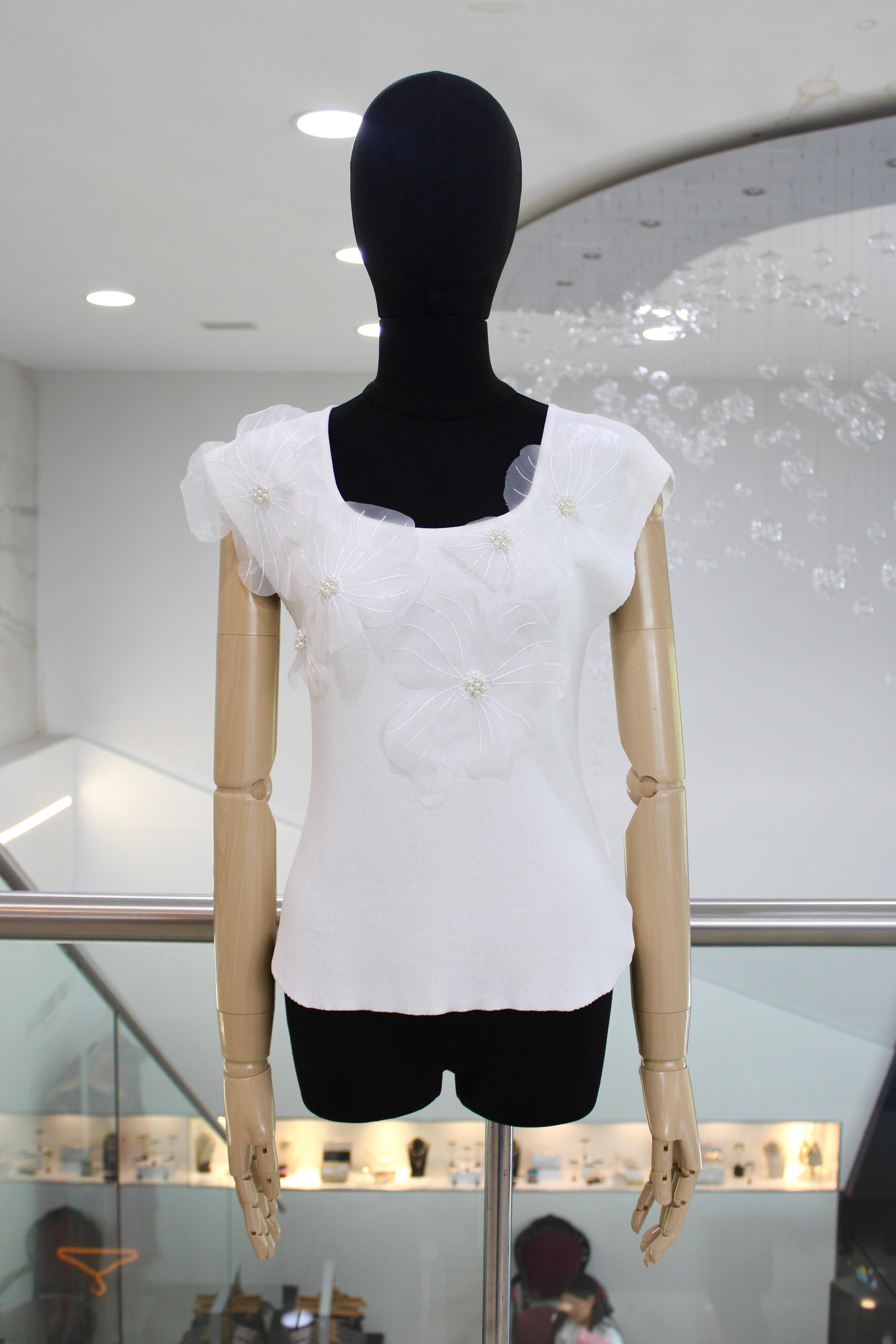 Blusa en suave tela blanca con spandex y aplicaciones de flores 3D de organza con perlas.