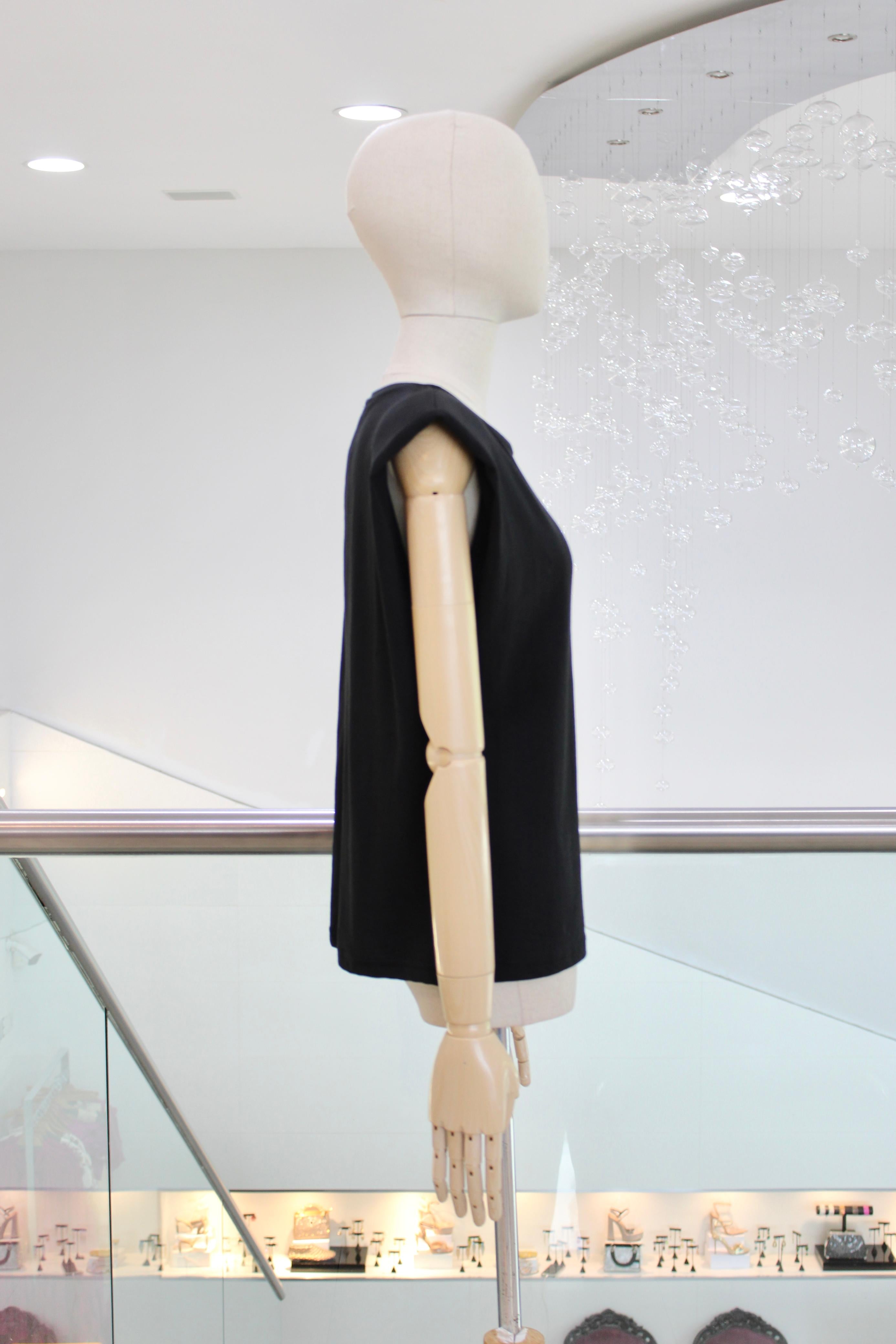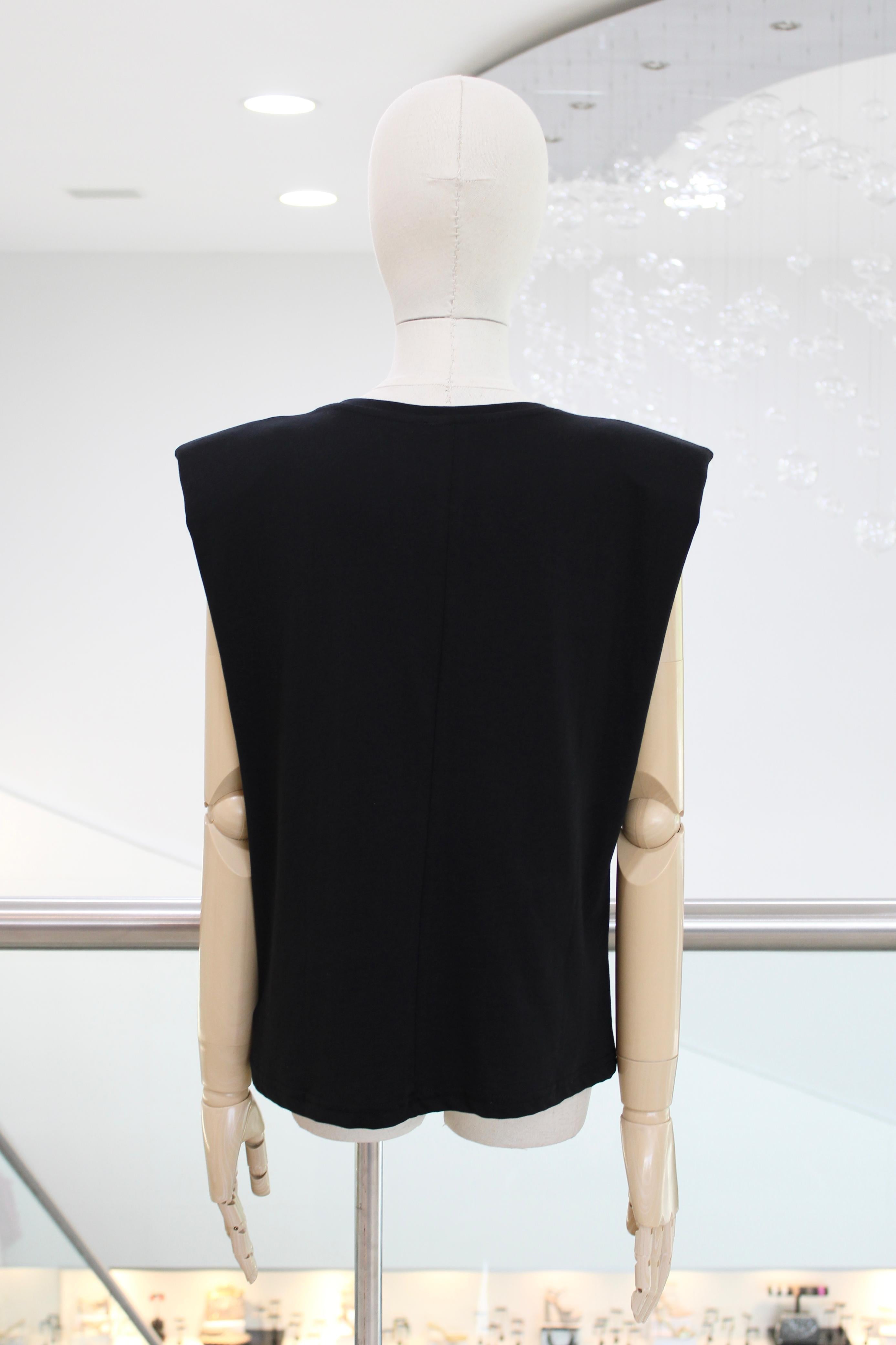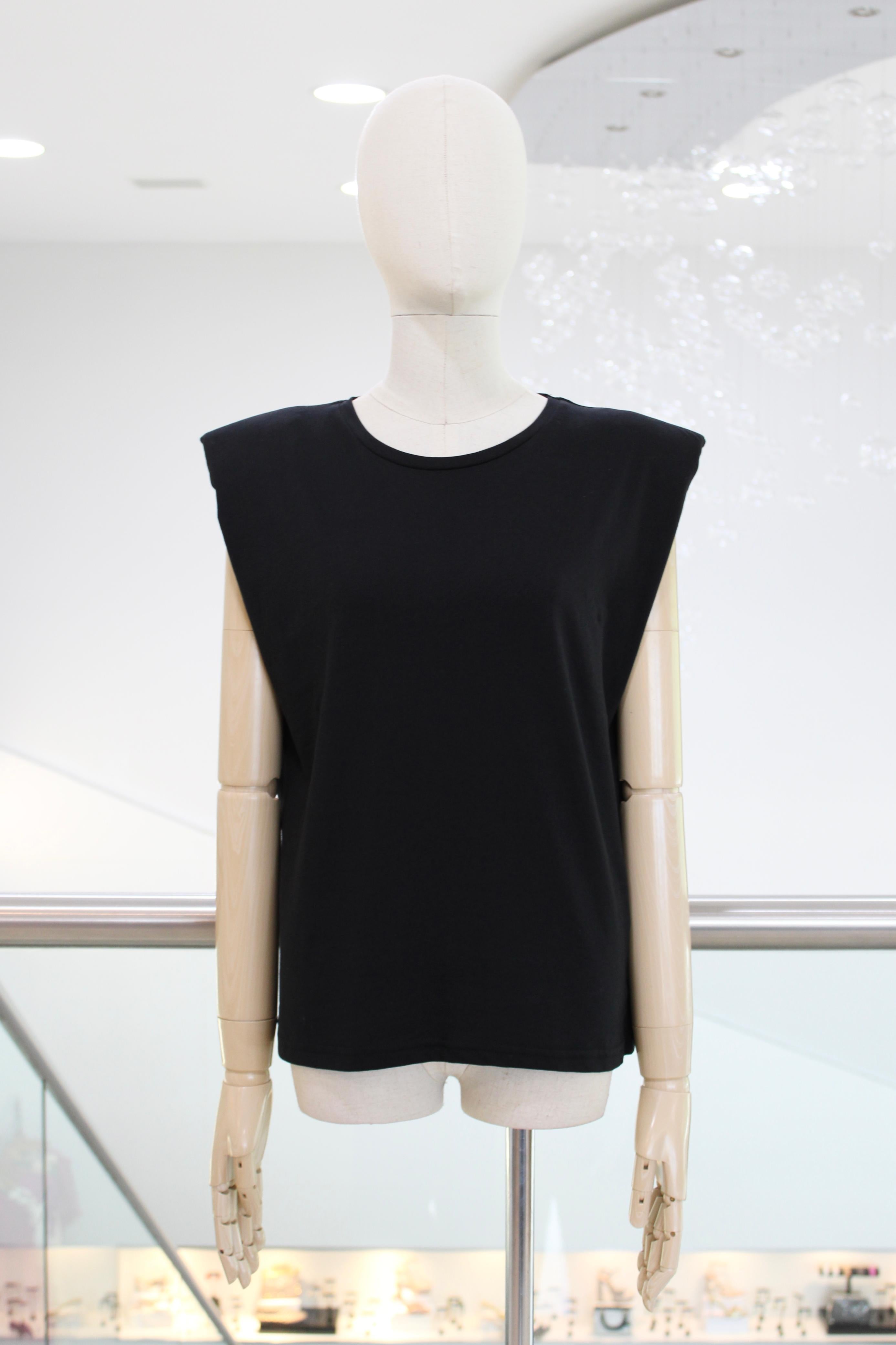 Blusa sin mangas de algodón color negro, escote redondo con hombreras integradas.