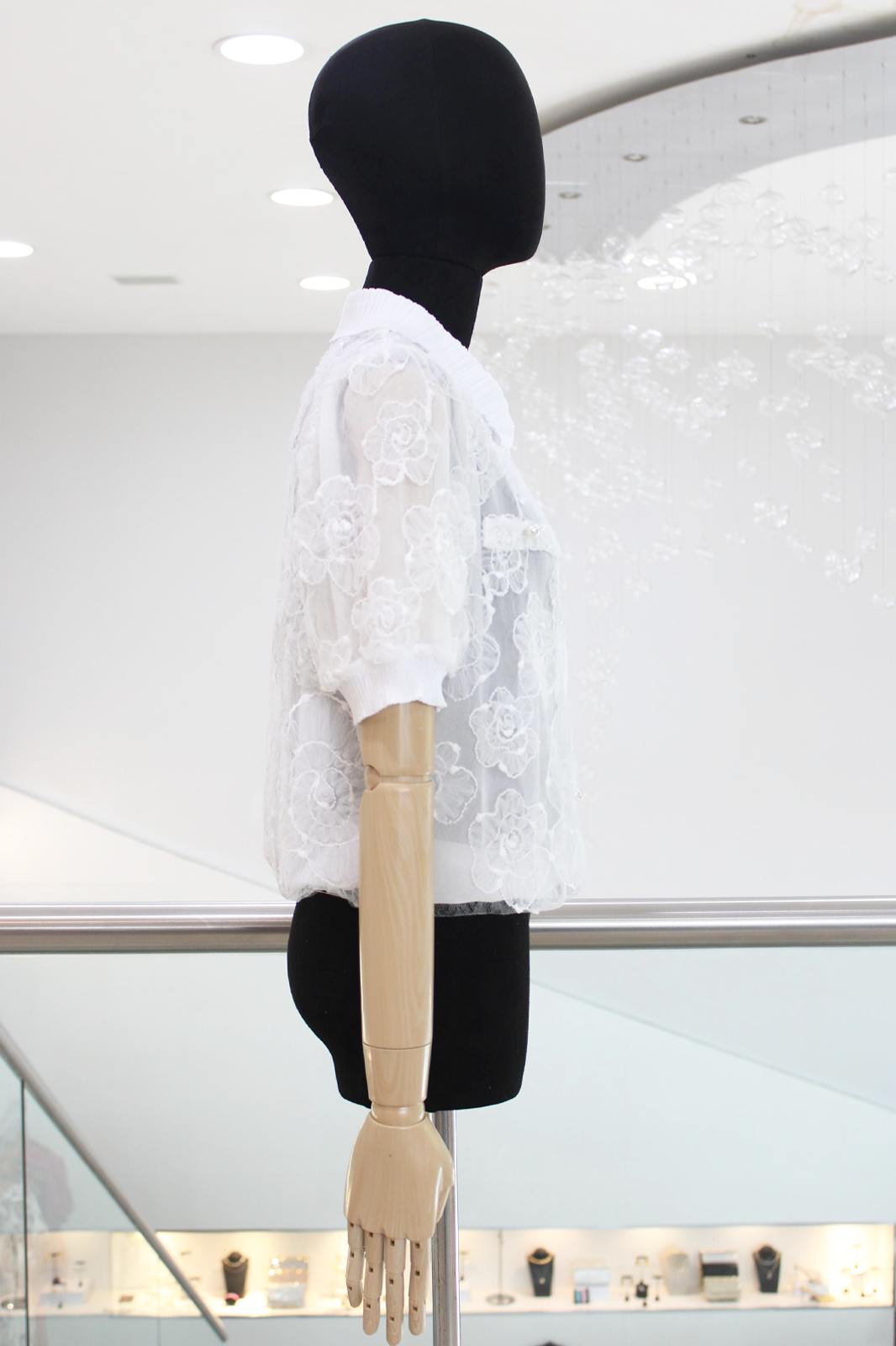 Blusa camisera de tul blanca con flores bordadas y botones de perlas, terminación en elástico y en mangas.