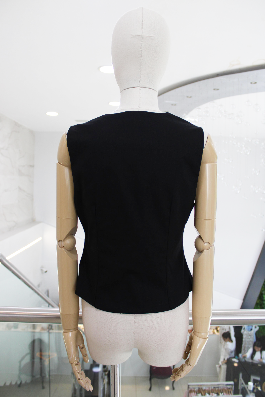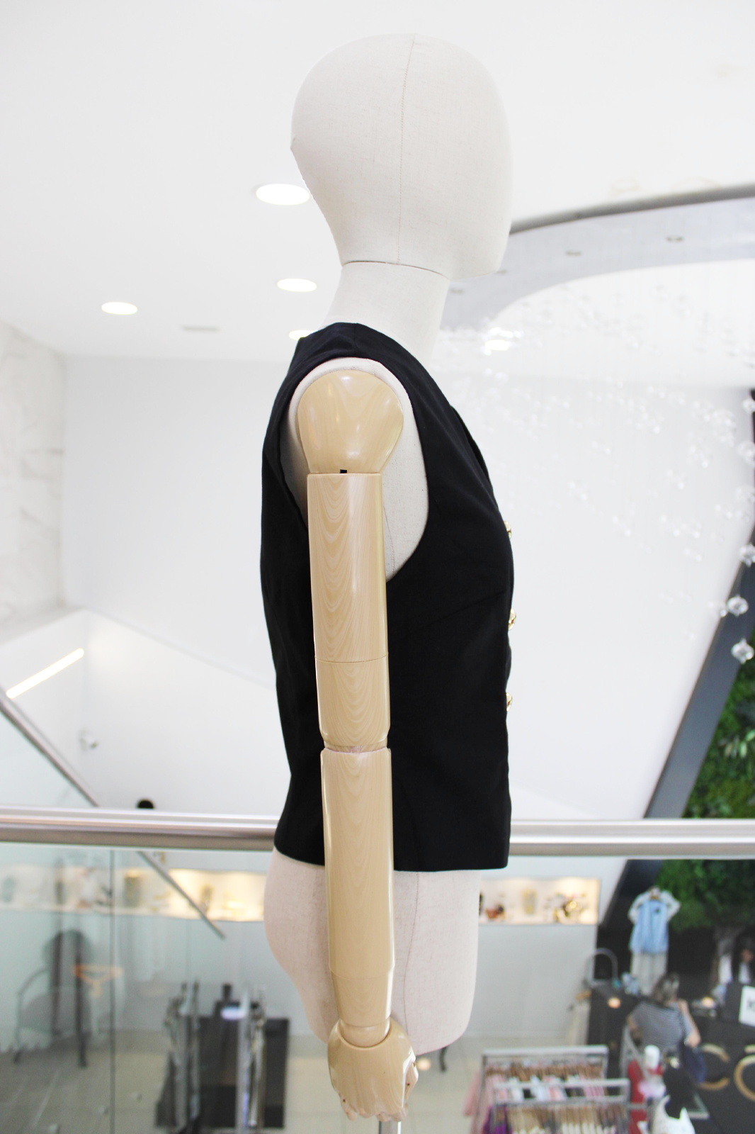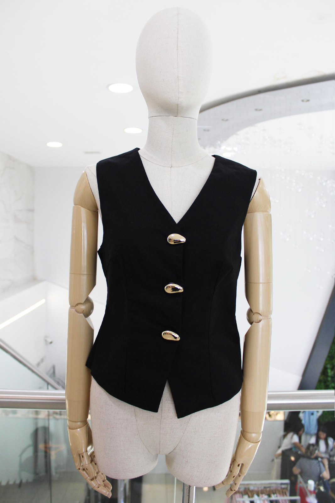 Chaleco negro sin mangas, con botones de forma abstracta color dorados