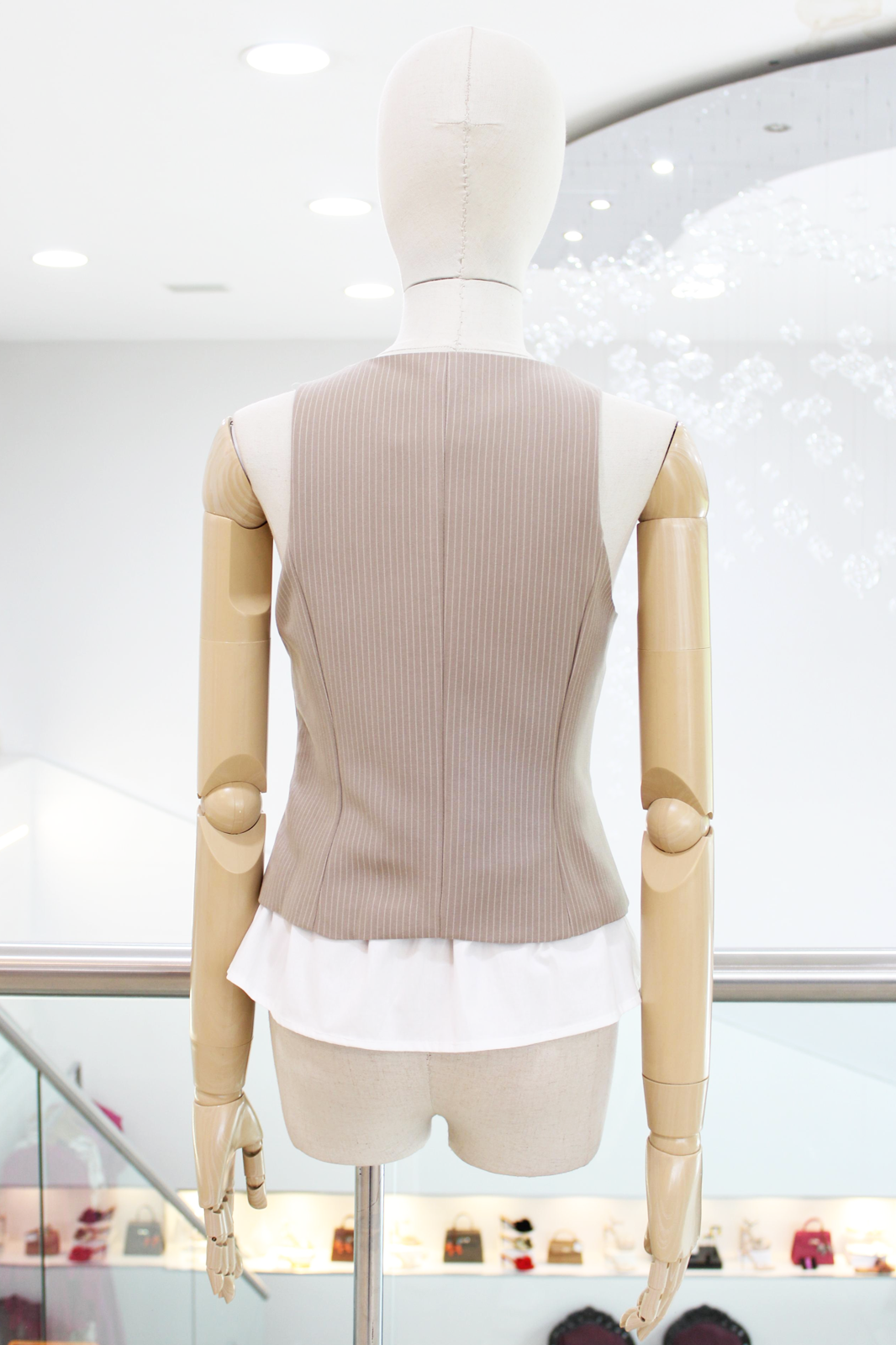 Chaleco sisado beige con rayas blancas, cuello en V y botones aperlados, en parte superior tiene terminación de camisa blanca.