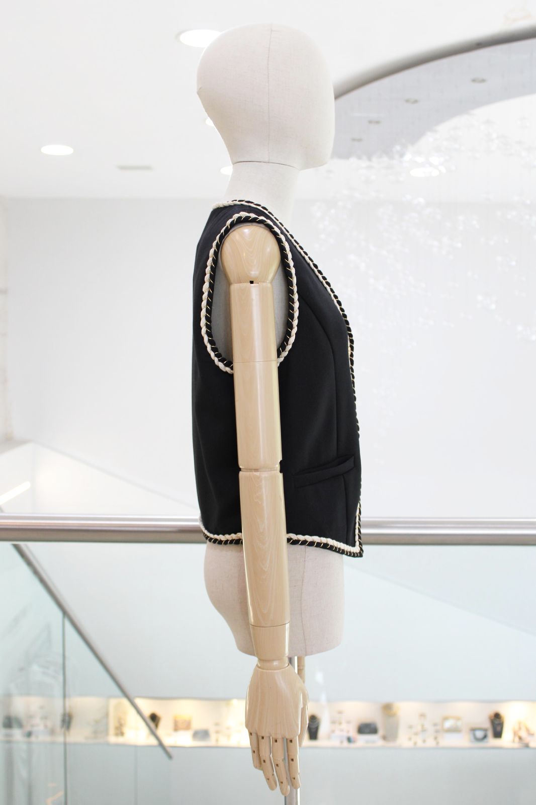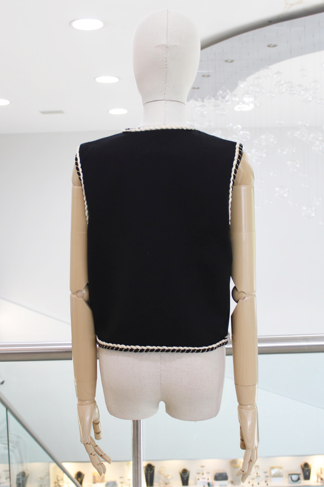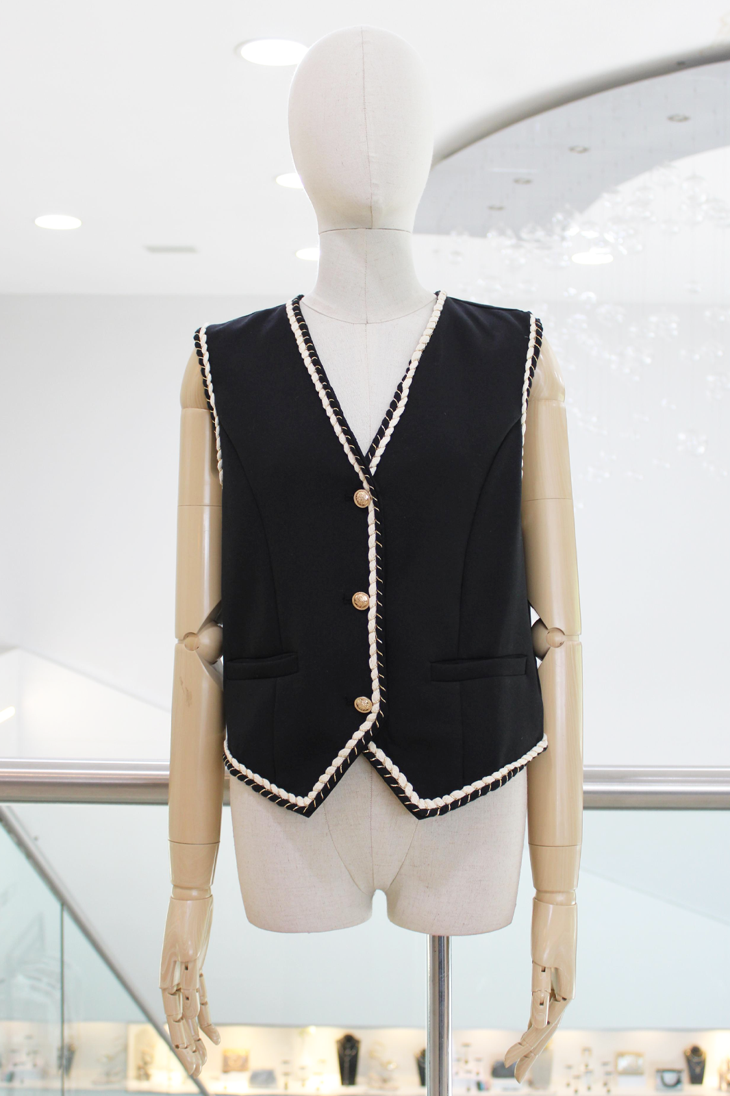 Chaleco sisado negro con tira bordada blanca en el contorno y botones dorados.