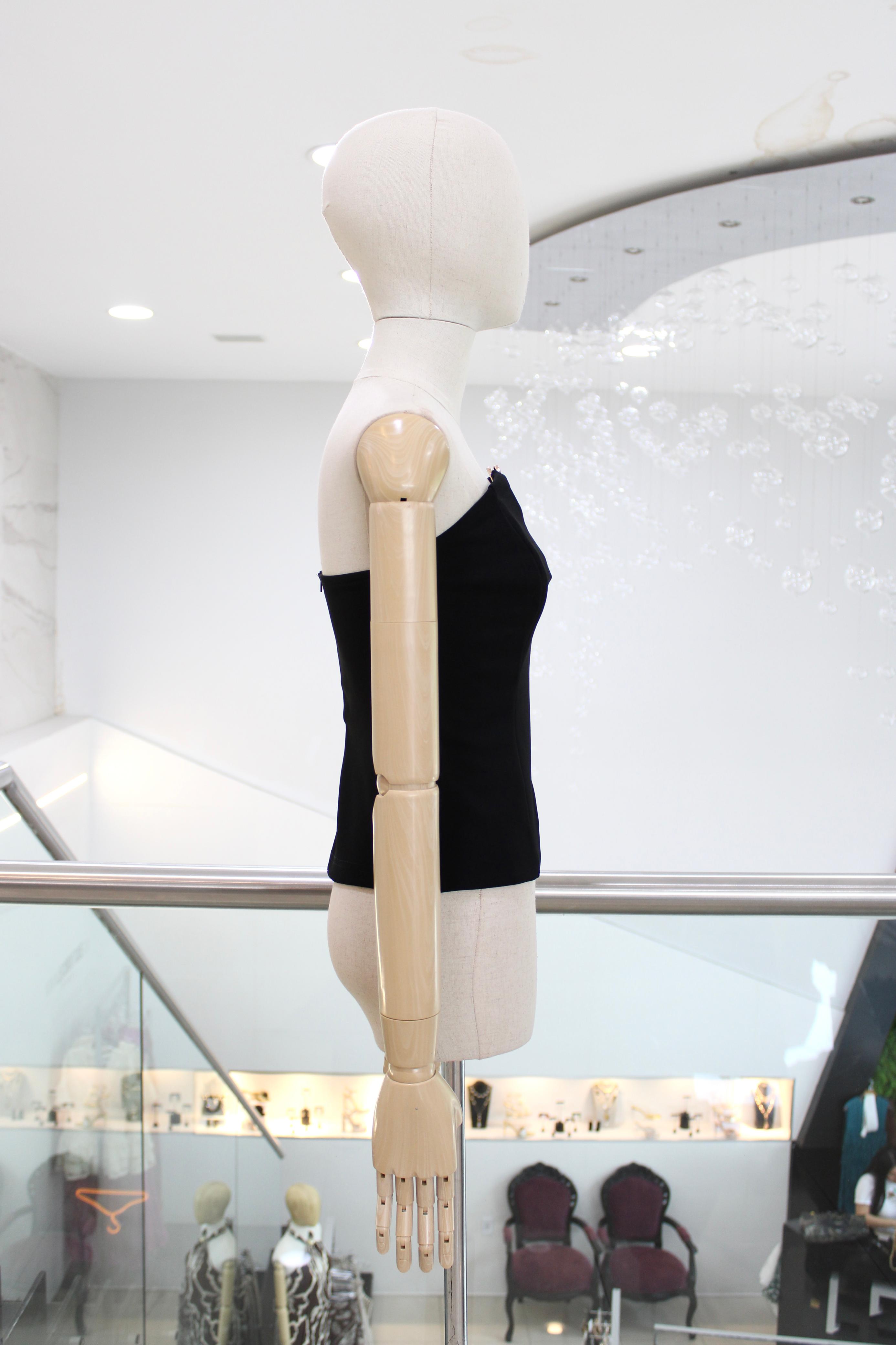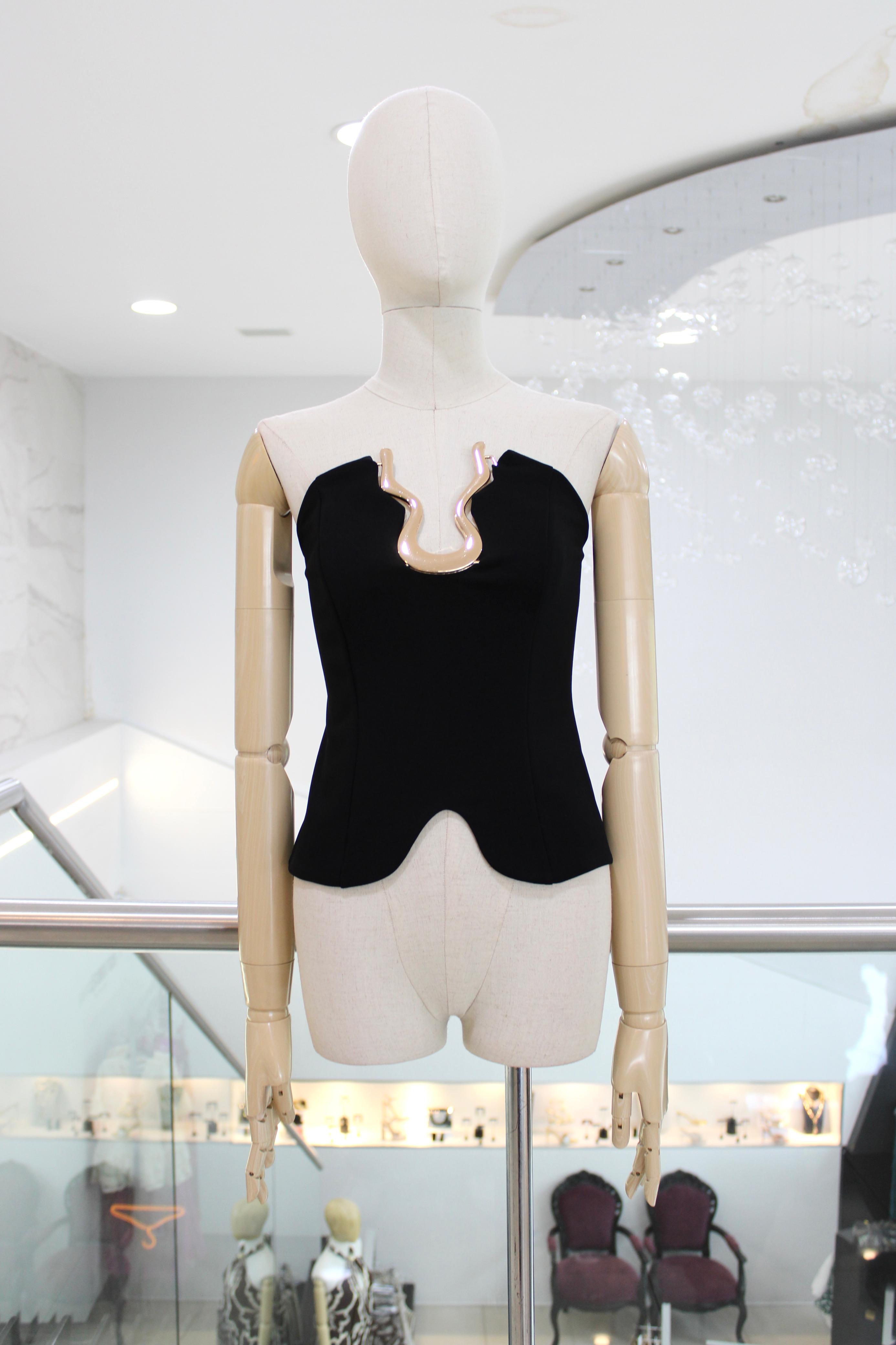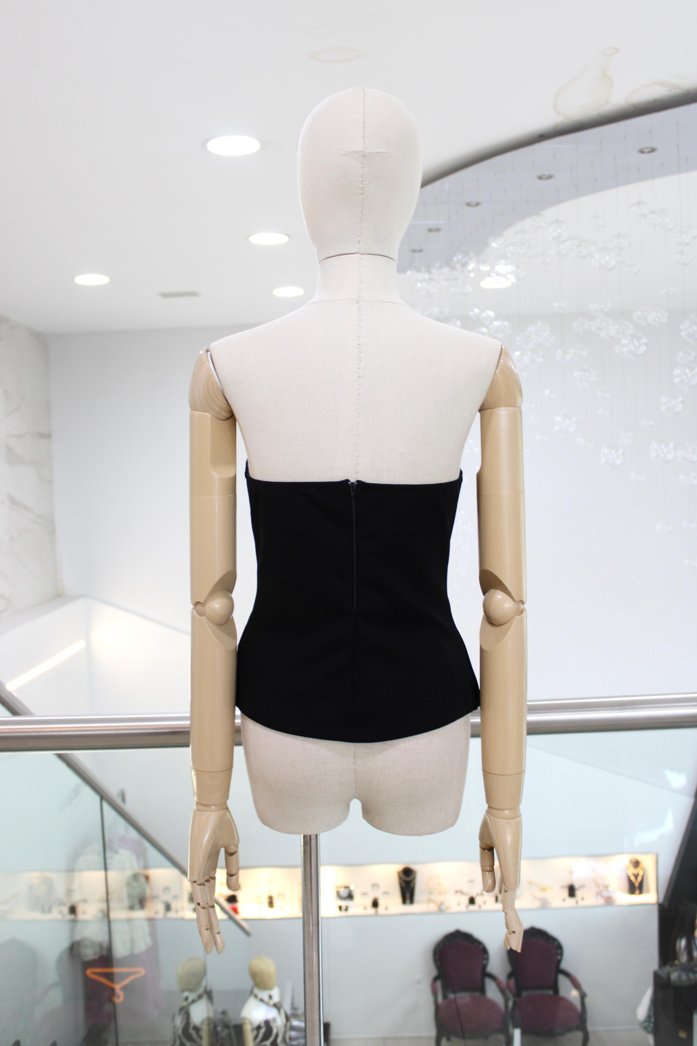 Top strapless negro con escote curvado decorado con ornamento metálico dorado.