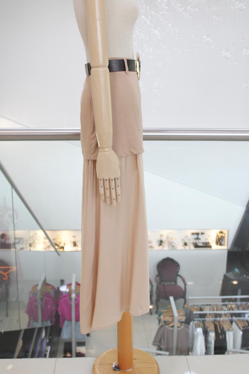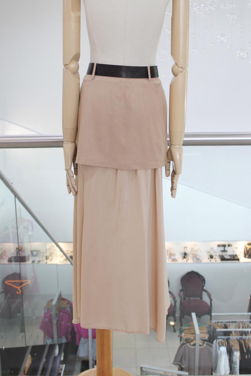 Falda larga beige con apertura en pierna y sobrefalda en el mismo tono, te incluye un cinturón café con hebilla dorada.
