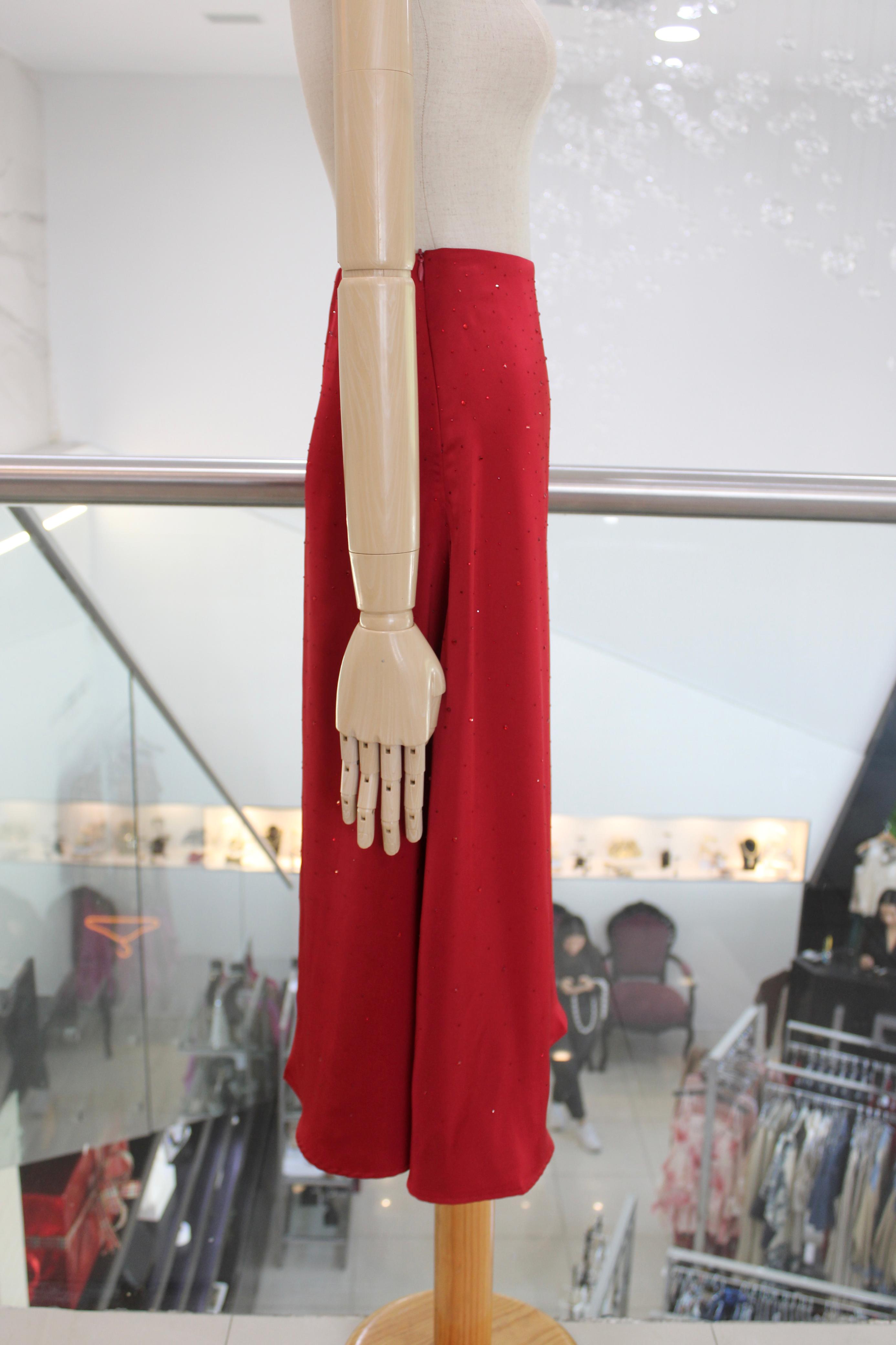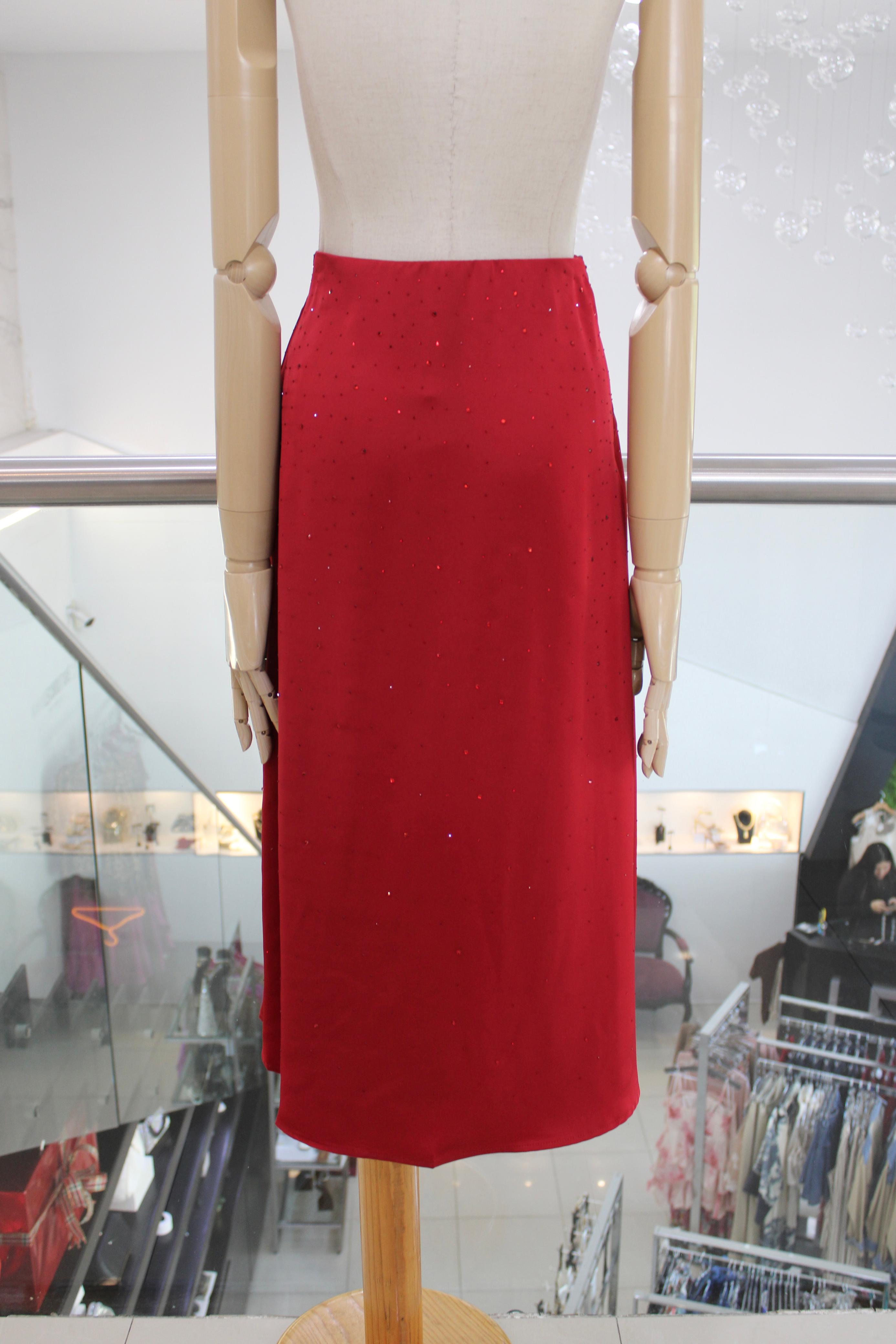 Falda midi en satín rojo con brillos en el mismo tono.