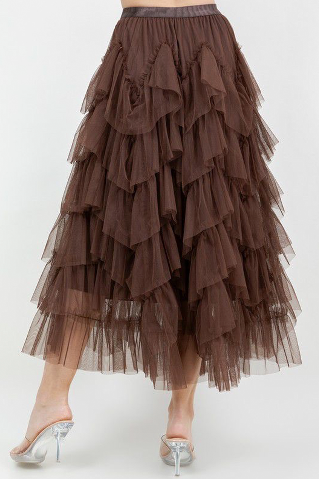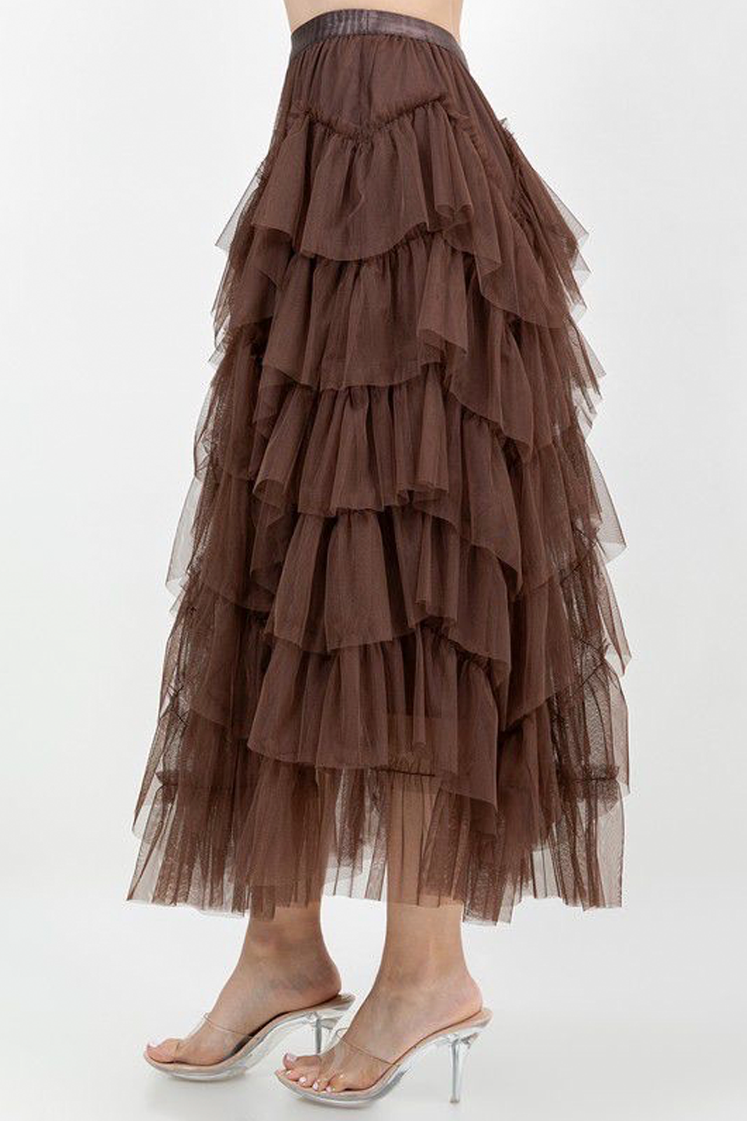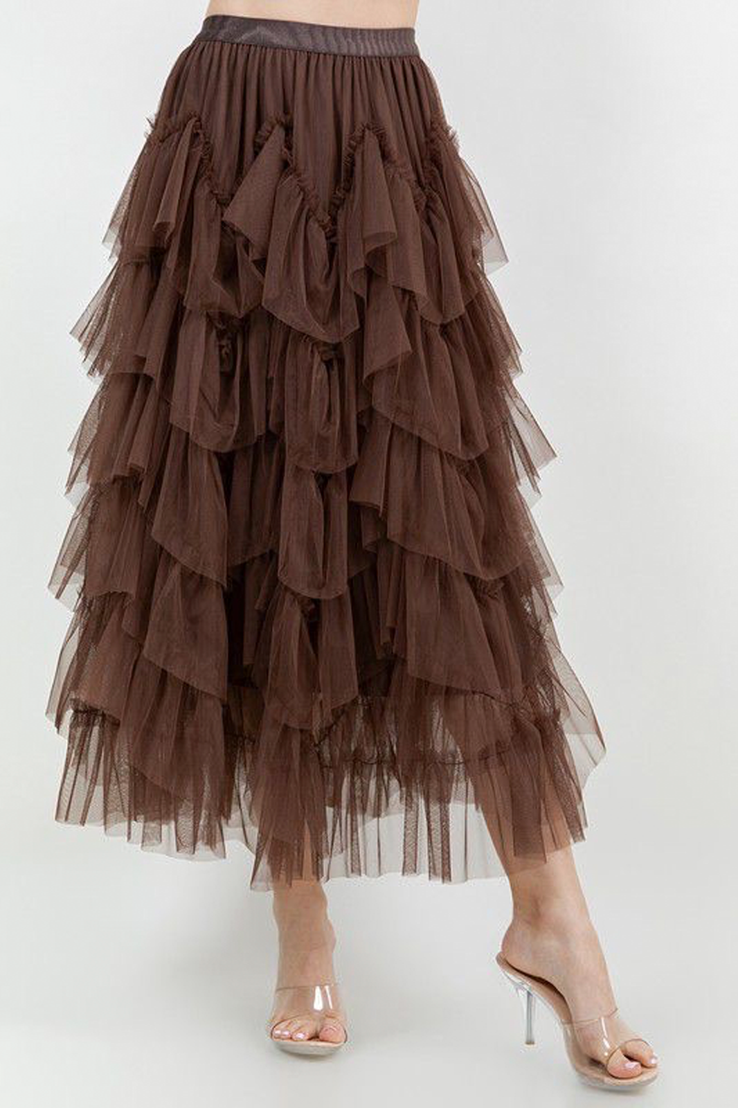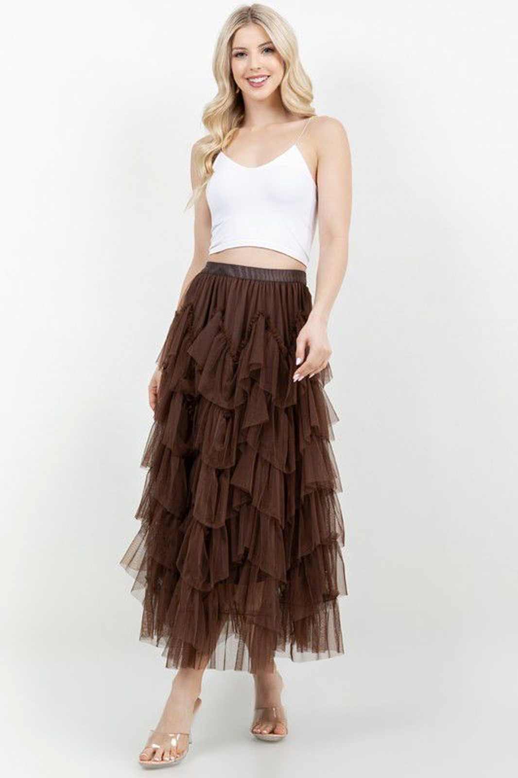 Falda midi en tul café de corte A, cintura elástica y detalle de plisado al inicio y terminación con volantes, viene con forro.