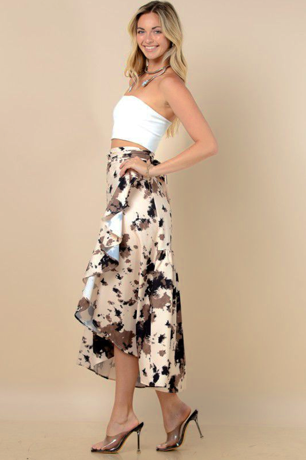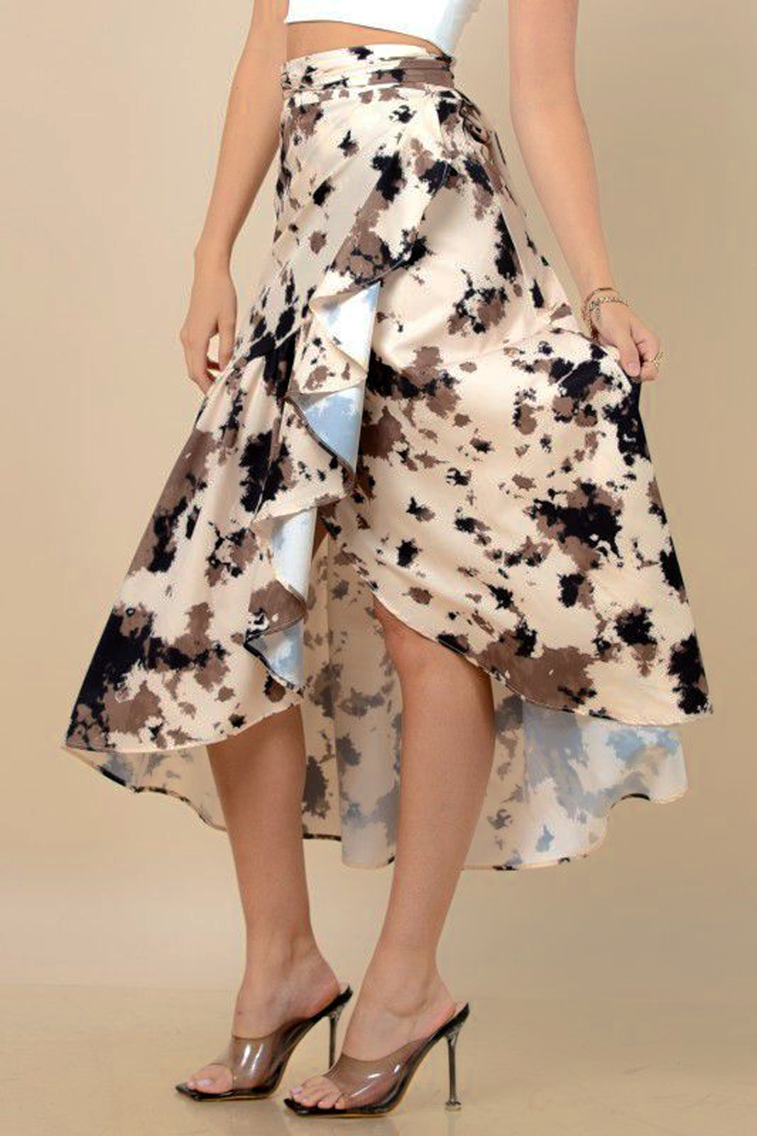 Falda midi en suave tela beige con animal print en tonos café y negro, corte asimétrico en capas