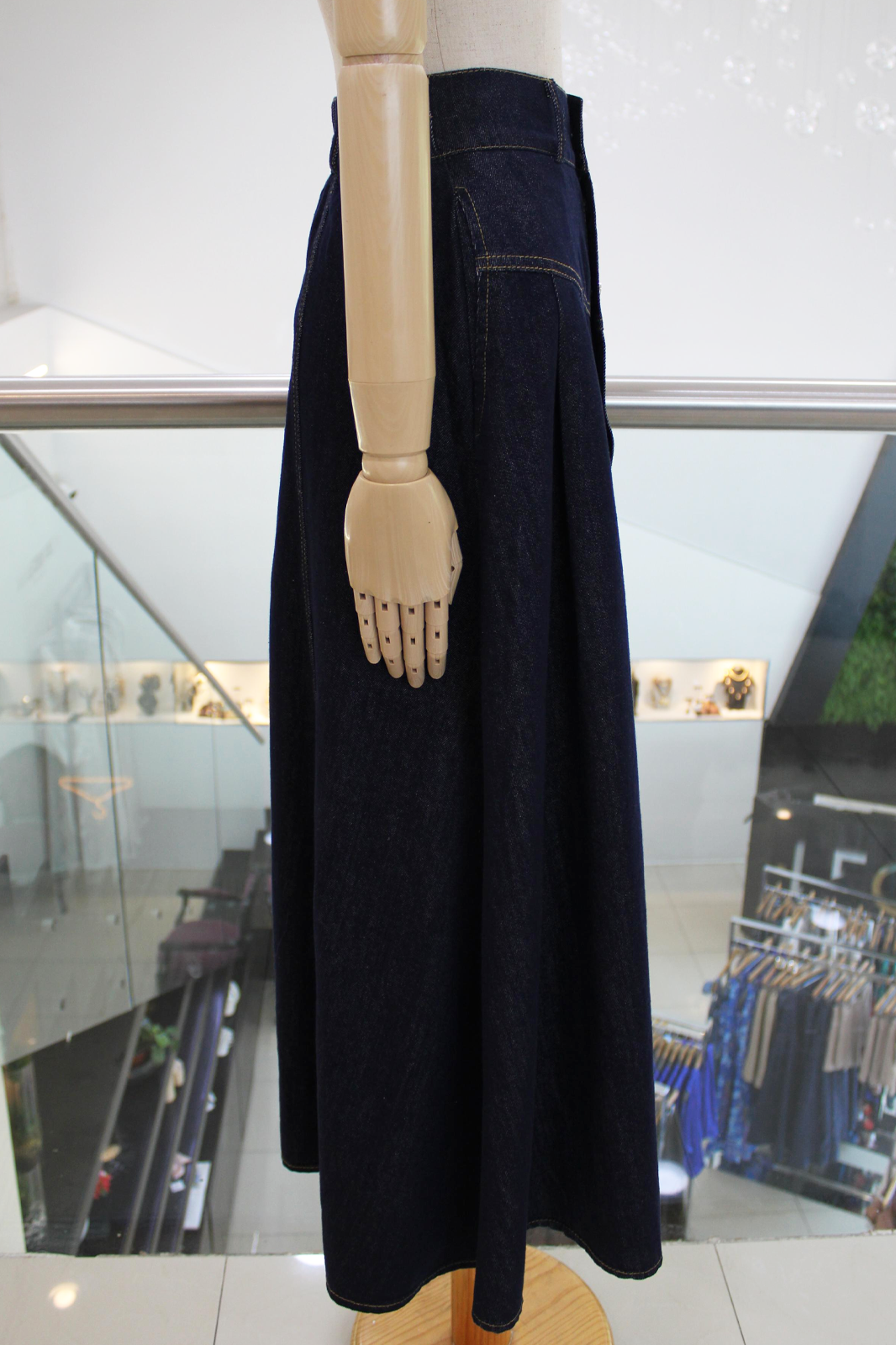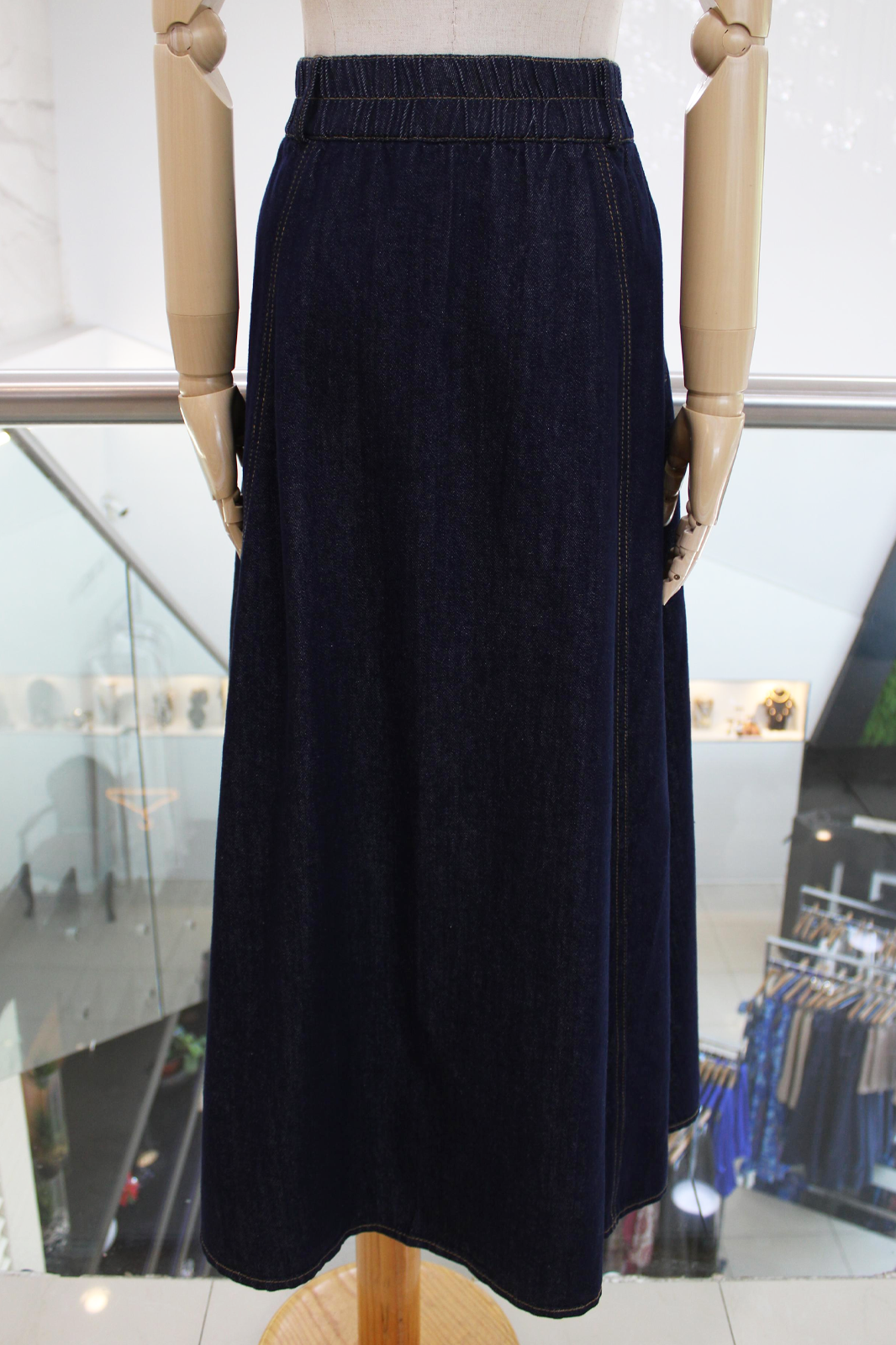 Falda midi denim azul oscuro con botones metálicos al frente.