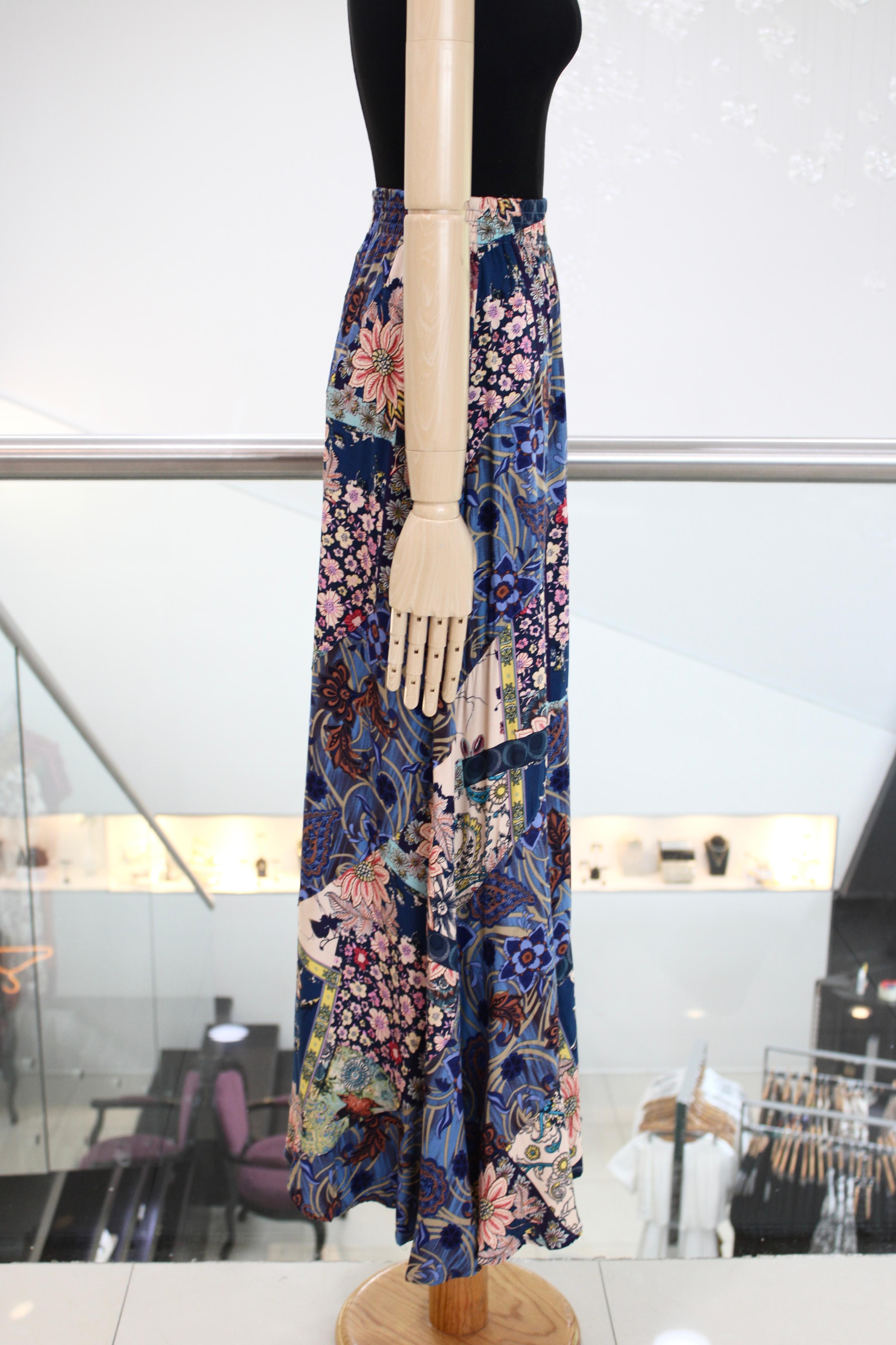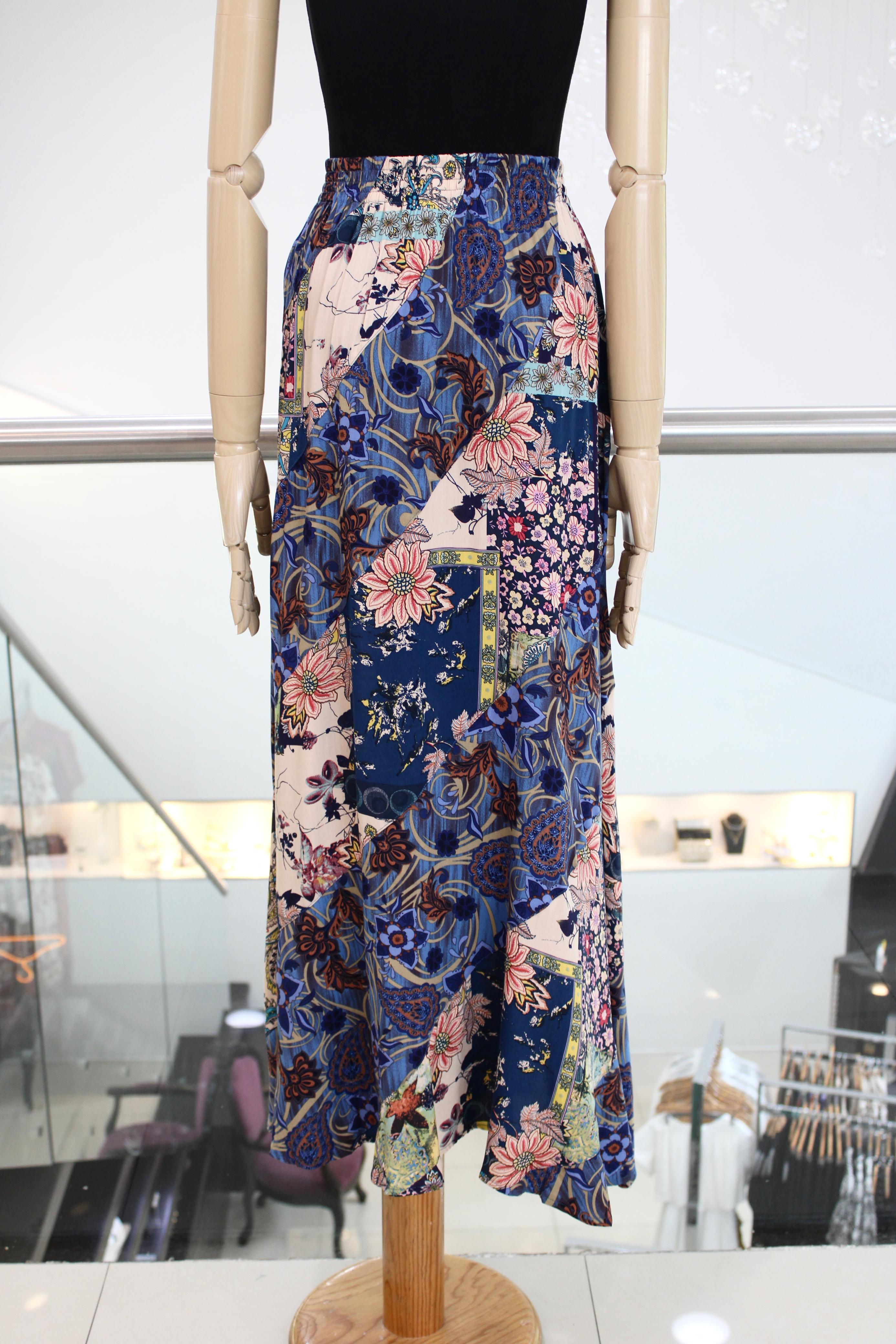 Falda midi en tela fluida azul oscuro con estampado floral en tonos rojos, azules y beige, con pretina elástica.